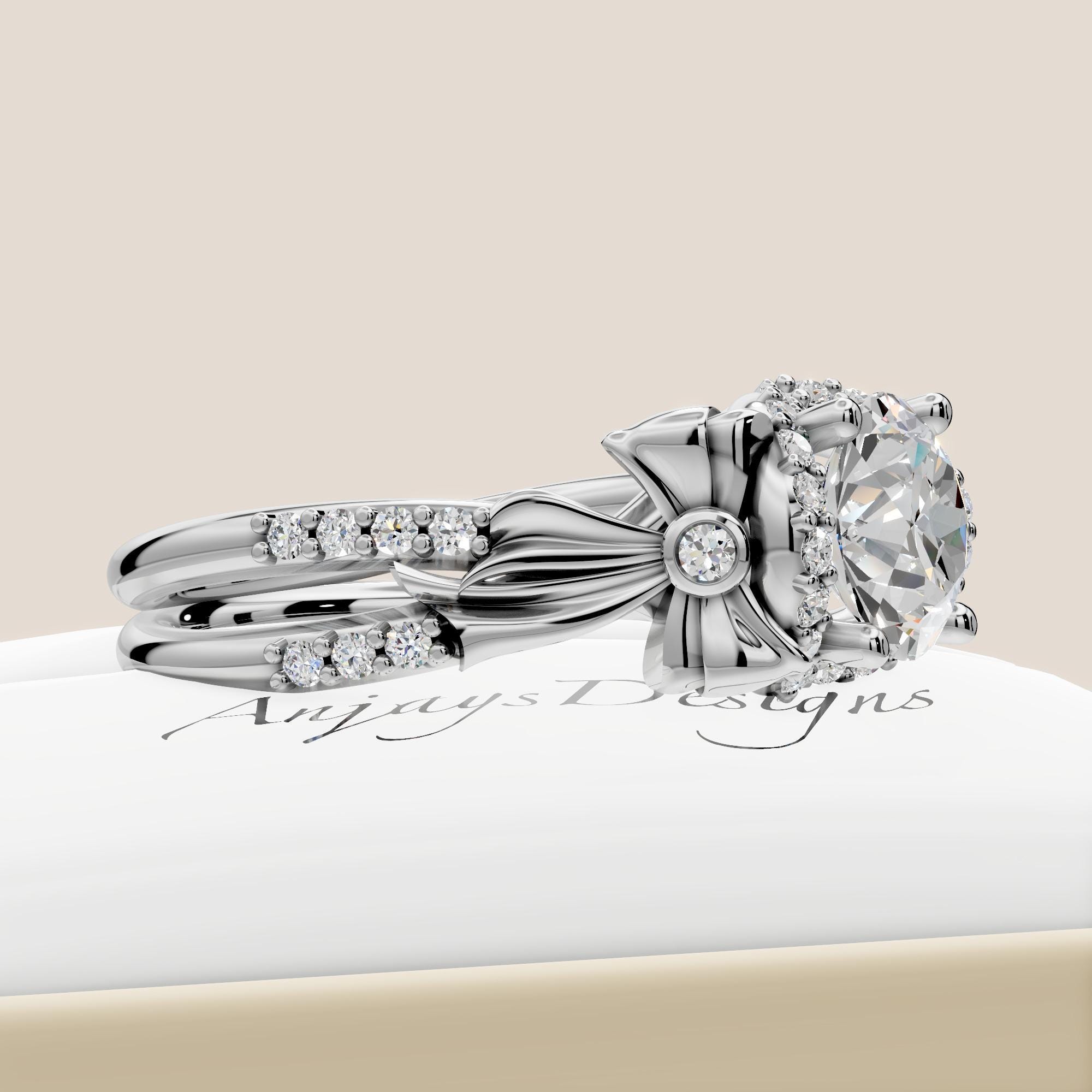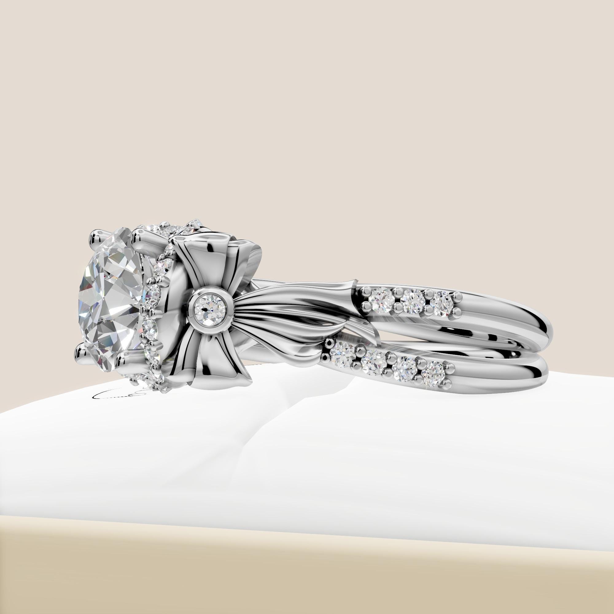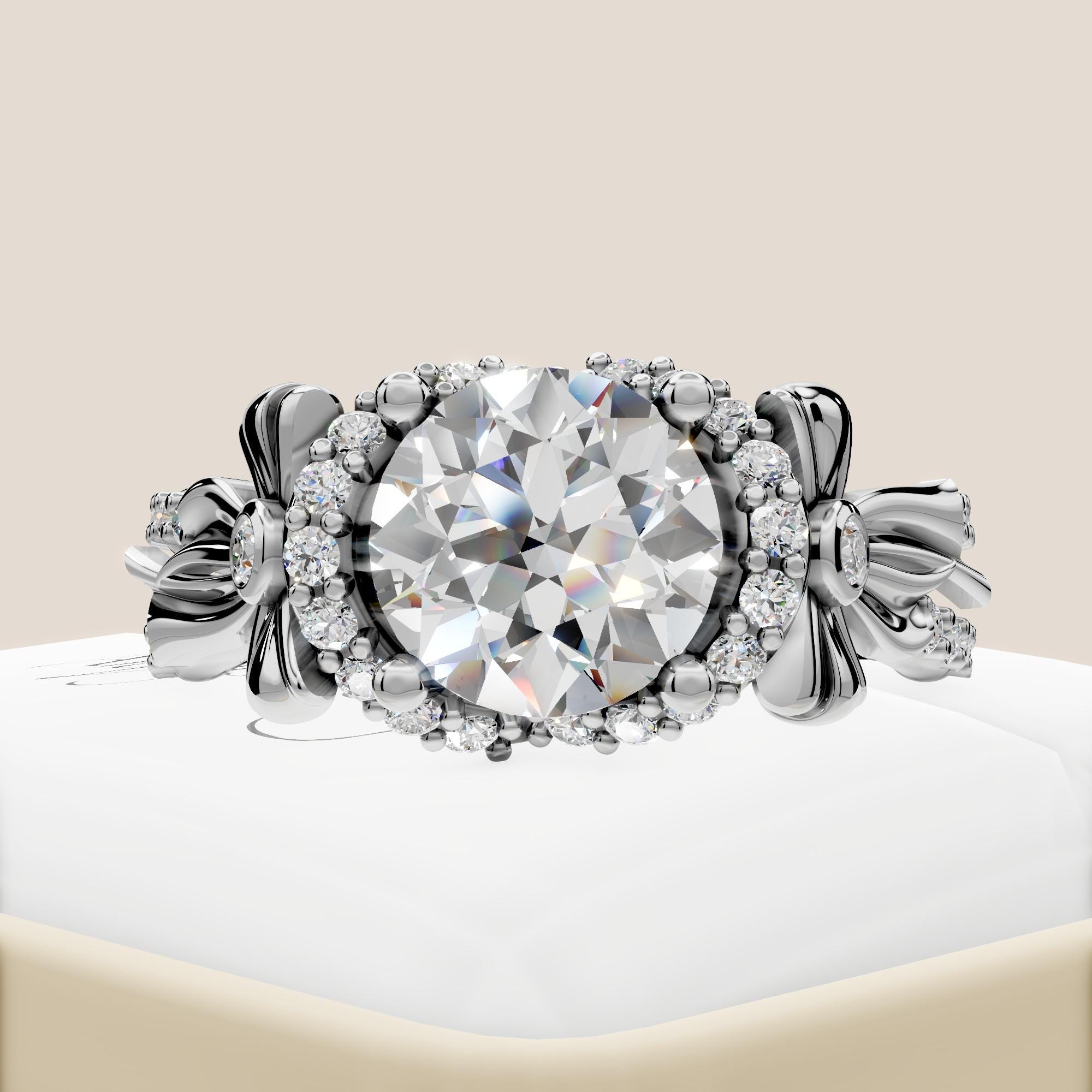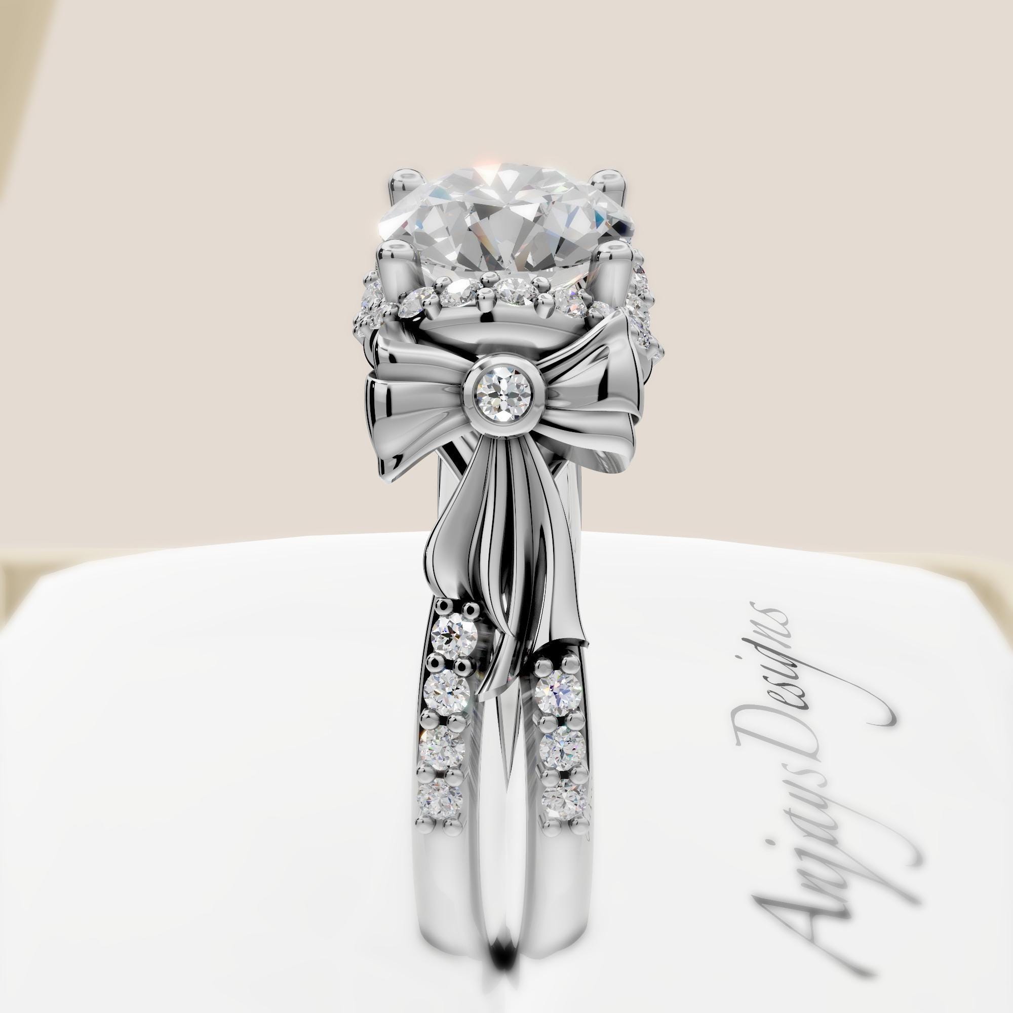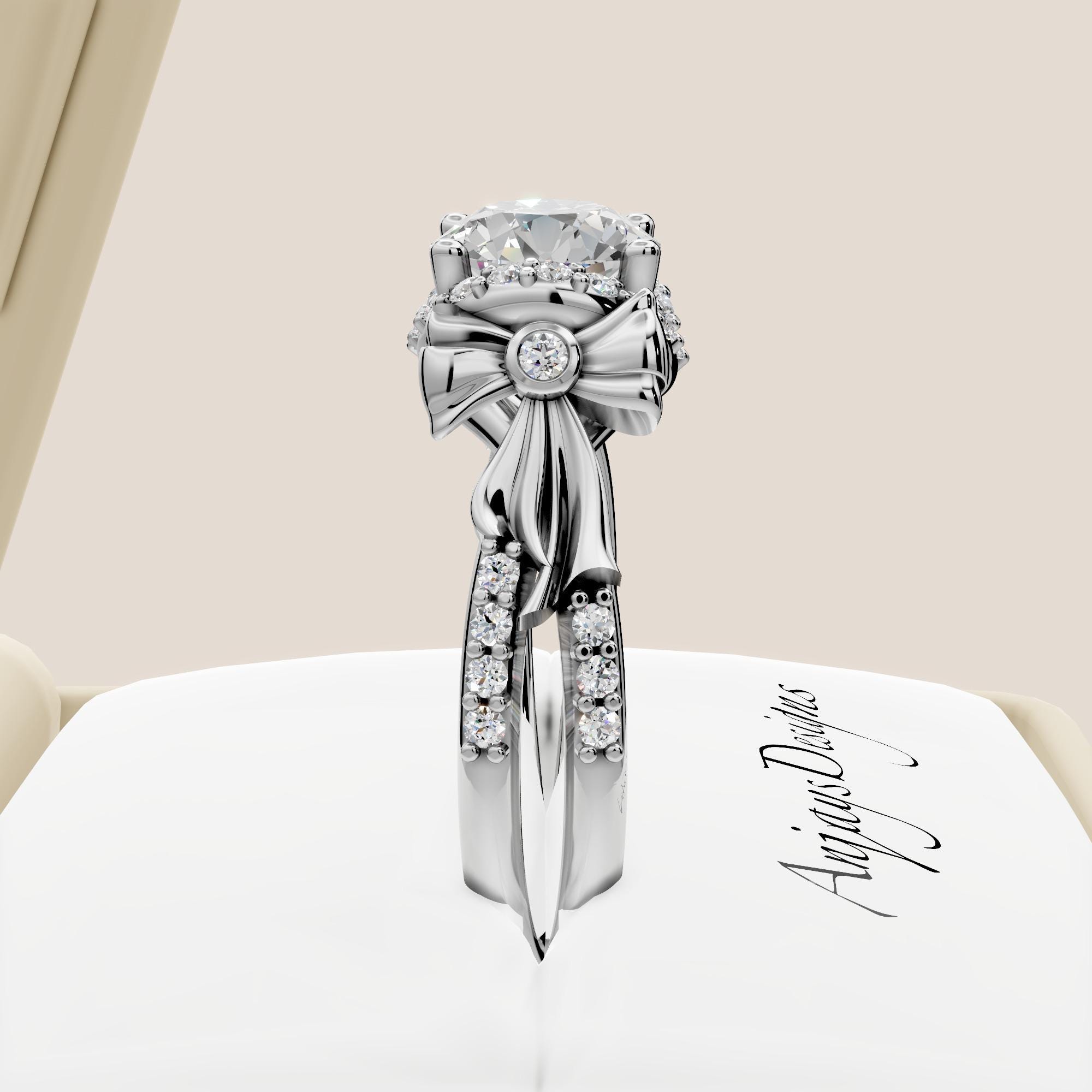 Propose your love with a bow tie ring as unique and beautiful as your lover! This stunning 1ct diamond engagement ring features a beautiful bow tie design on each side of the lab-grown round-cut diamond center stone. Made in 14k white gold, this diamond bow engagement ring blends timelessness and uniqueness together!