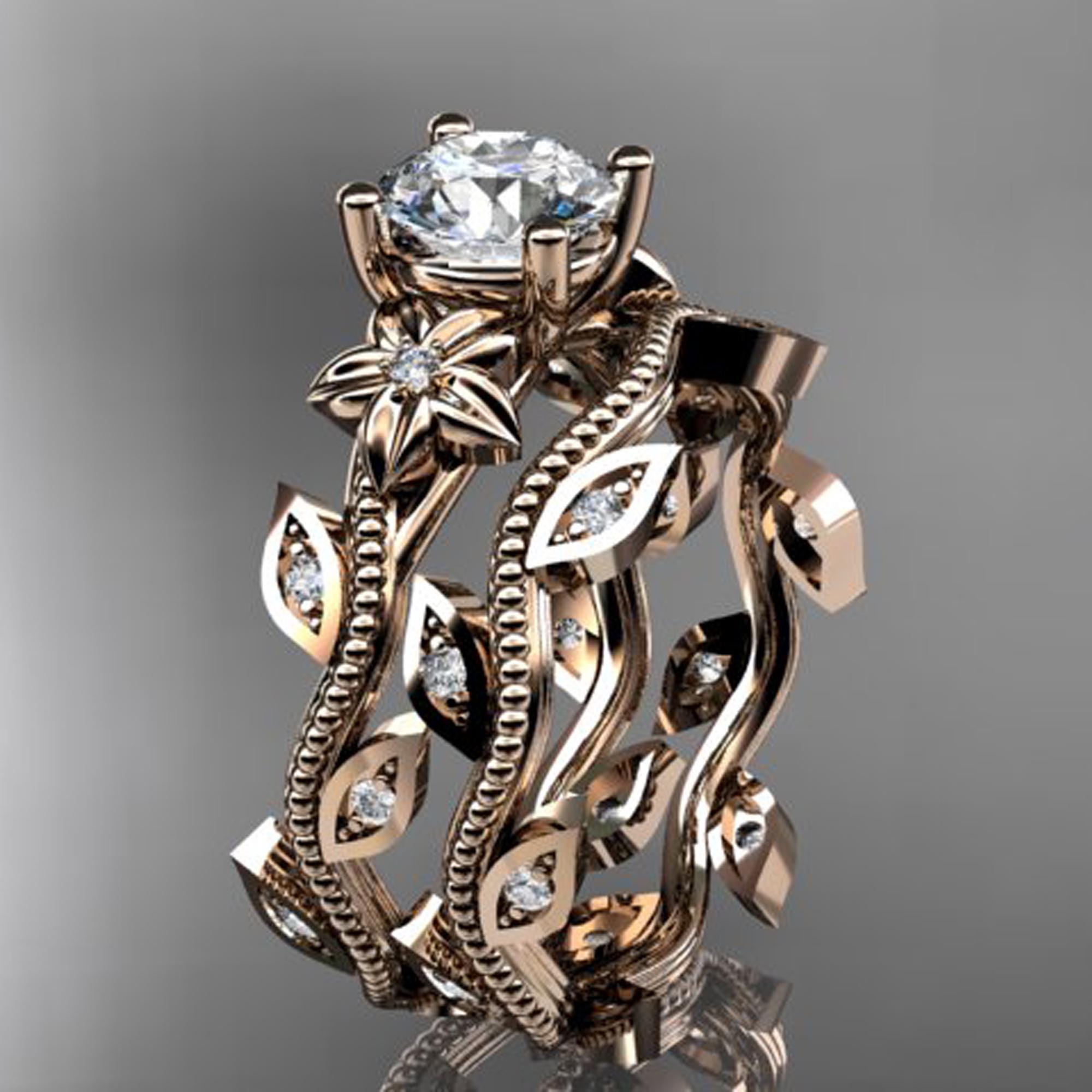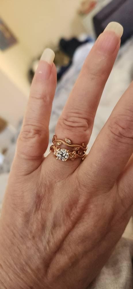 The center stone is a 1 CT IGI Certified Lab Grown Diamond, round brilliant cut for maximum sparkle and clarity. The organic curves of the design evoke the elegance of blooming petals and vines, creating a graceful silhouette that wraps beautifully around the finger. This diamond bridal set is available in solid 14k rose gold, 14k yellow gold, 14k white gold, and platinum!!