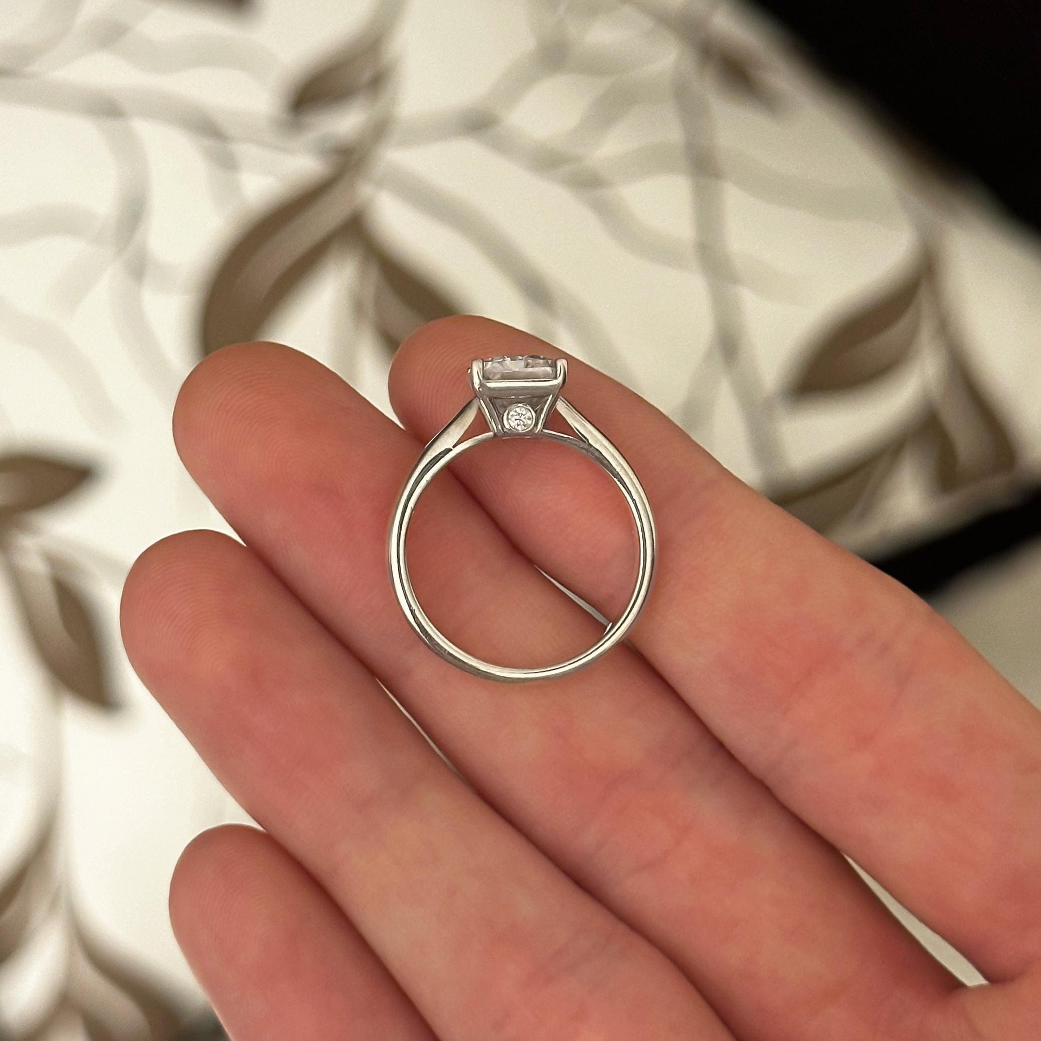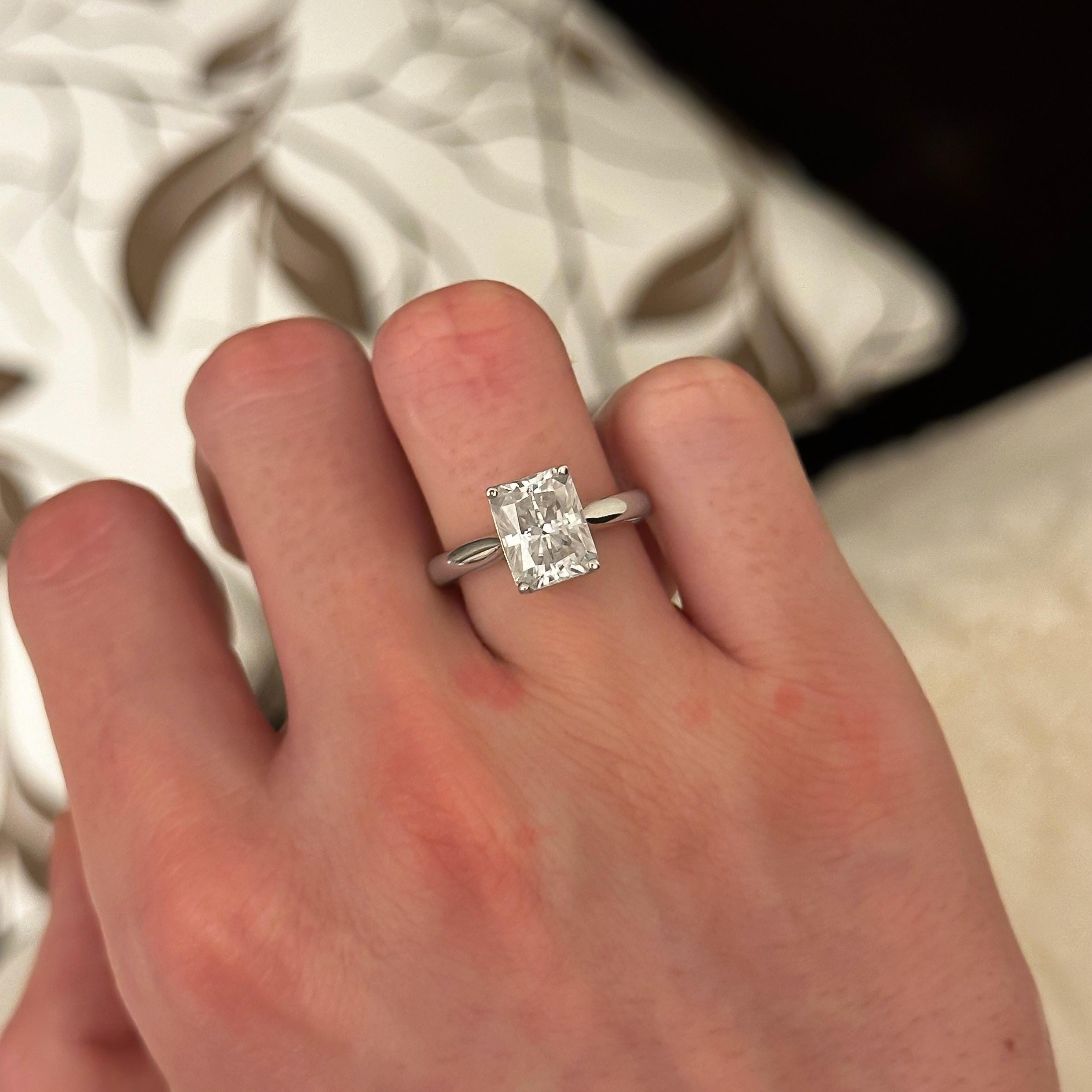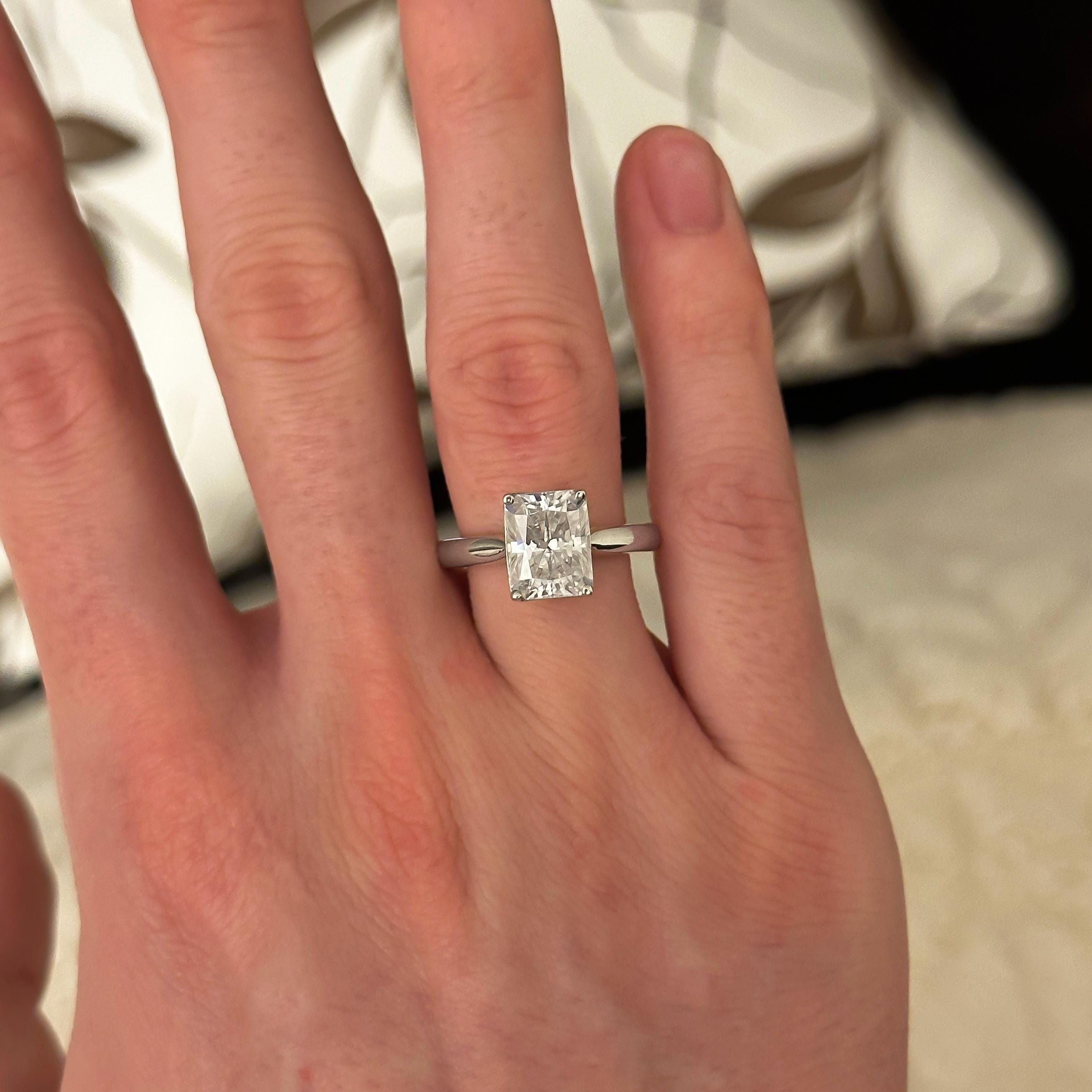 This stunning 2 carat radiant cut lab grown diamond solitaire engagement ring features a sleek and modern silhouette, crafted in solid 14k gold. The center diamond is IGI certified, ensuring exceptional quality, fire, and brilliance. Set in a unique peekaboo setting, a hidden diamond detail adds an intimate touch beneath the main stone—perfect for those who appreciate subtle artistry. Handcrafted with care, this ring offers bold elegance with a clean, contemporary feel—ideal for a modern bride who values both luxury and sustainability.