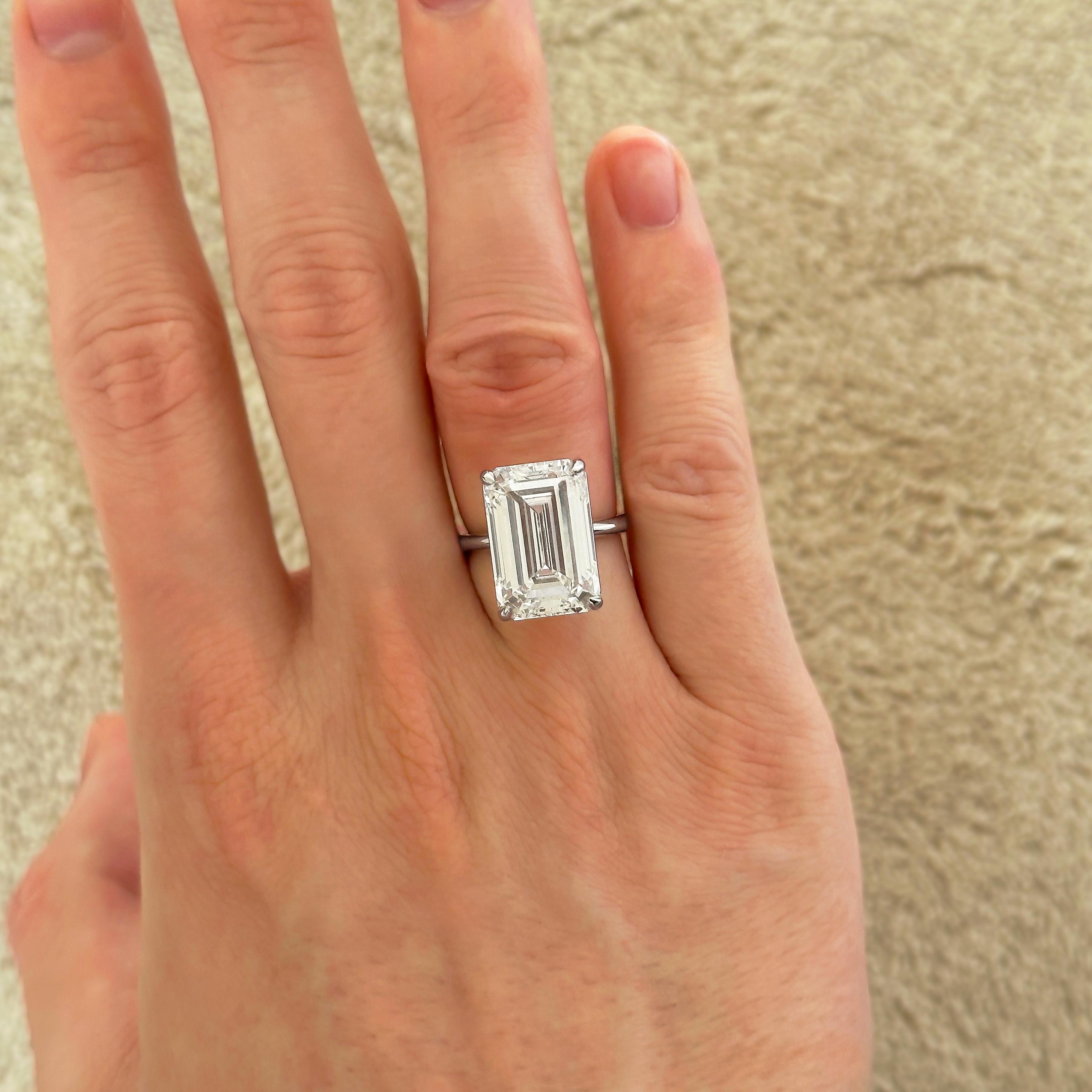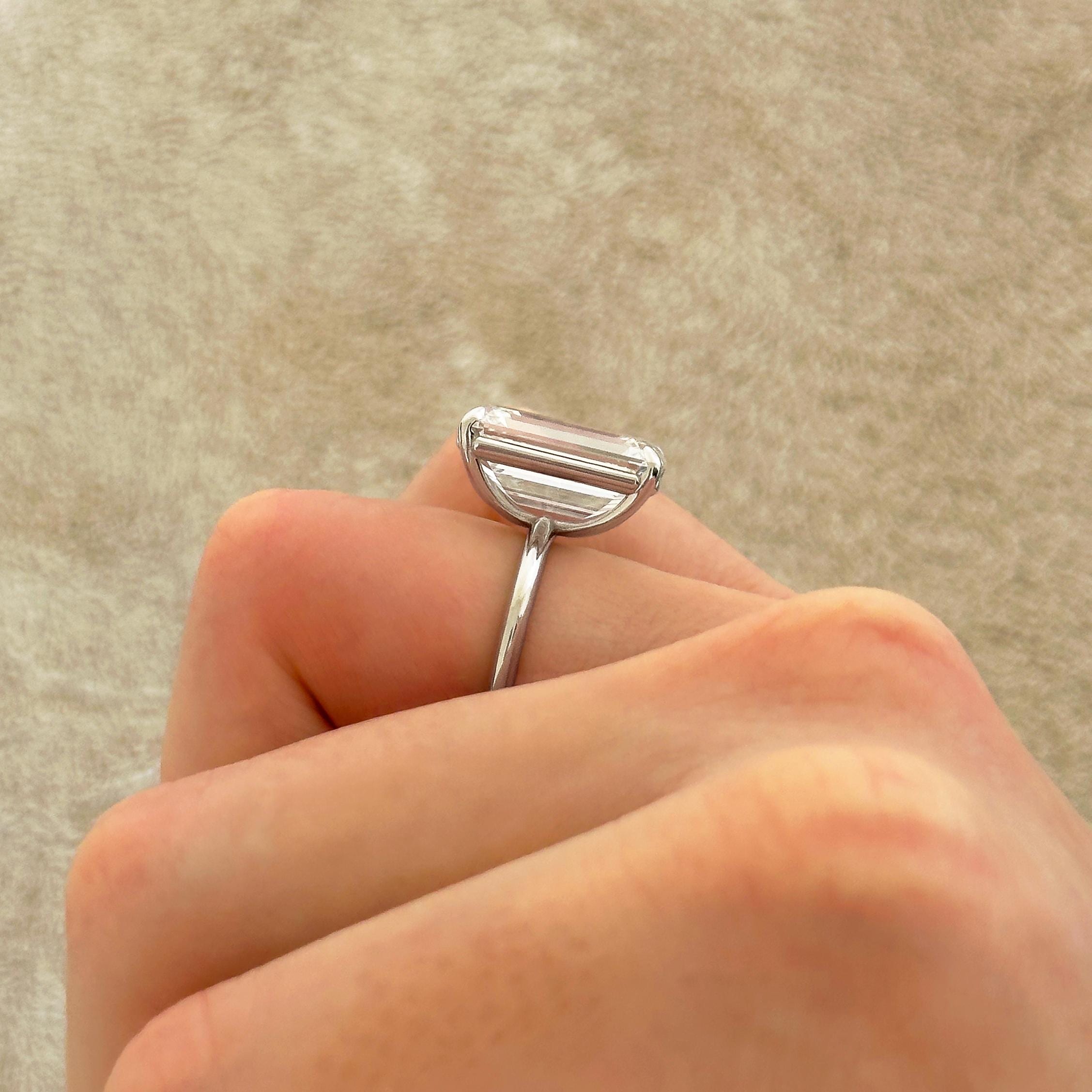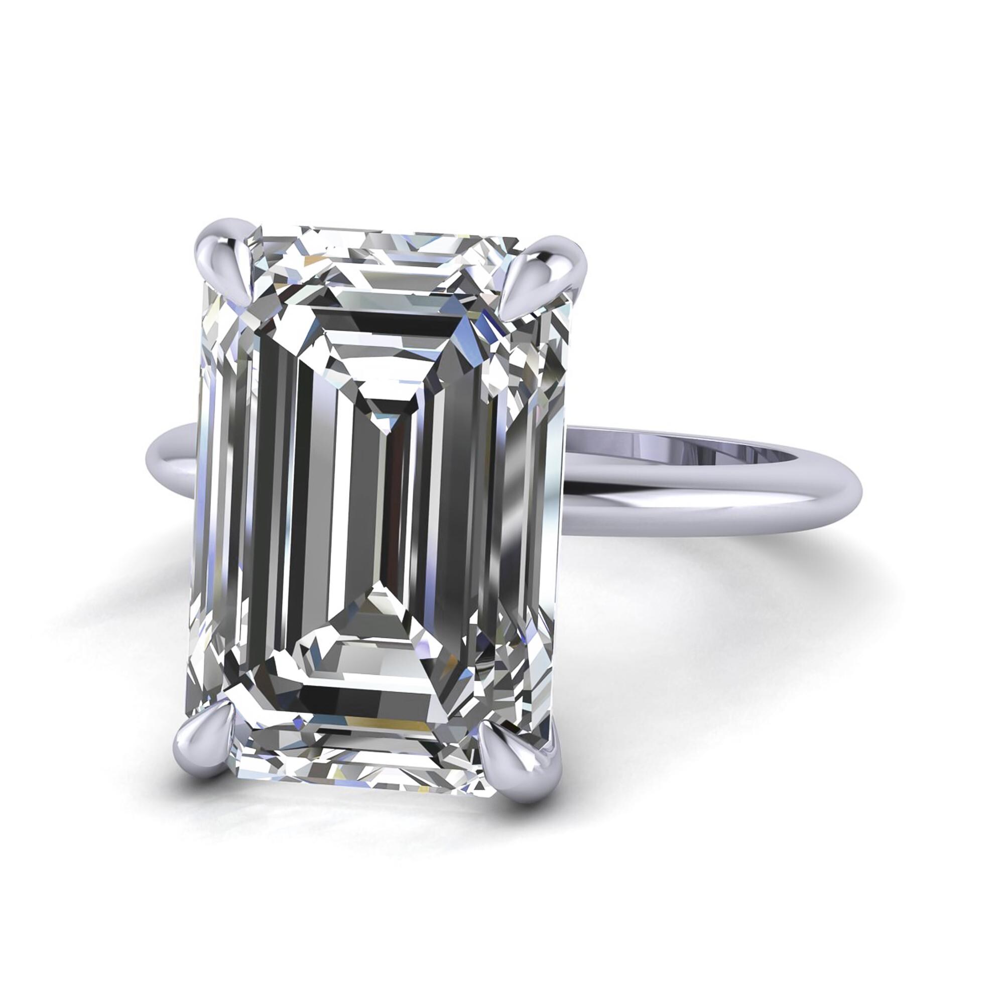 A solitaire engagement ring like truly no other! This proposal ring features a STUNNING 10 carat emerald cut lab grown diamond center stone, safely secured by 4 eagle claw prongs. This big diamond engagement ring is made in solid 14k gold, 18k gold, or platinum to withstand the test of time and glisten for an eternity!