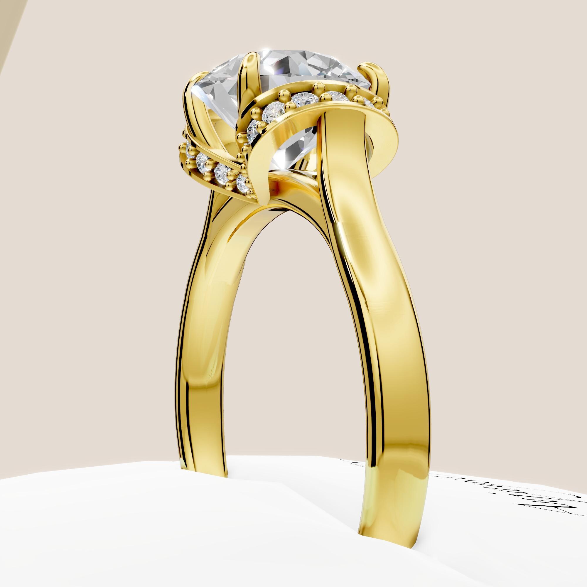 This unique halo engagement ring features a striking 2 carat round lab grown diamond, set in luxurious 14k yellow gold! Surrounded by a shimmering diamond halo, the center stone is secured with eagle claw prongs for a bold, elegant touch.