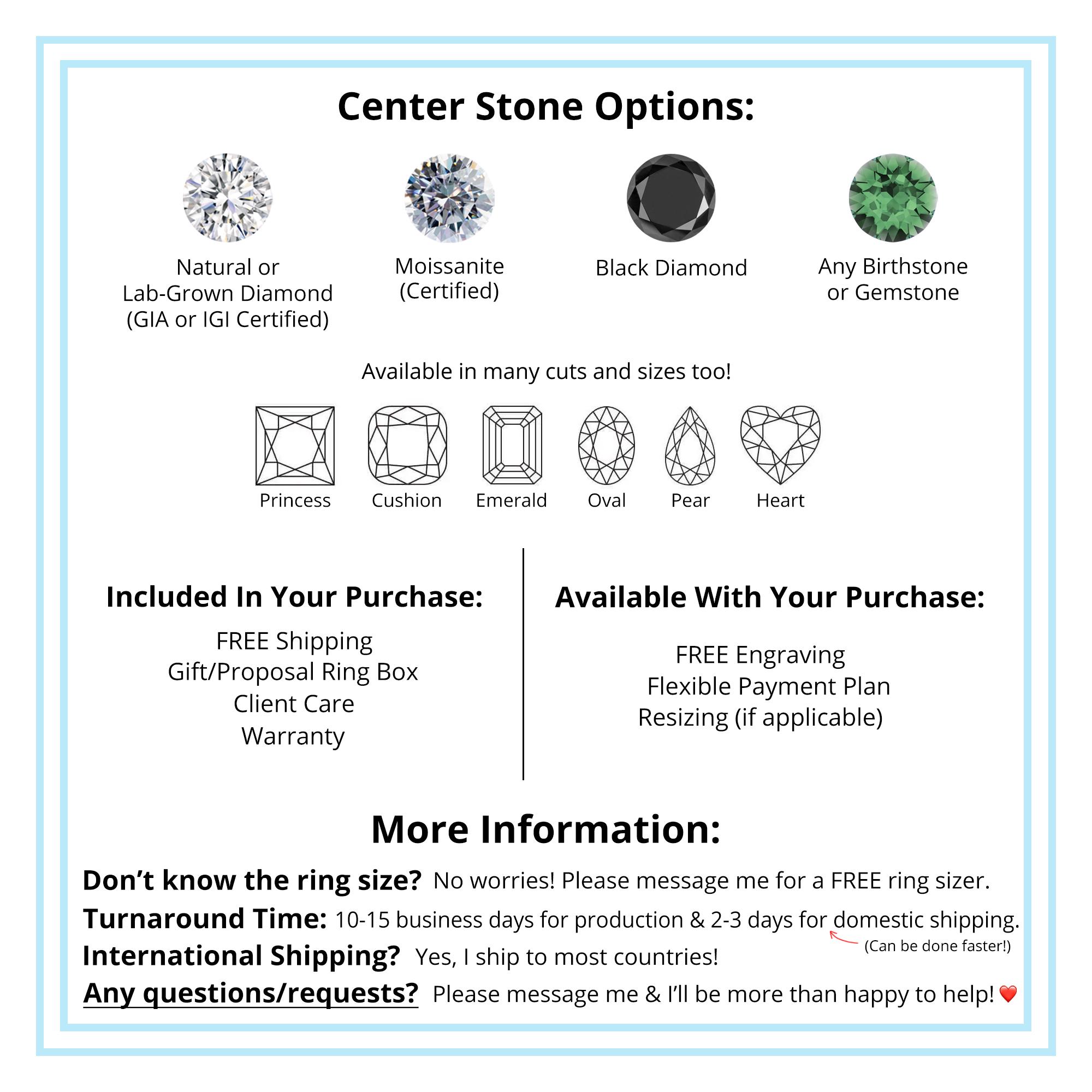 All of the rings you see listed on my store are hand-designed by your very own! I design, manufacture, and ship all of my rings. Being in business for MANY years, I’ve had the chance to make engagement & wedding rings for many beautiful couples around the globe. But don’t just take my word for it, see the 850+ reviews my clients have shared by clicking the ‘review’ tab on my store!