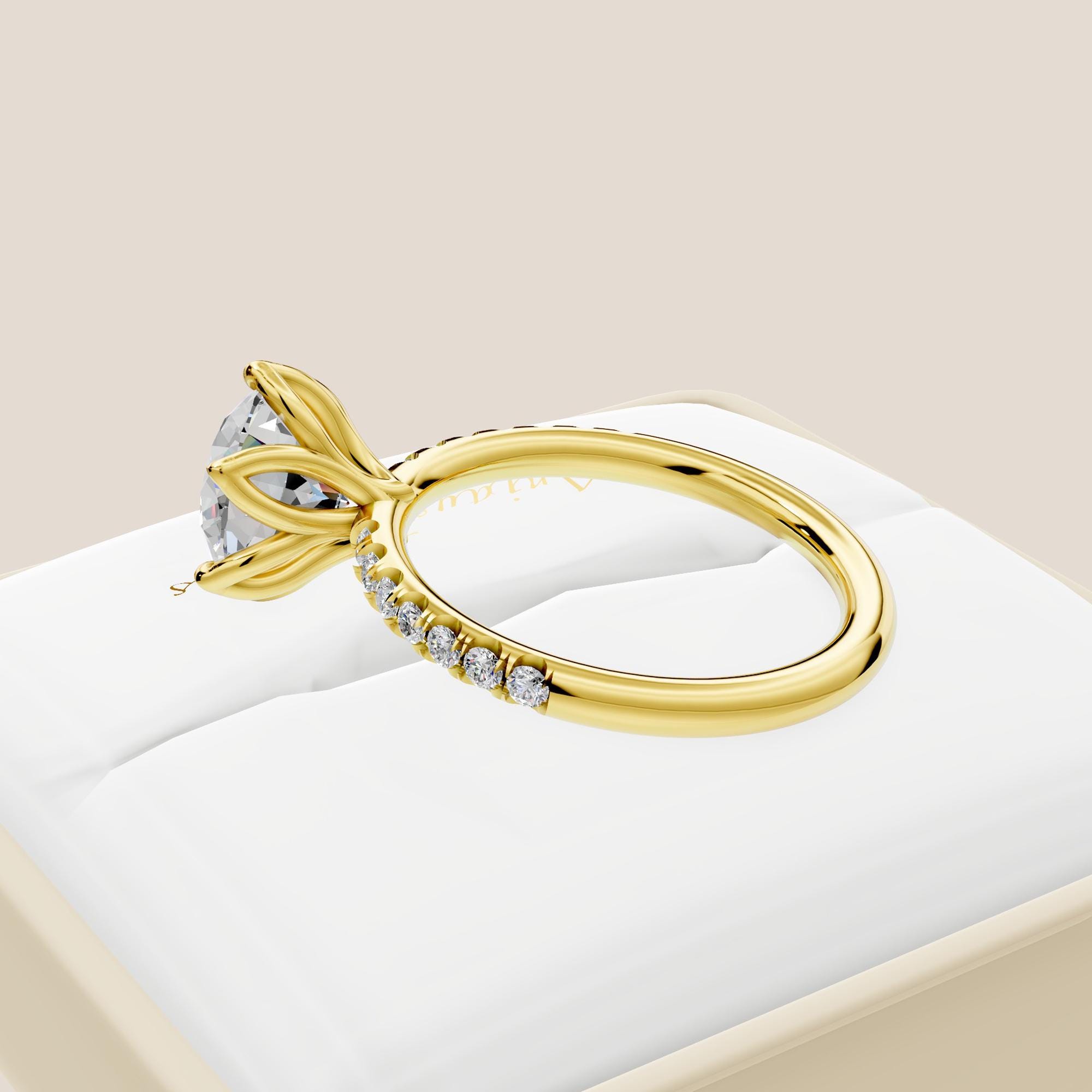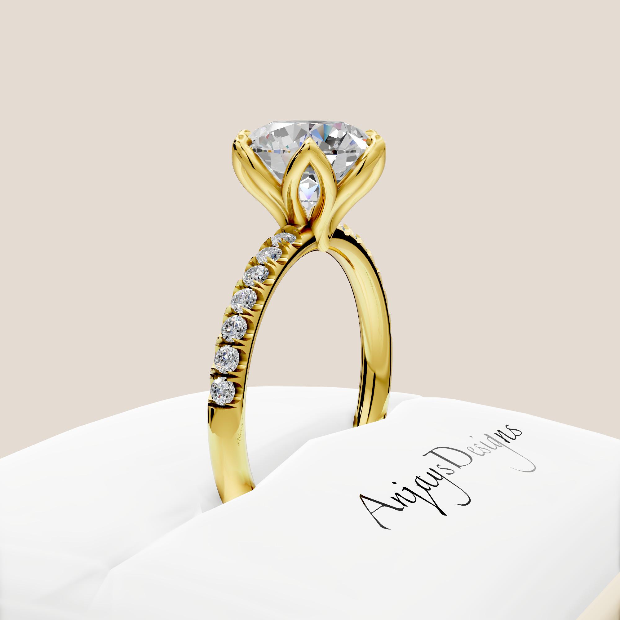 Celebrate your love with this breathtaking 2 Carat Round Lab Grown Diamond Engagement Ring, expertly crafted in solid 14K Yellow Gold. Featuring a romantic tulip setting that delicately cradles the diamond, this ring highlights the brilliance and fire of the stone from every angle. The French pave band adds a touch of sparkle and sophistication, creating a timeless and elegant look!