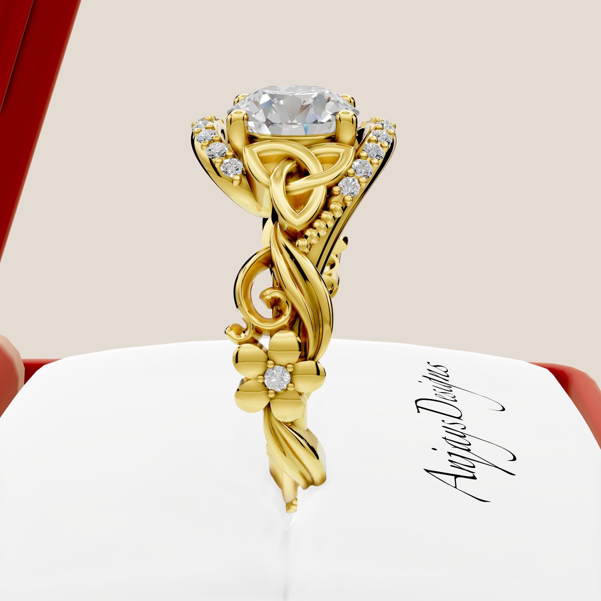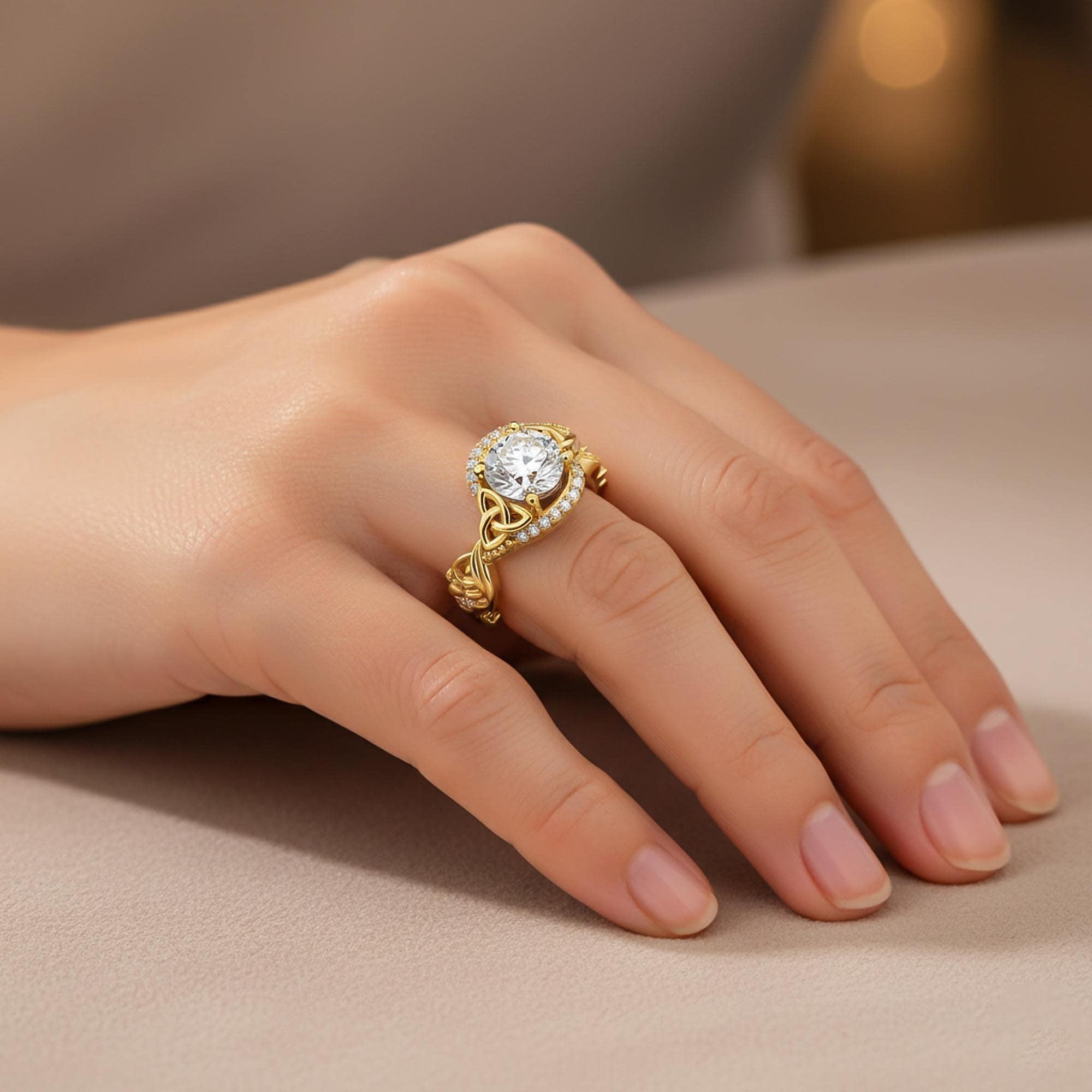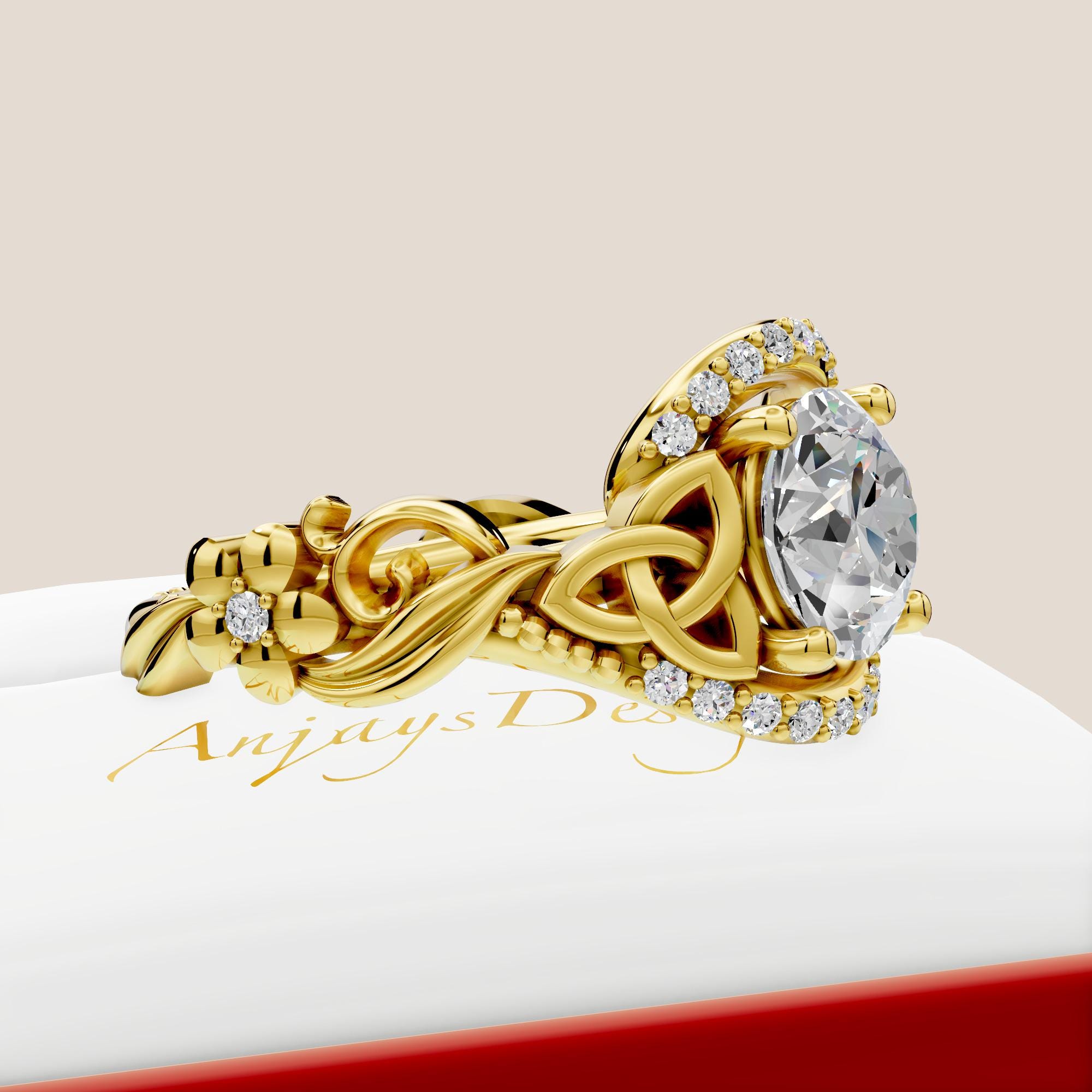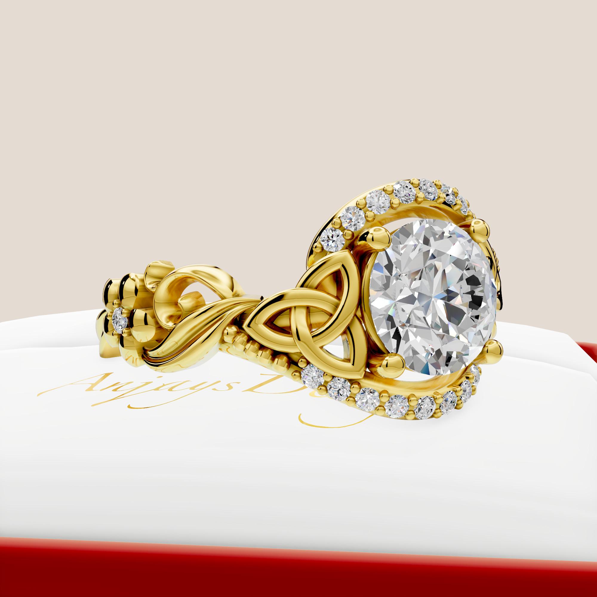 Celebrate eternal love with this Celtic knot engagement ring, featuring a breathtaking lab grown 2 carat round cut diamond that radiates brilliance and fire! Handcrafted in solid 14k yellow gold, this ring beautifully blends elegance and meaning with its trinity knot (triquetra) design, symbolizing unity, love, and eternity.