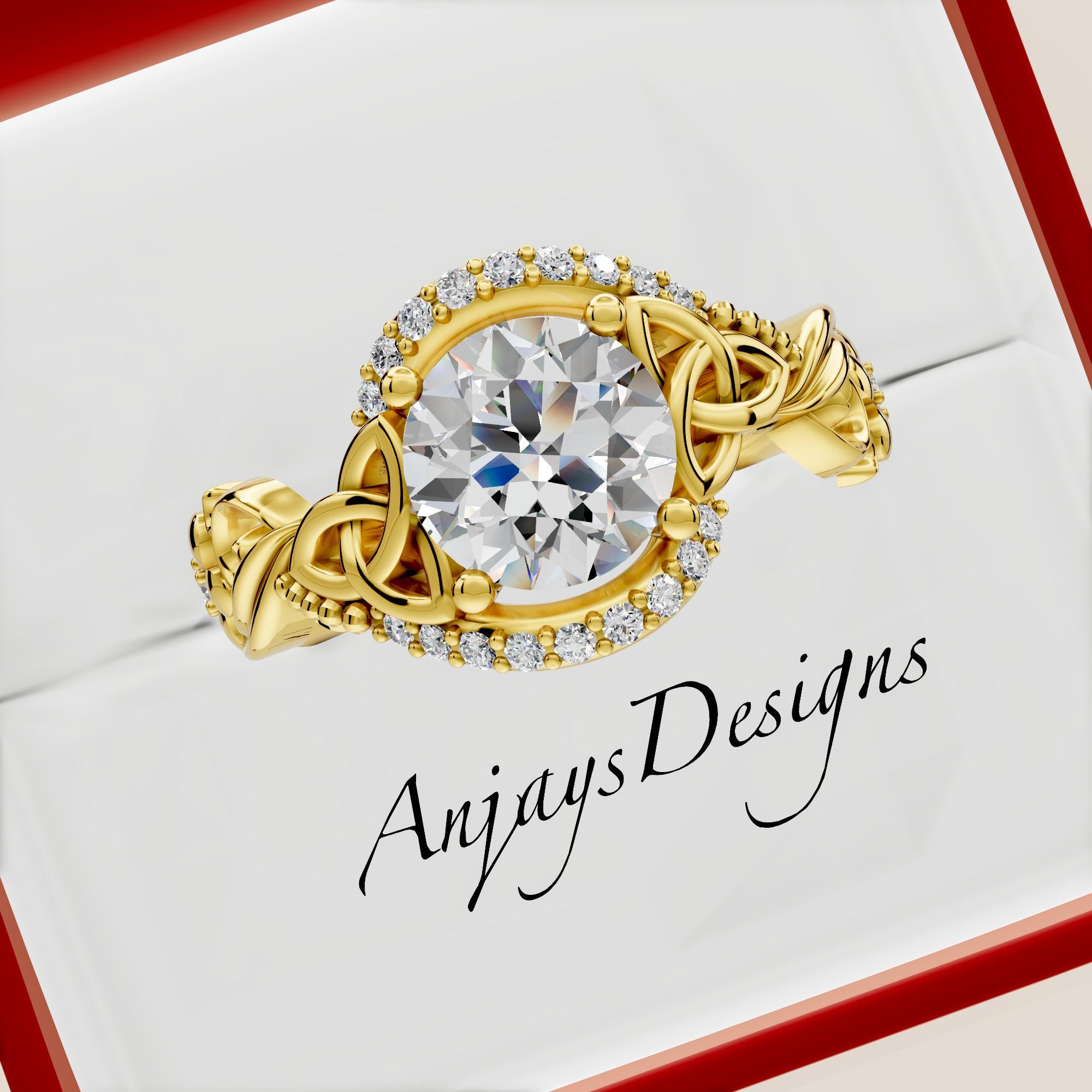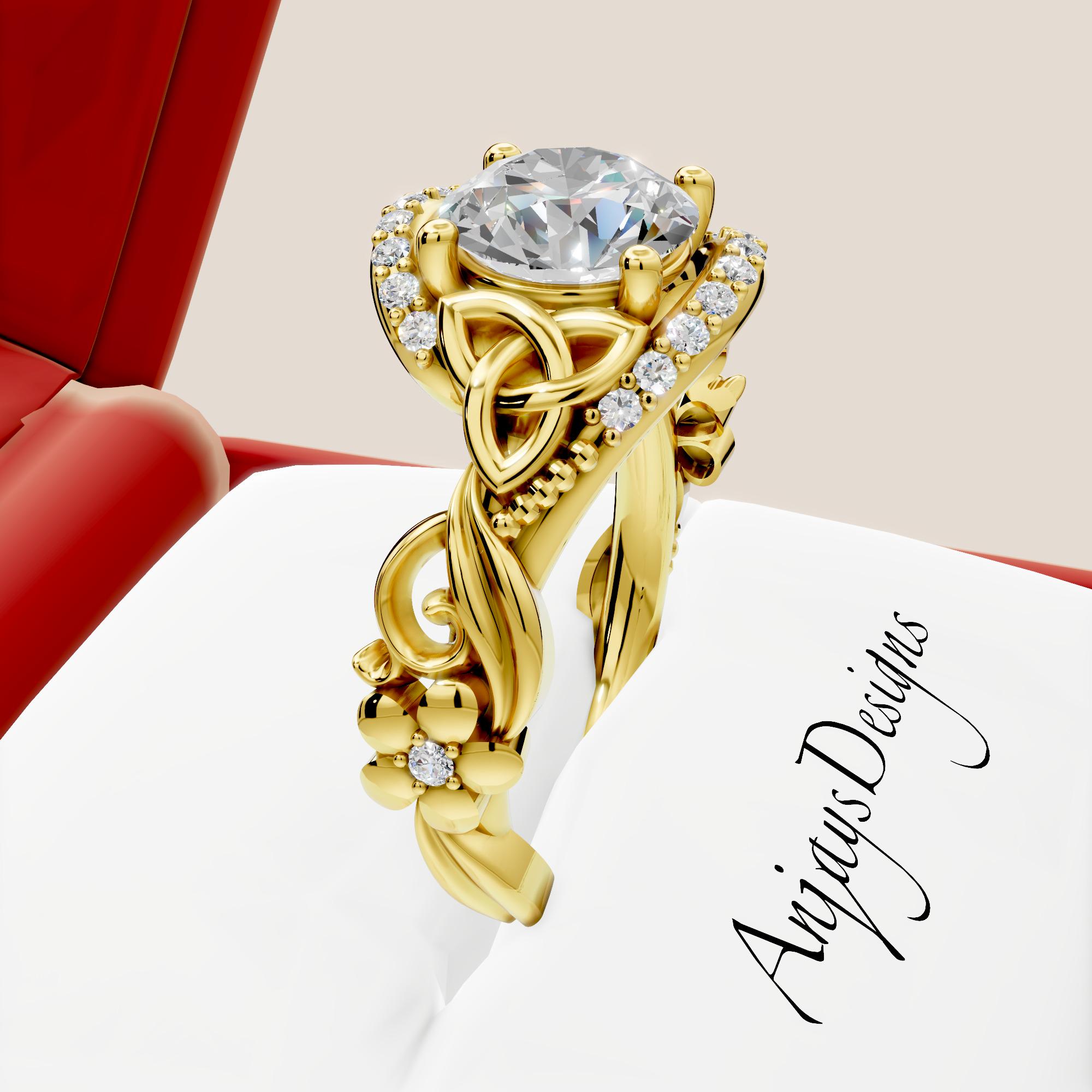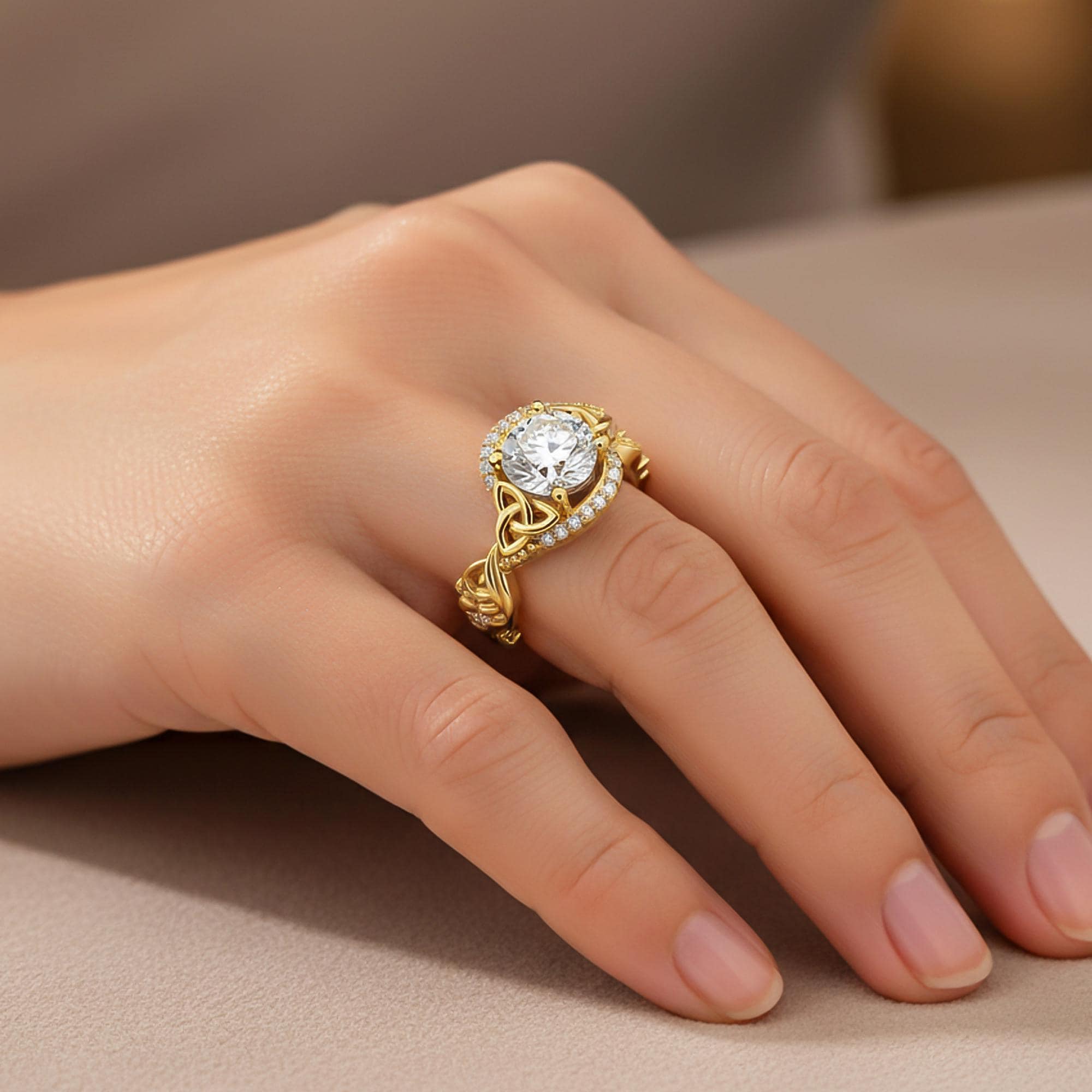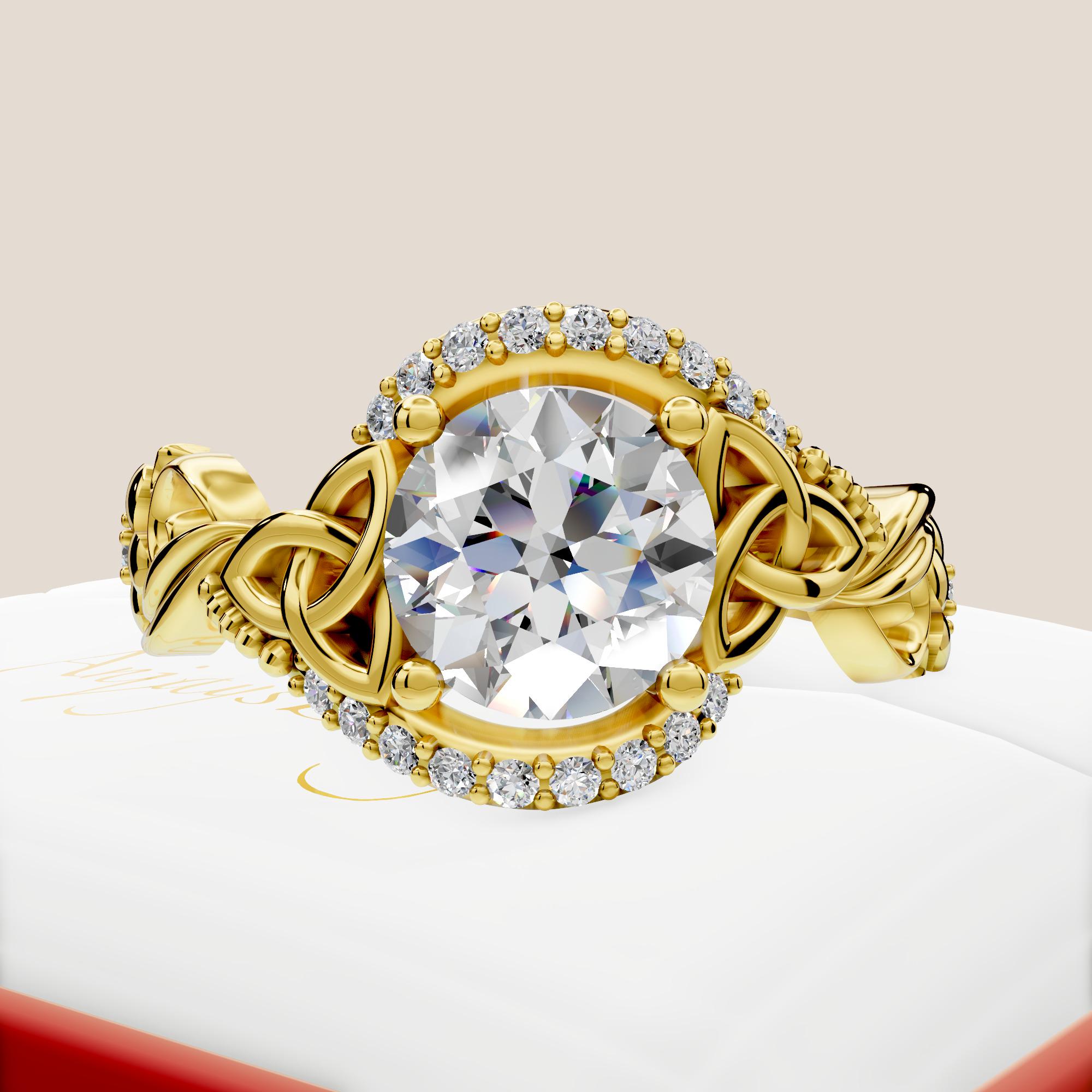 Celebrate eternal love with this Celtic knot engagement ring, featuring a breathtaking lab grown 2 carat round cut diamond that radiates brilliance and fire! Handcrafted in solid 14k yellow gold, this ring beautifully blends elegance and meaning with its trinity knot (triquetra) design, symbolizing unity, love, and eternity.