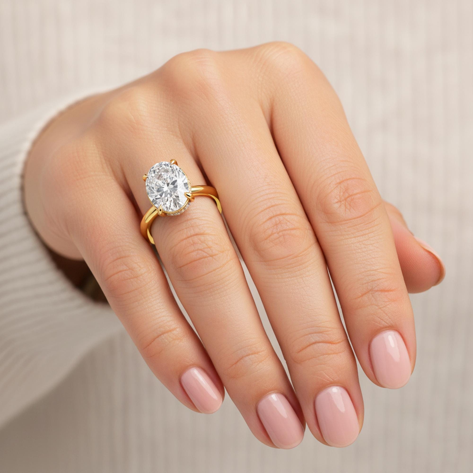 This 3 Carat Oval Engagement Ring is the perfect blend of brilliance and elegance. The oval cut lab grown diamond is framed by a sparkling halo of accent diamonds, adding extra fire and brilliance to the center stone. Handcrafted in solid 14K yellow gold, this ring sits on a delicate thin band, making the center diamond the true star!