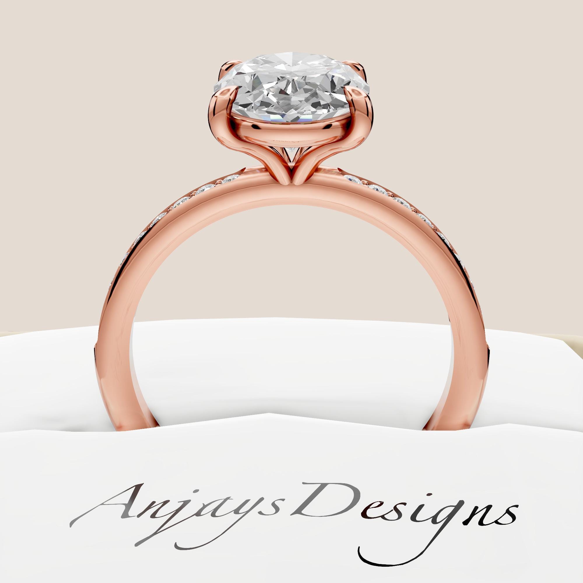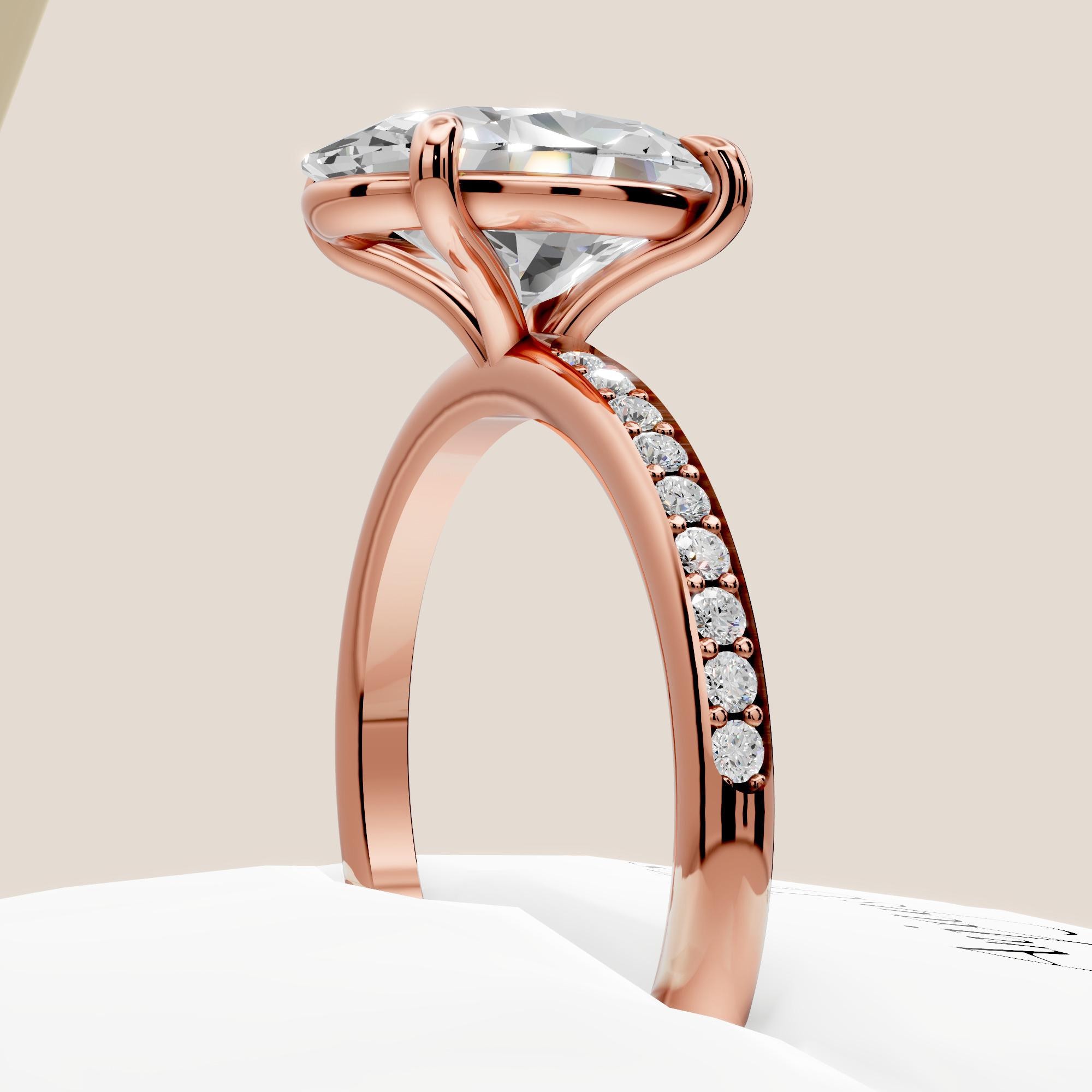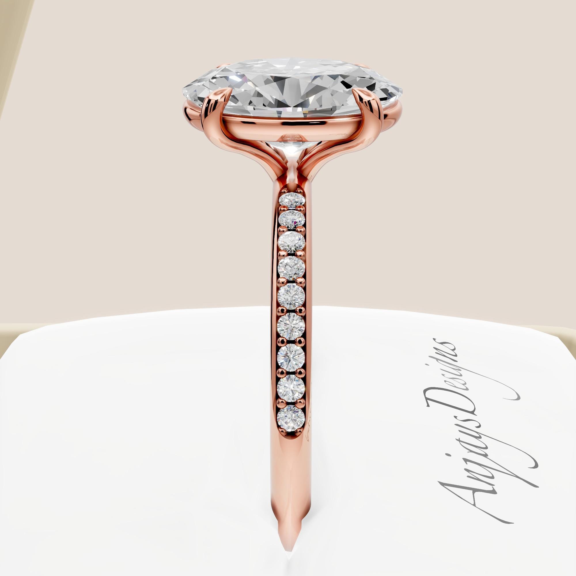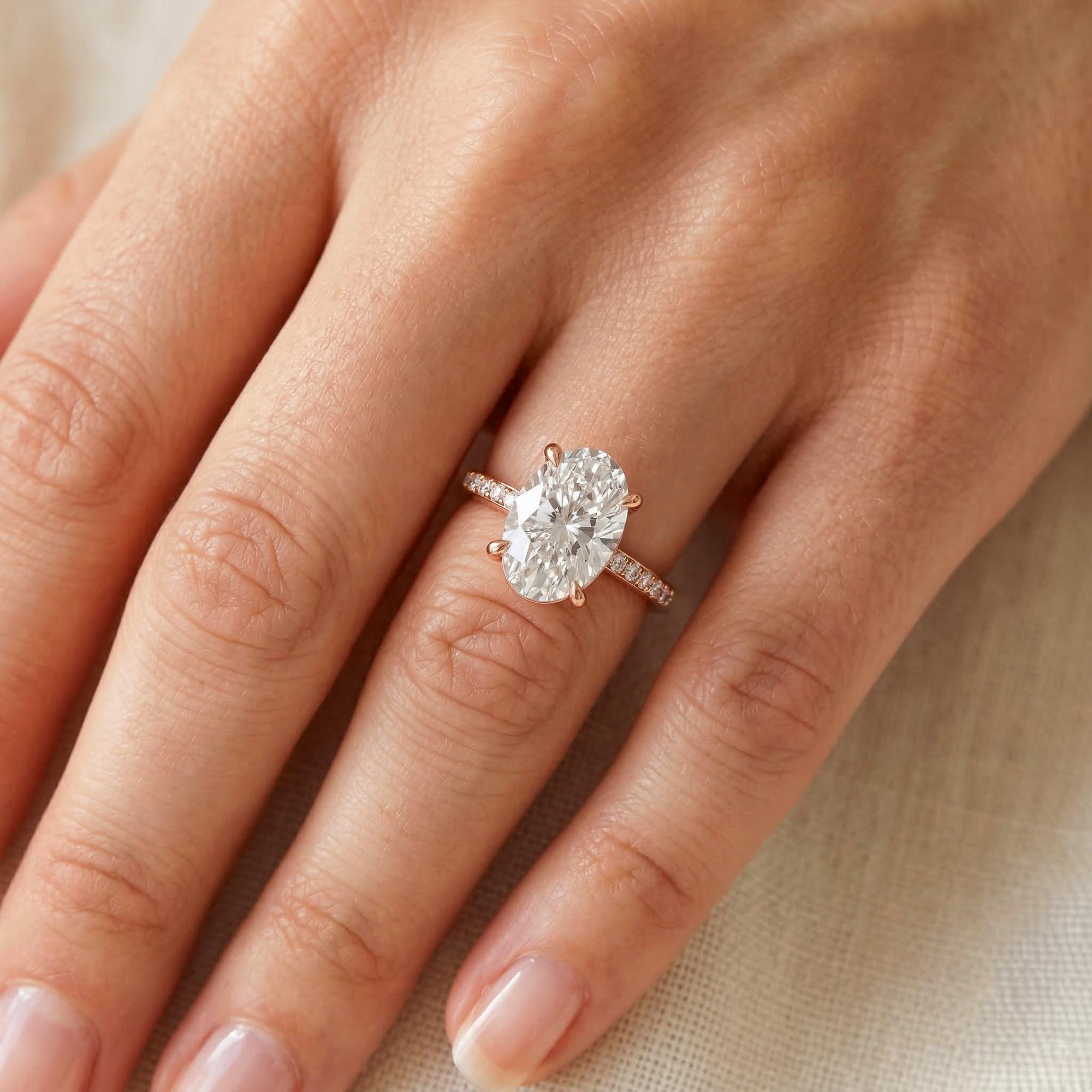 Elegant and refined, this 3 carat oval cut lab grown diamond engagement ring shines with timeless beauty! Set in 14k rose gold, the elongated oval diamond creates a graceful, flattering look on the hand. A pavé set band adds delicate sparkle while keeping the design minimal and dainty, perfect for those who appreciate understated luxury!