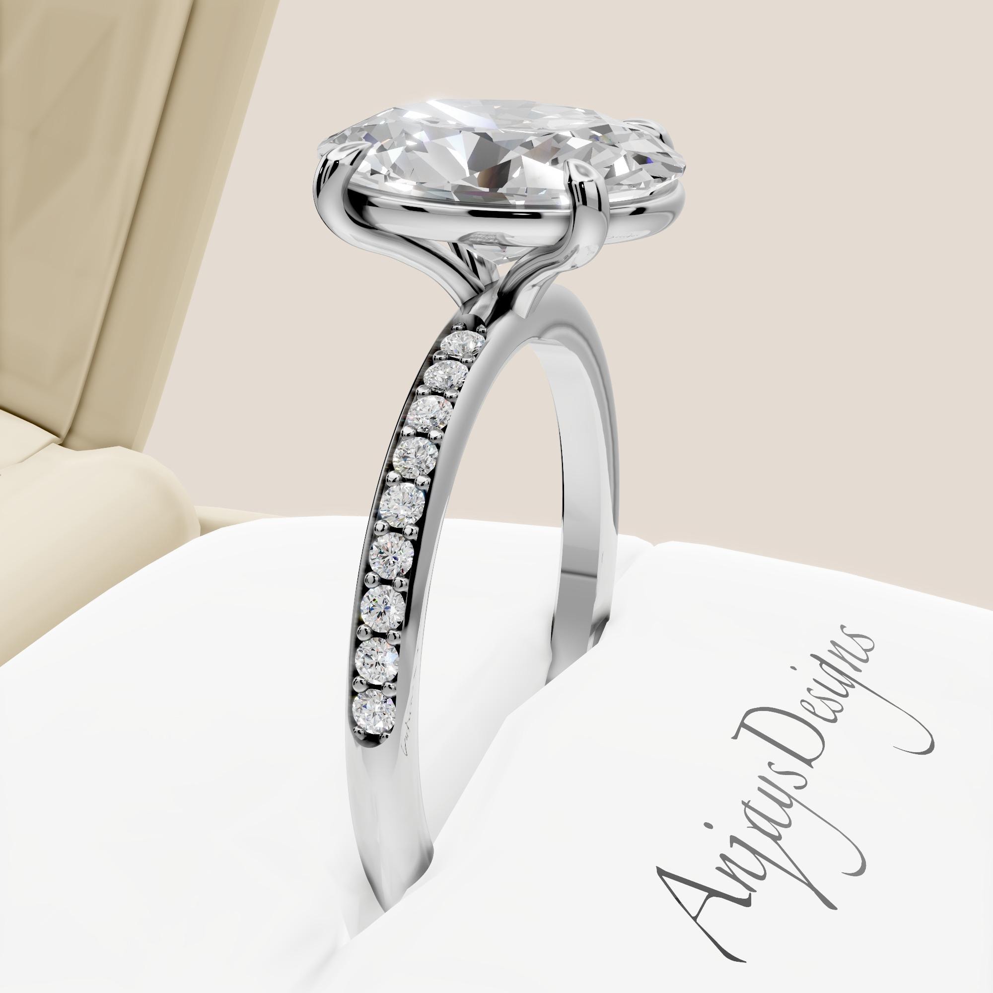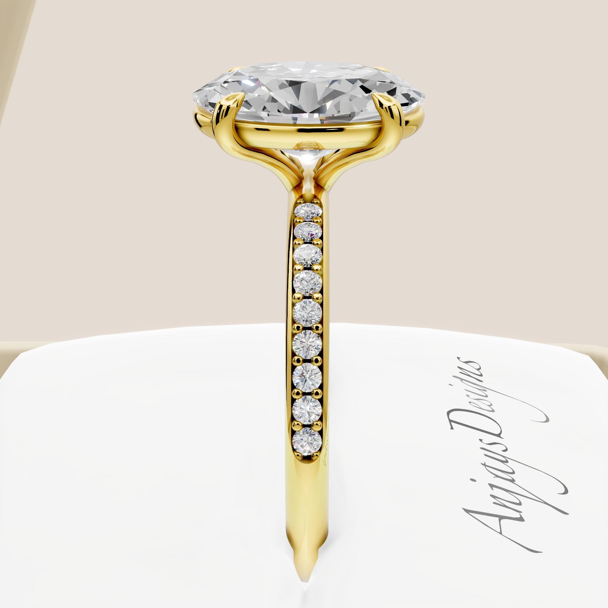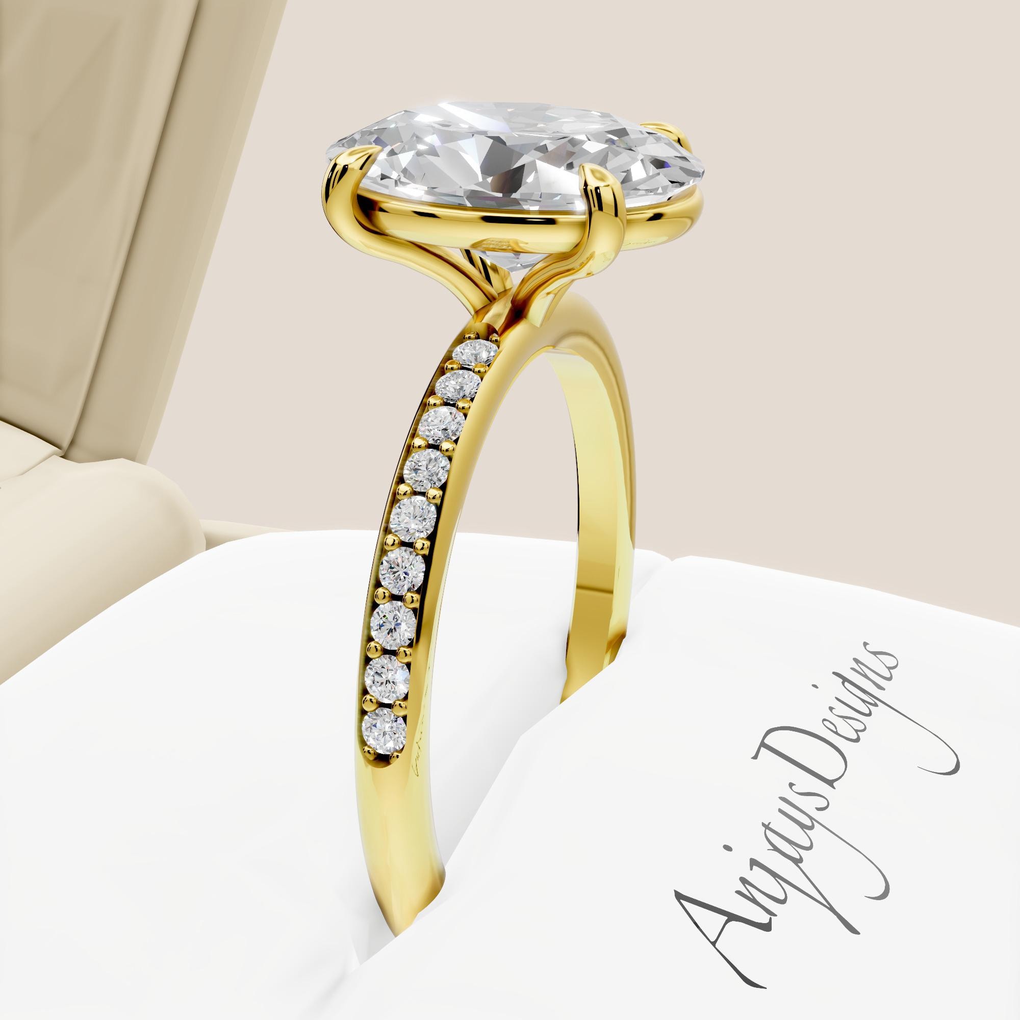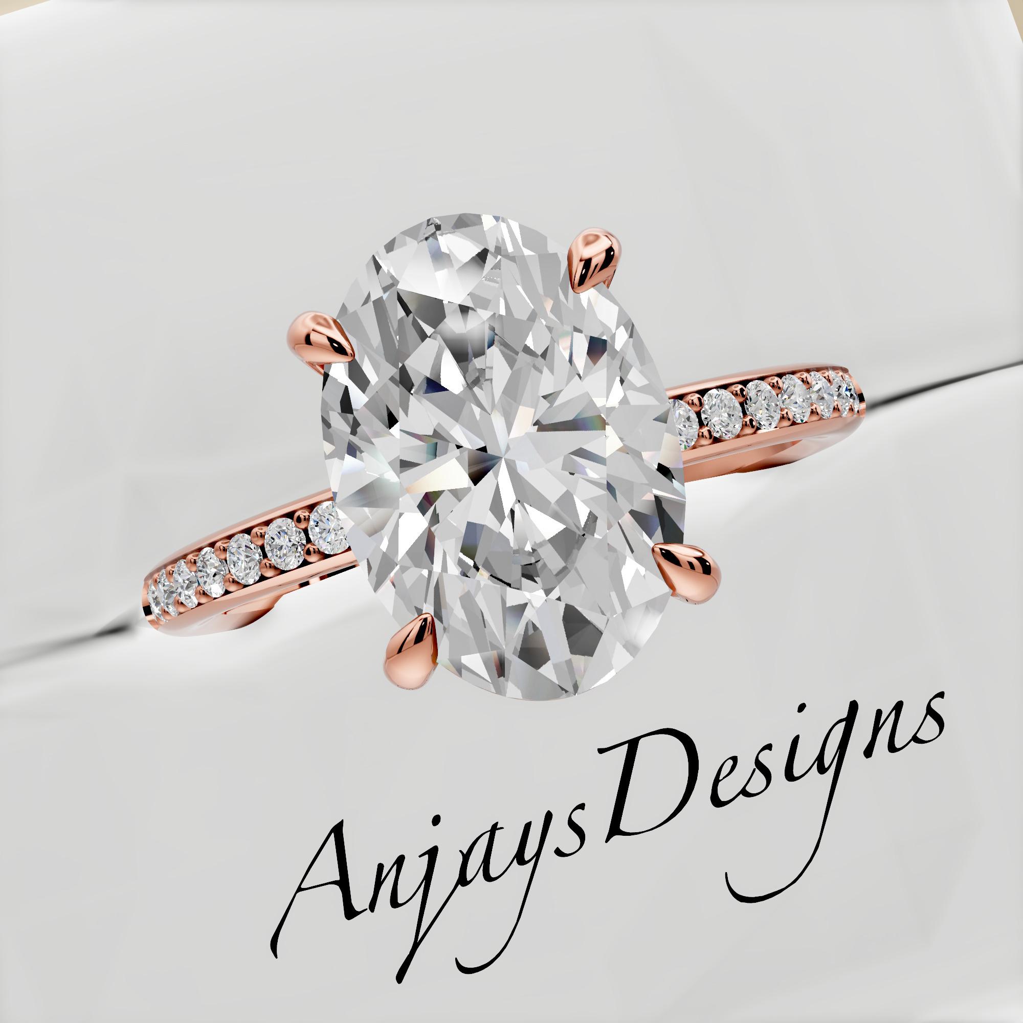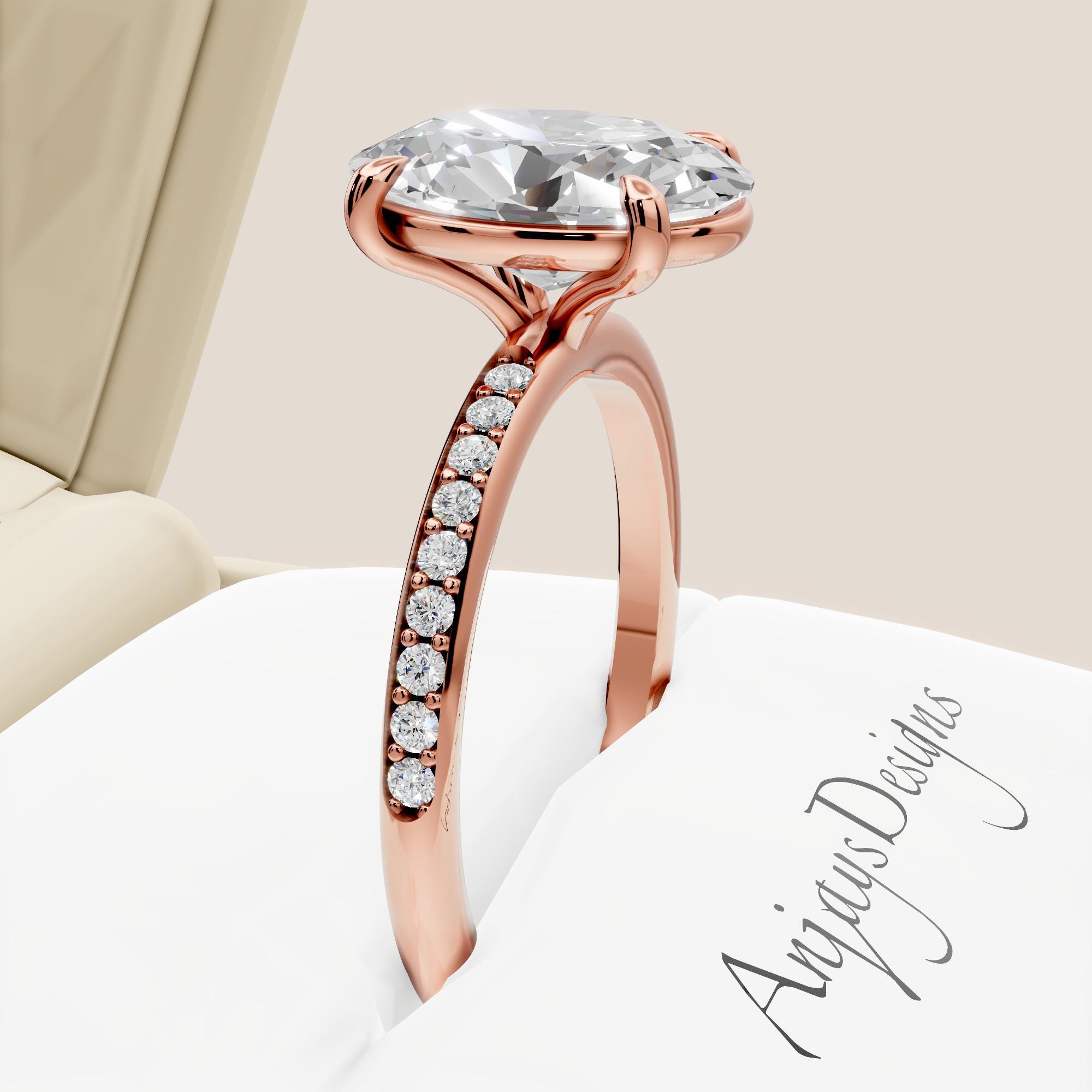 Elegant and refined, this 3 carat oval cut lab grown diamond engagement ring shines with timeless beauty! Set in 14k rose gold, the elongated oval diamond creates a graceful, flattering look on the hand. A pavé set band adds delicate sparkle while keeping the design minimal and dainty, perfect for those who appreciate understated luxury!