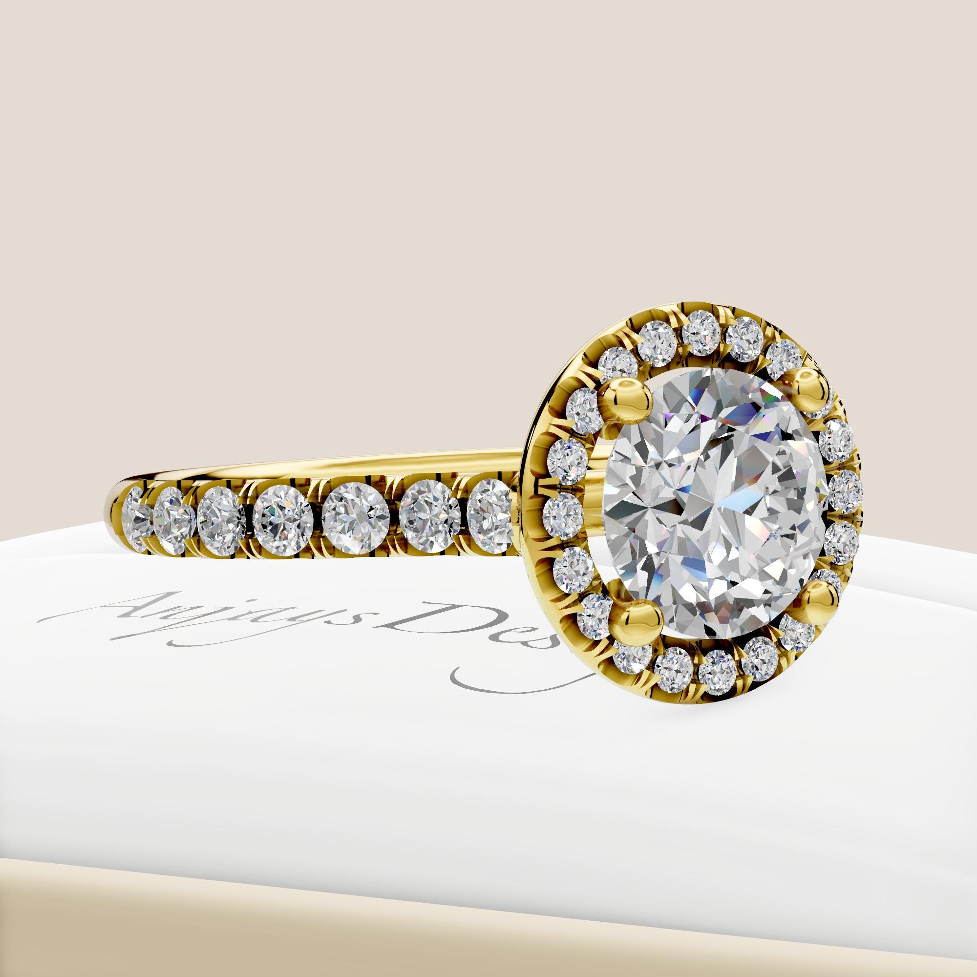 This timeless engagement ring showcases a brilliant 1 carat round lab grown diamond, graded D color and VS1 clarity, offering exceptional sparkle and fire! The center stone is beautifully framed by a shimmering halo of smaller diamonds, enhancing its brilliance and creating a radiant, eye-catching design. Crafted in solid 14k yellow gold, this piece balances elegance with durability, making it perfect for everyday wear. A classic yet modern choice, this halo engagement ring is the perfect symbol of love and commitment!