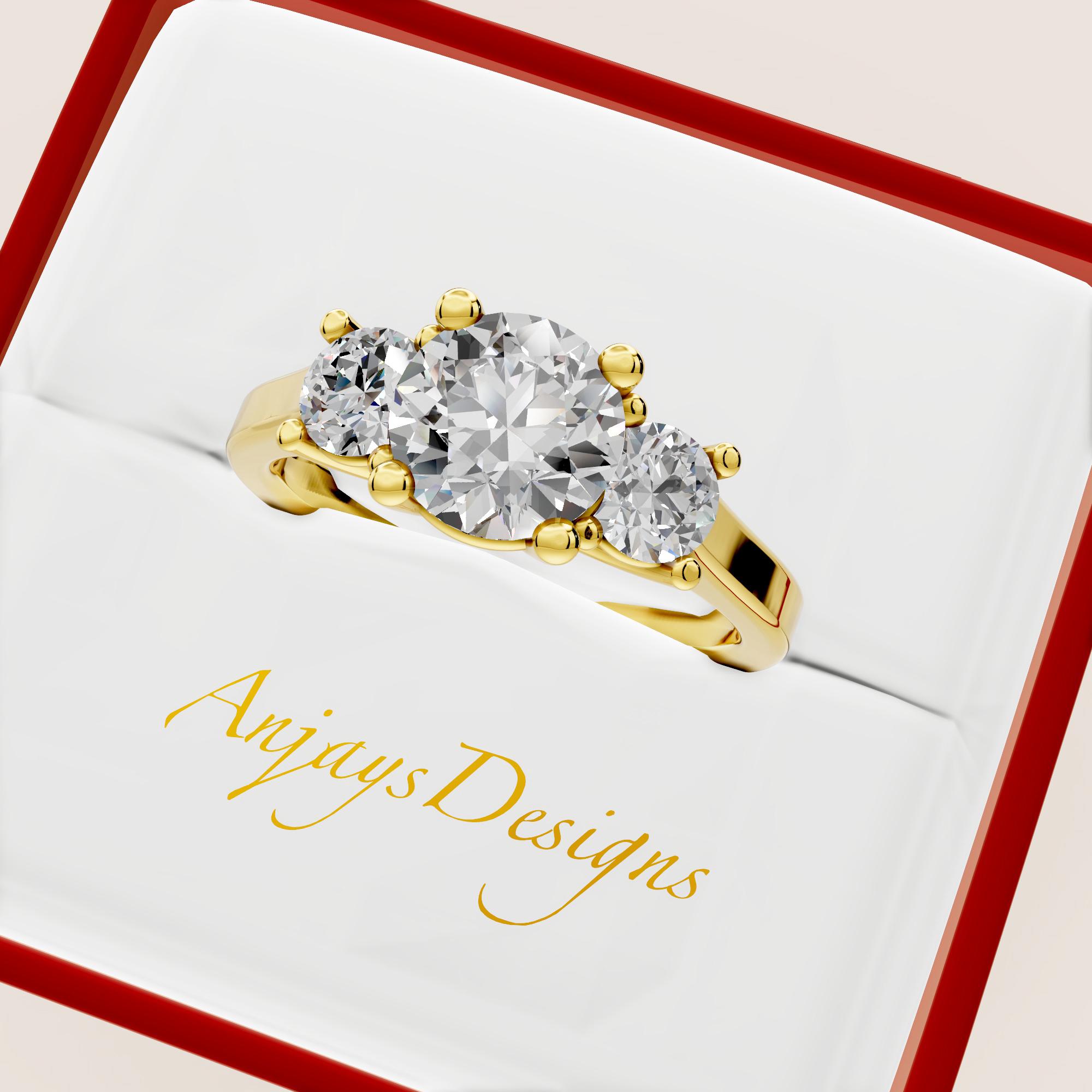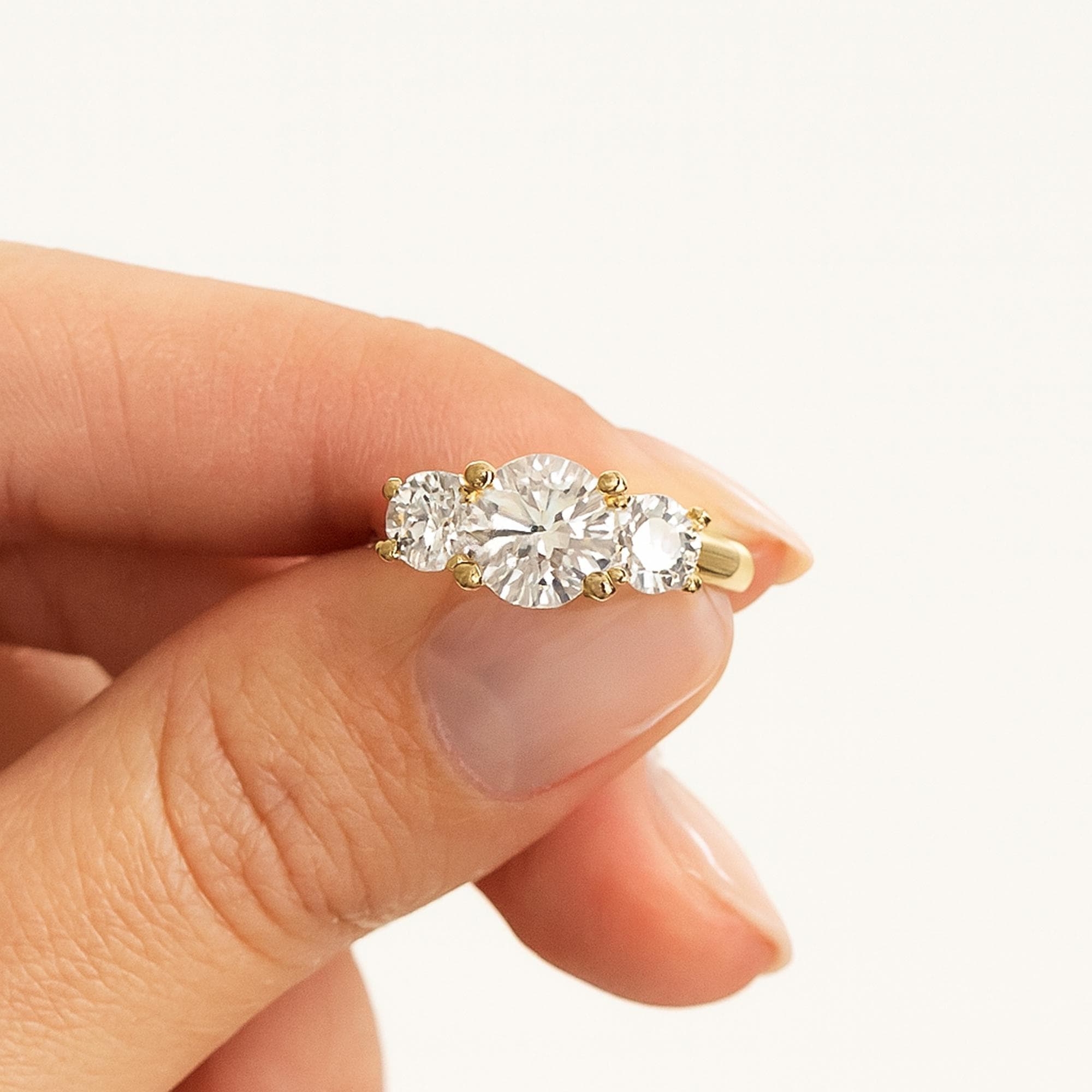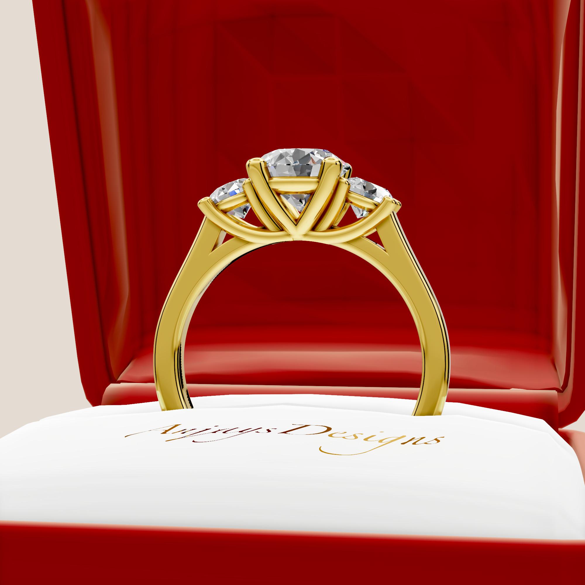 This 1.4 carat three stone engagement ring features a brilliant round cut lab grown diamond as the centerpiece, accented by round side diamonds for added brilliance. Crafted in solid 14k yellow gold, this timeless design symbolizes your past, present, and future together!
