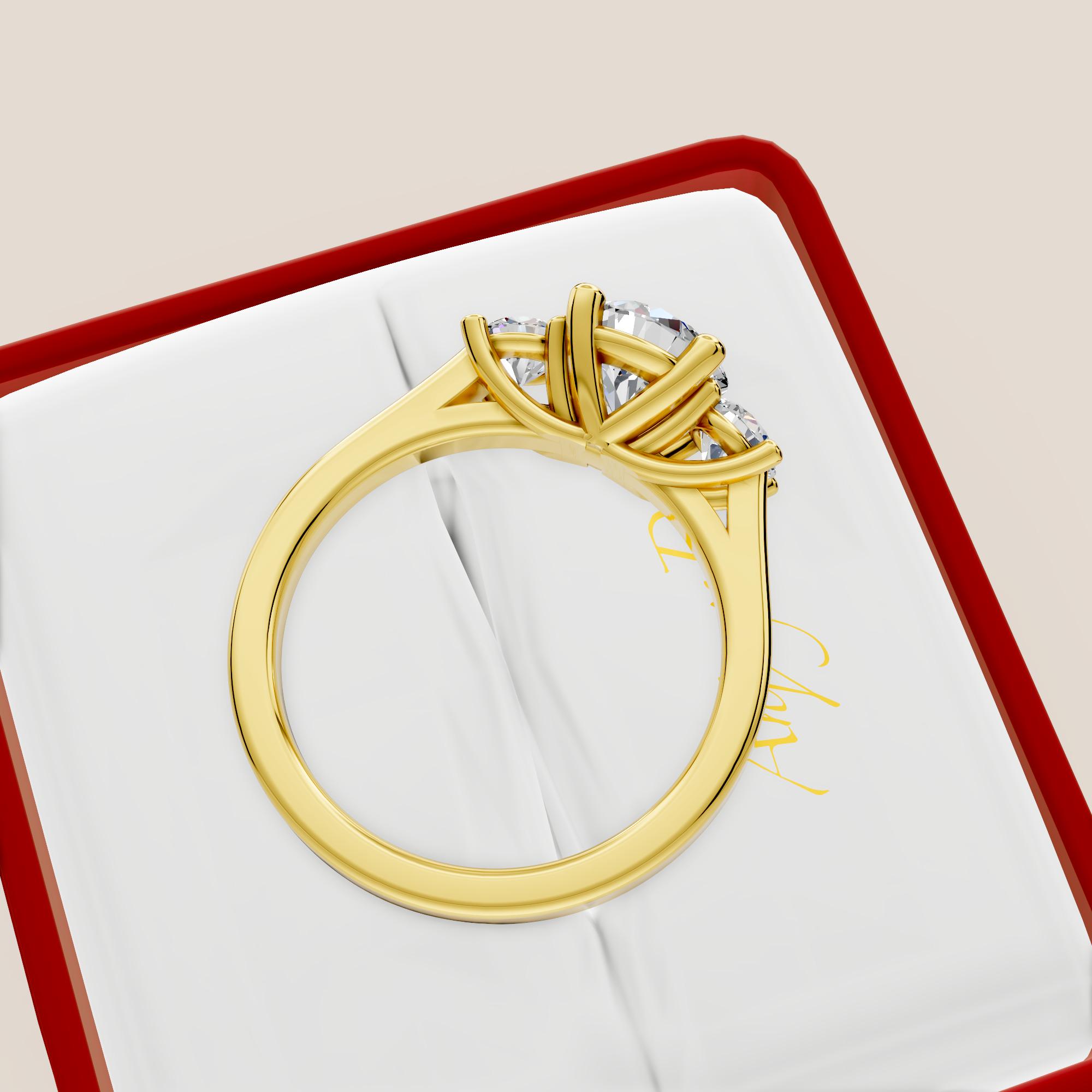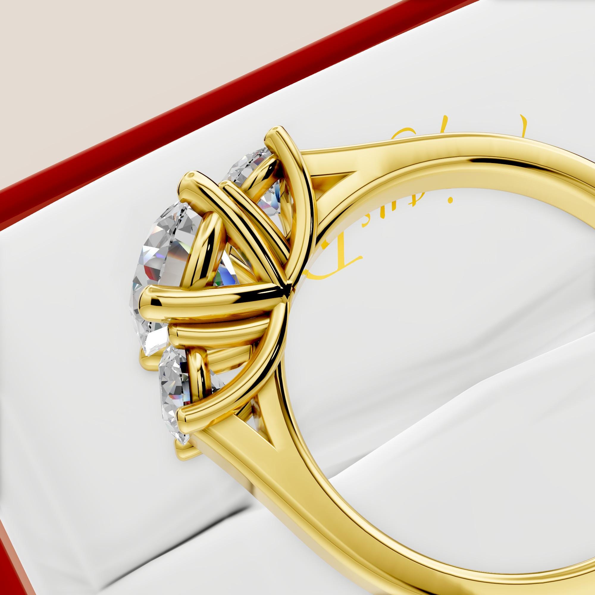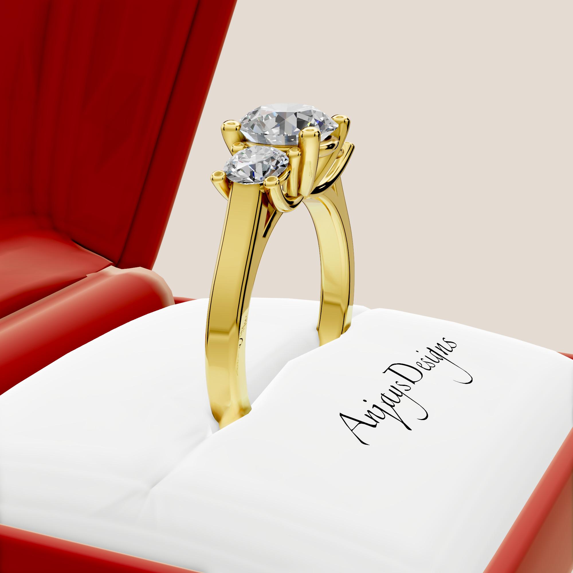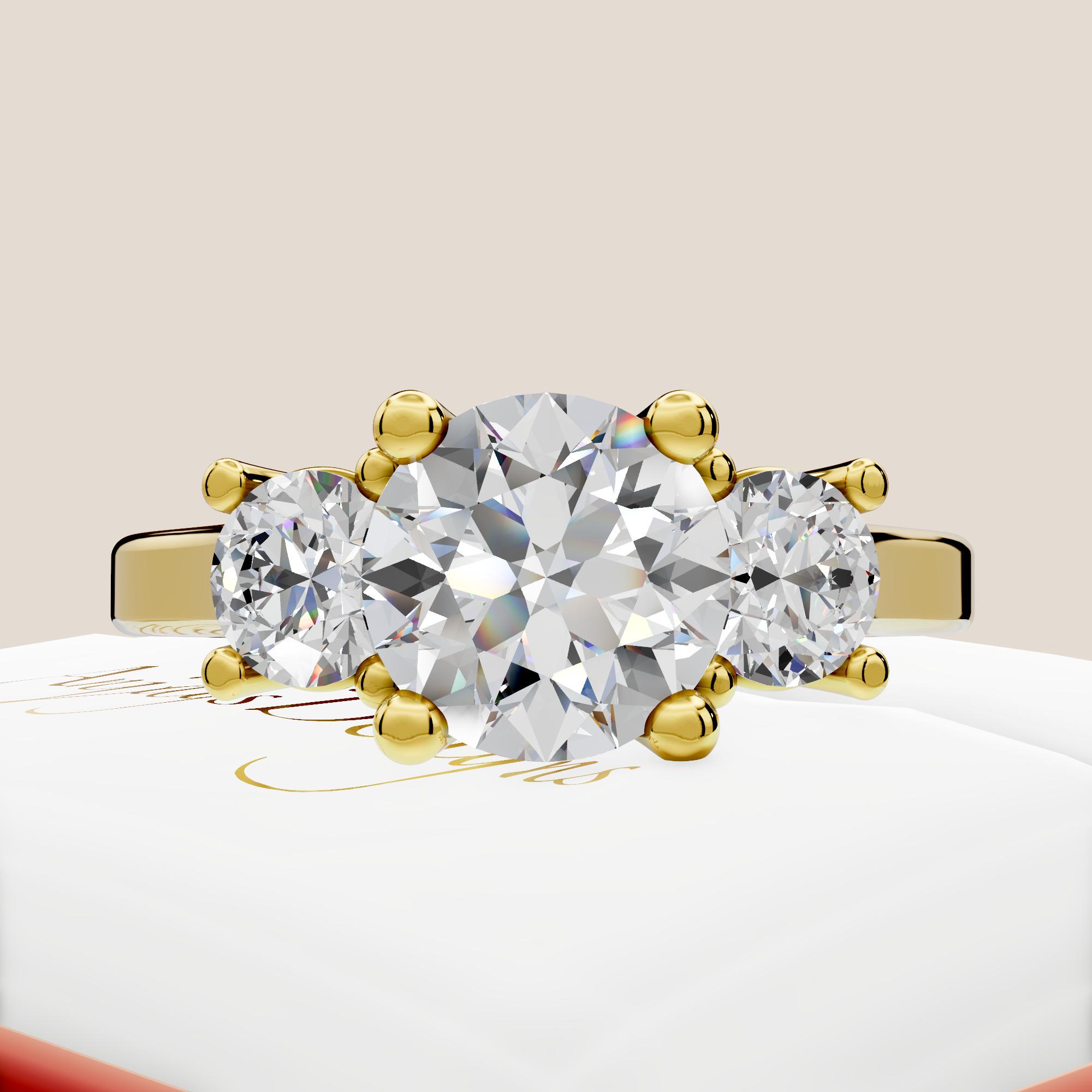 This 1.4 carat three stone engagement ring features a brilliant round cut lab grown diamond as the centerpiece, accented by round side diamonds for added brilliance. Crafted in solid 14k yellow gold, this timeless design symbolizes your past, present, and future together!