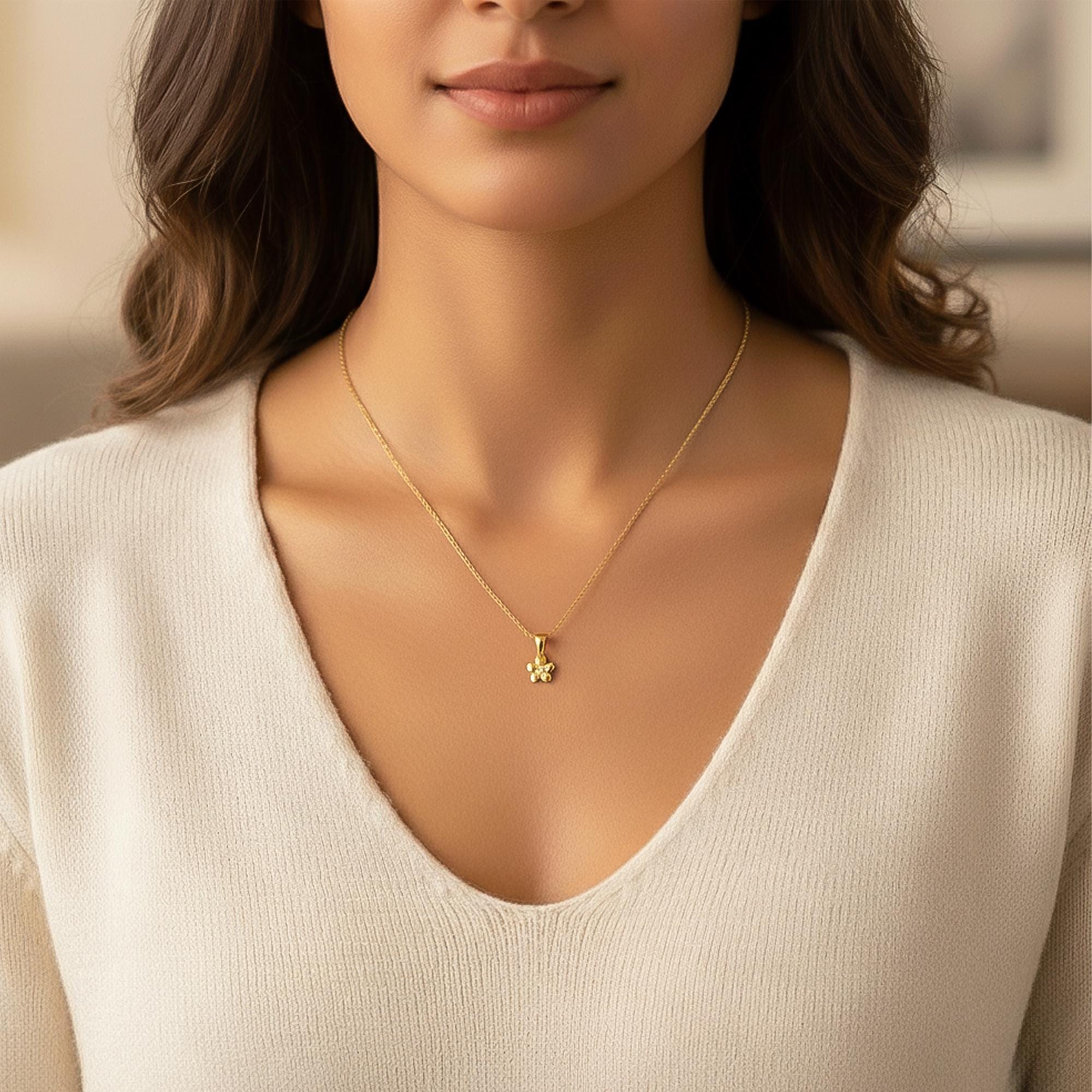This Diamond Flower Necklace is beautifully crafted in solid 14k yellow gold, featuring a brilliant lab grown diamond set at the heart of a delicate floral pendant. Designed with timeless elegance, this dainty charm necklace captures the beauty of nature with a refined touch, making it perfect for everyday wear or special occasions. Whether worn alone or layered, it’s a graceful and meaningful piece that adds a hint of sparkle to any look.