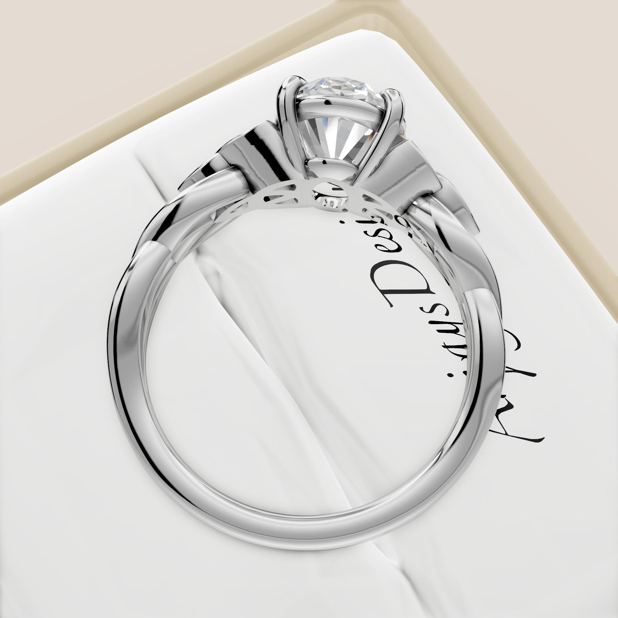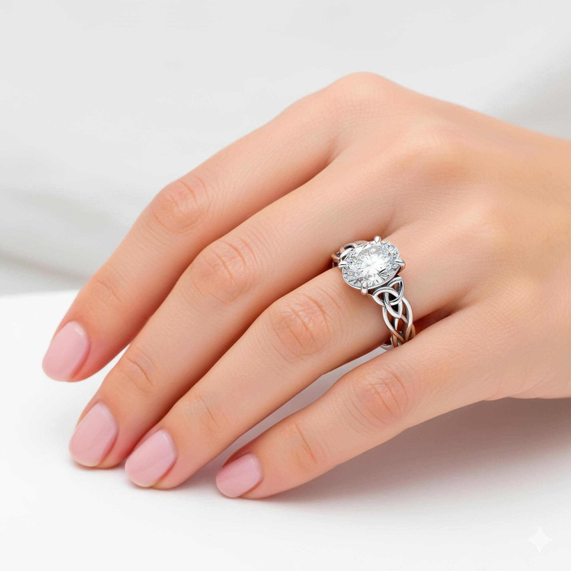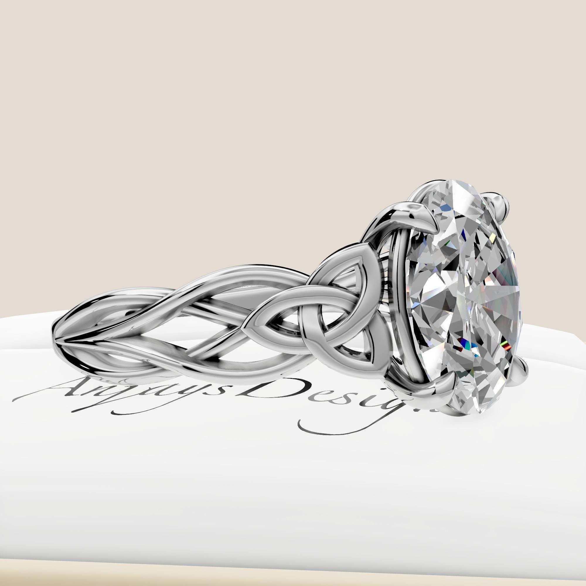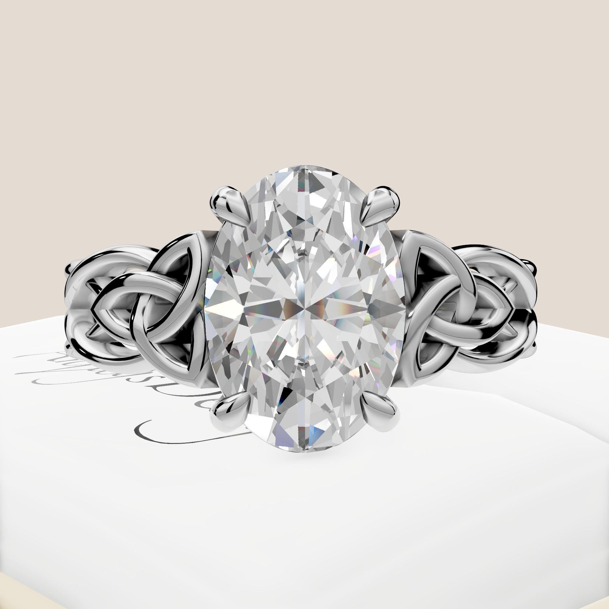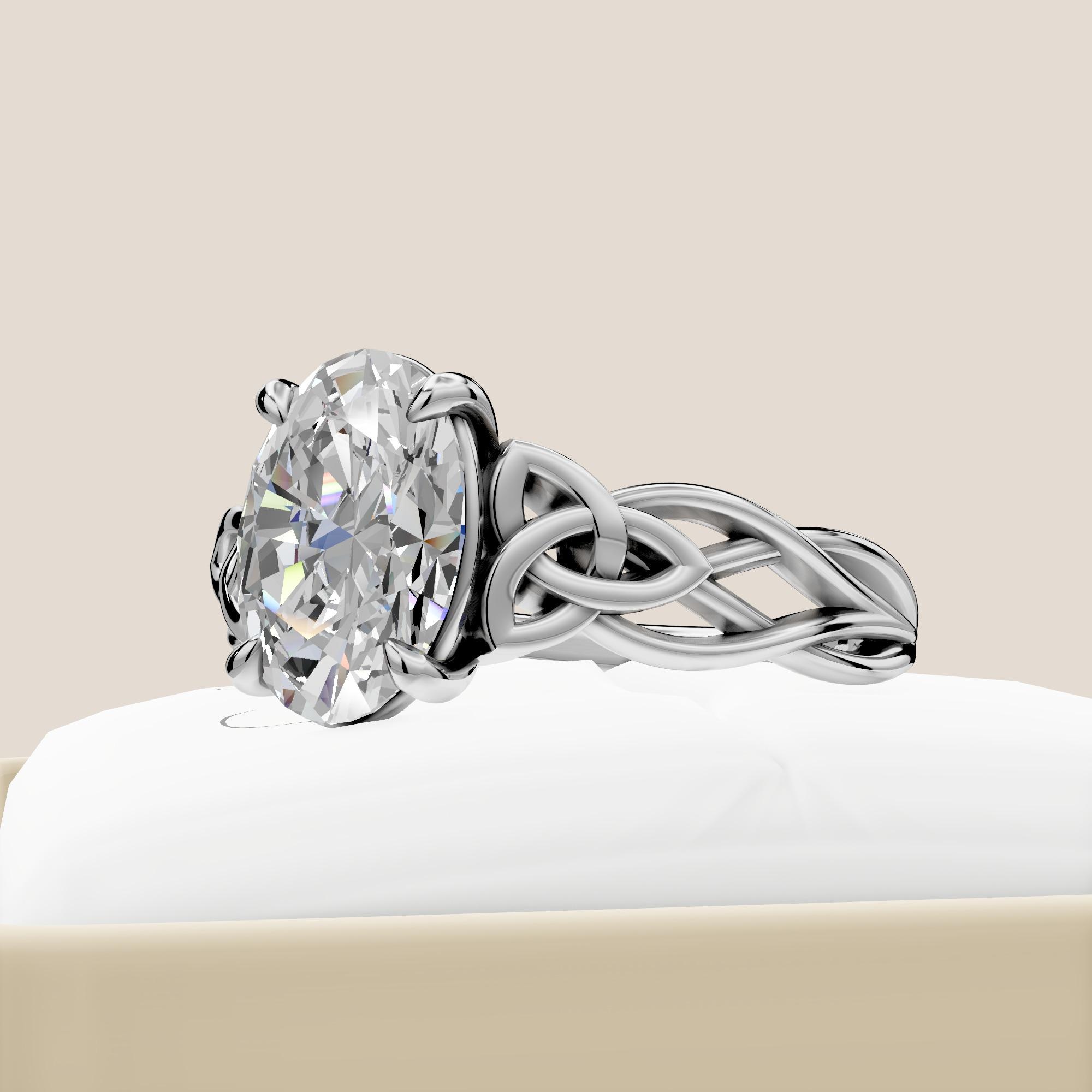 This Celtic knot engagement ring in 18k white gold features a brilliant lab grown 2 carat oval cut diamond set in a beautifully twisted design! Inspired by Irish heritage, the intricate knotwork symbolizes eternal love and unity. Handcrafted with exceptional detail, this Irish wedding ring blends tradition with modern elegance—a timeless symbol of devotion and commitment!