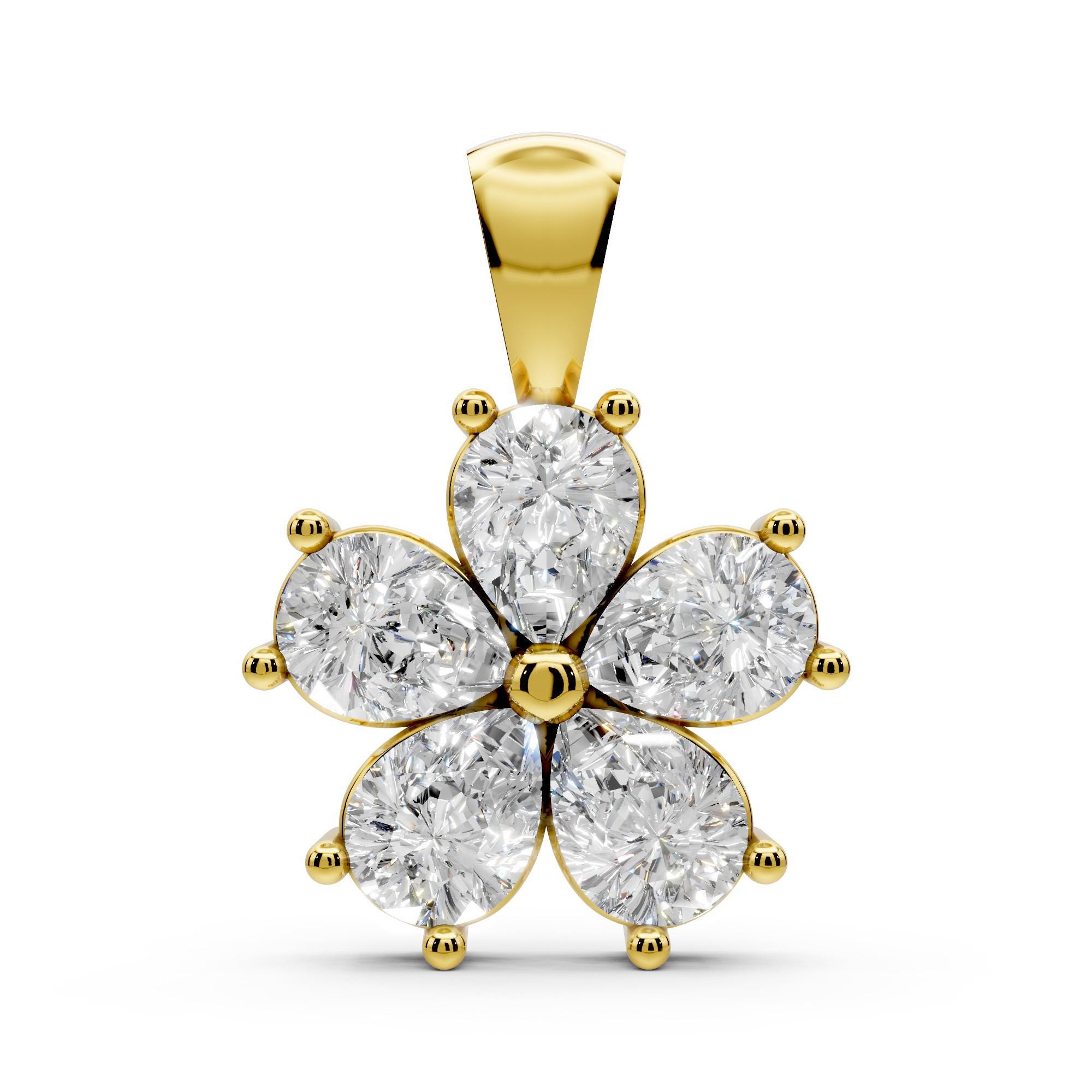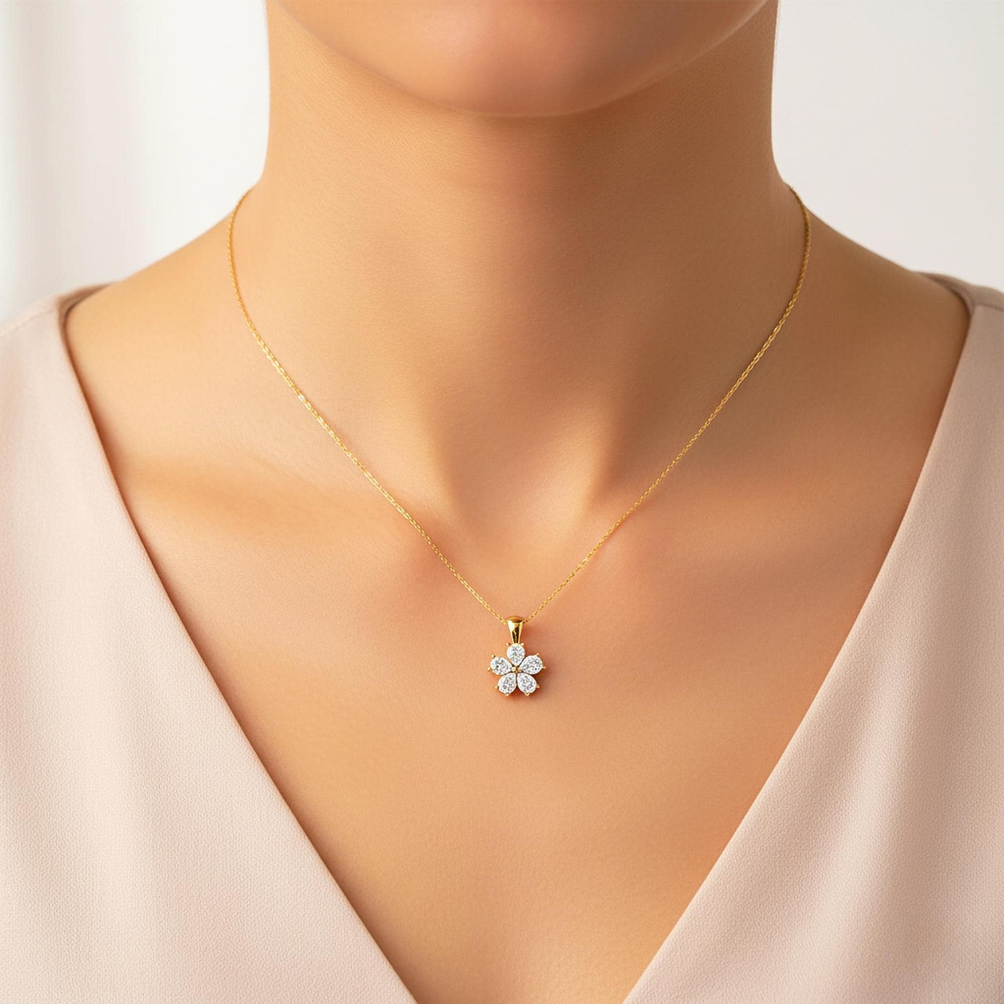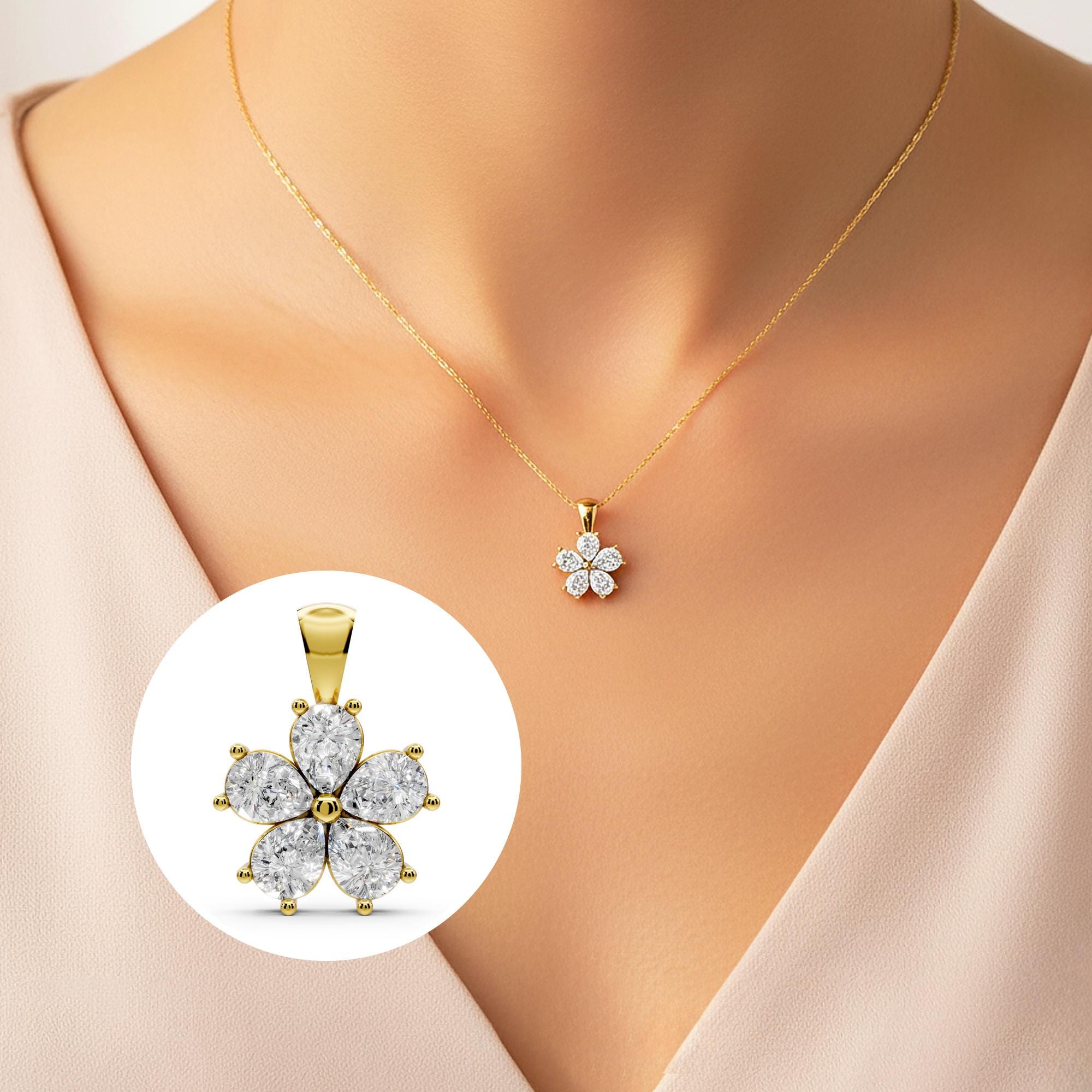 This Diamond Flower Pendant Necklace in 14k yellow gold features petals crafted from exquisite lab grown pear shaped diamonds, forming a graceful floral silhouette. The delicate arrangement of diamonds gives it a refined, timeless beauty. Perfect as a dainty minimalist pendant, this piece radiates natural elegance and makes a stunning gift or everyday statement of sophistication.