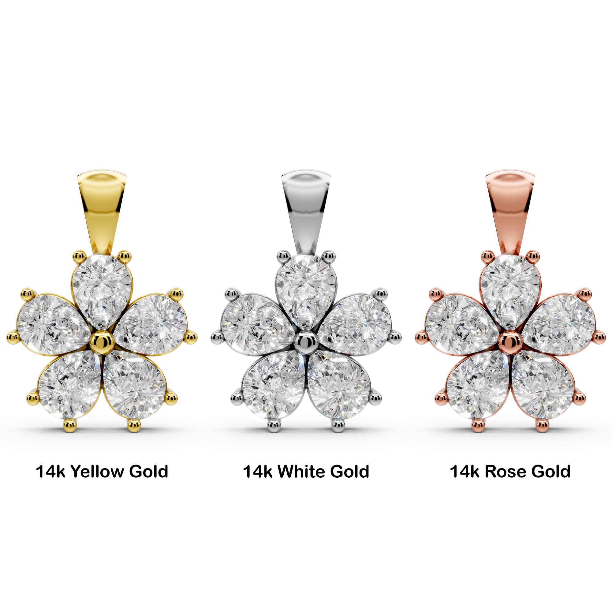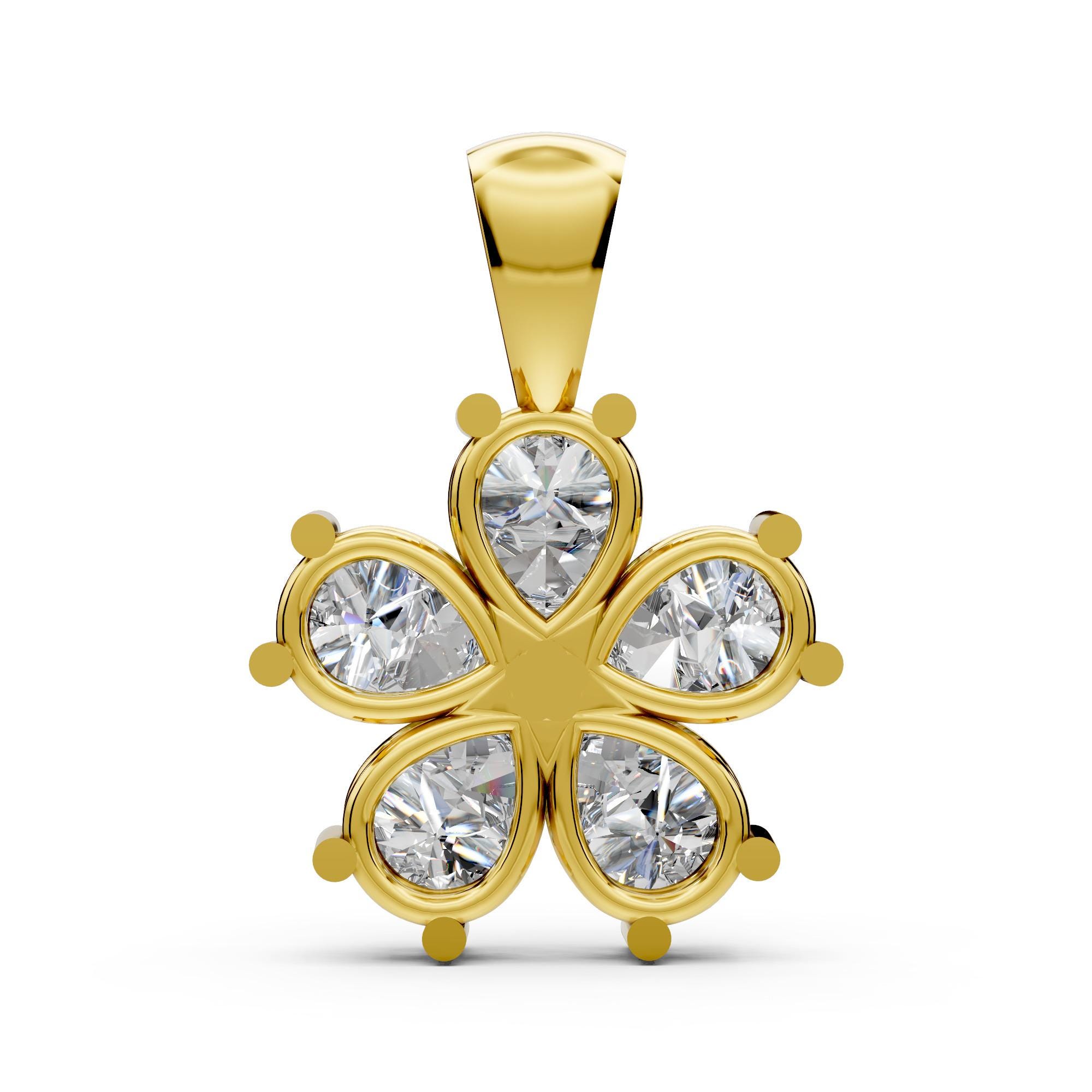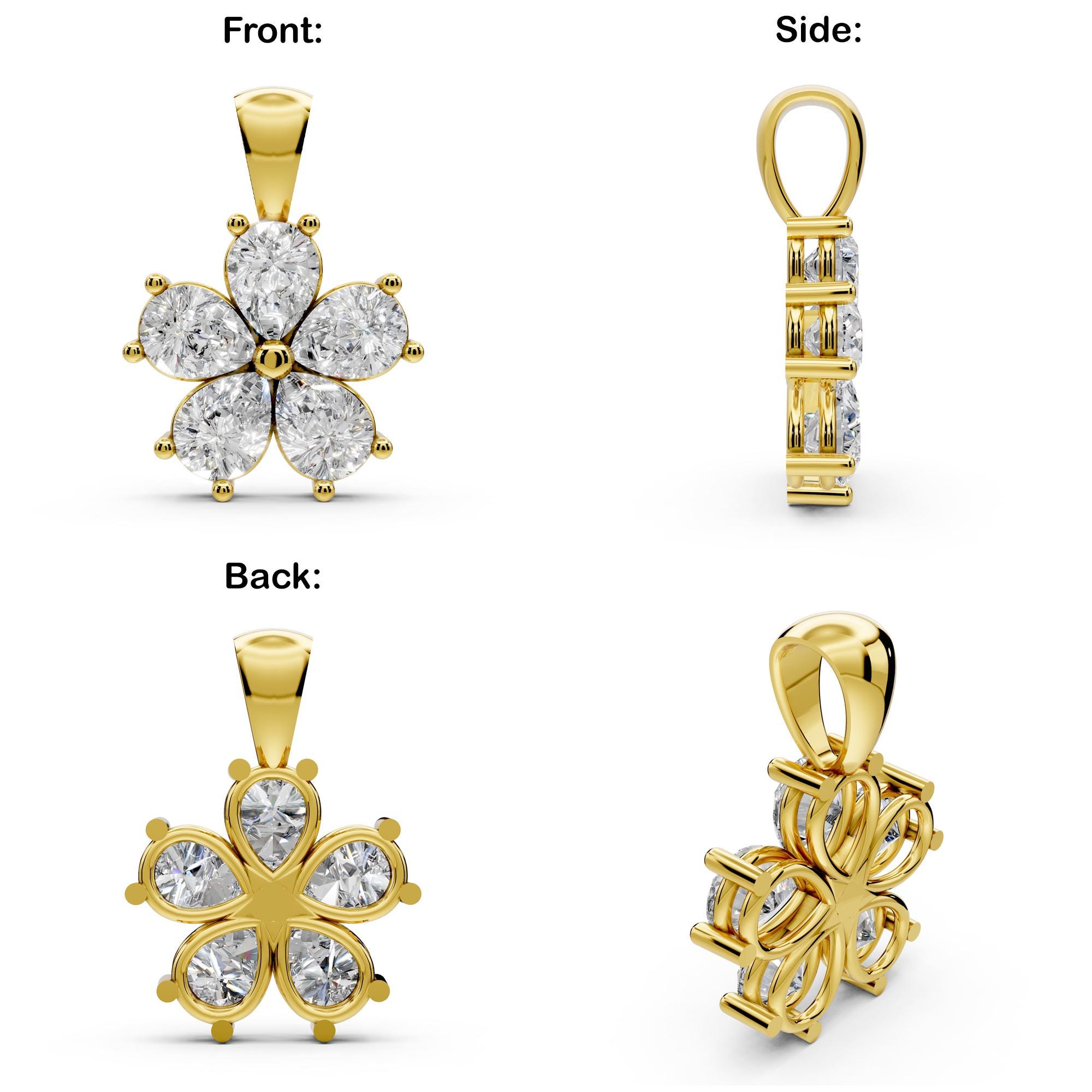This Diamond Flower Pendant Necklace in 14k yellow gold features petals crafted from exquisite lab grown pear shaped diamonds, forming a graceful floral silhouette. The delicate arrangement of diamonds gives it a refined, timeless beauty. Perfect as a dainty minimalist pendant, this piece radiates natural elegance and makes a stunning gift or everyday statement of sophistication.