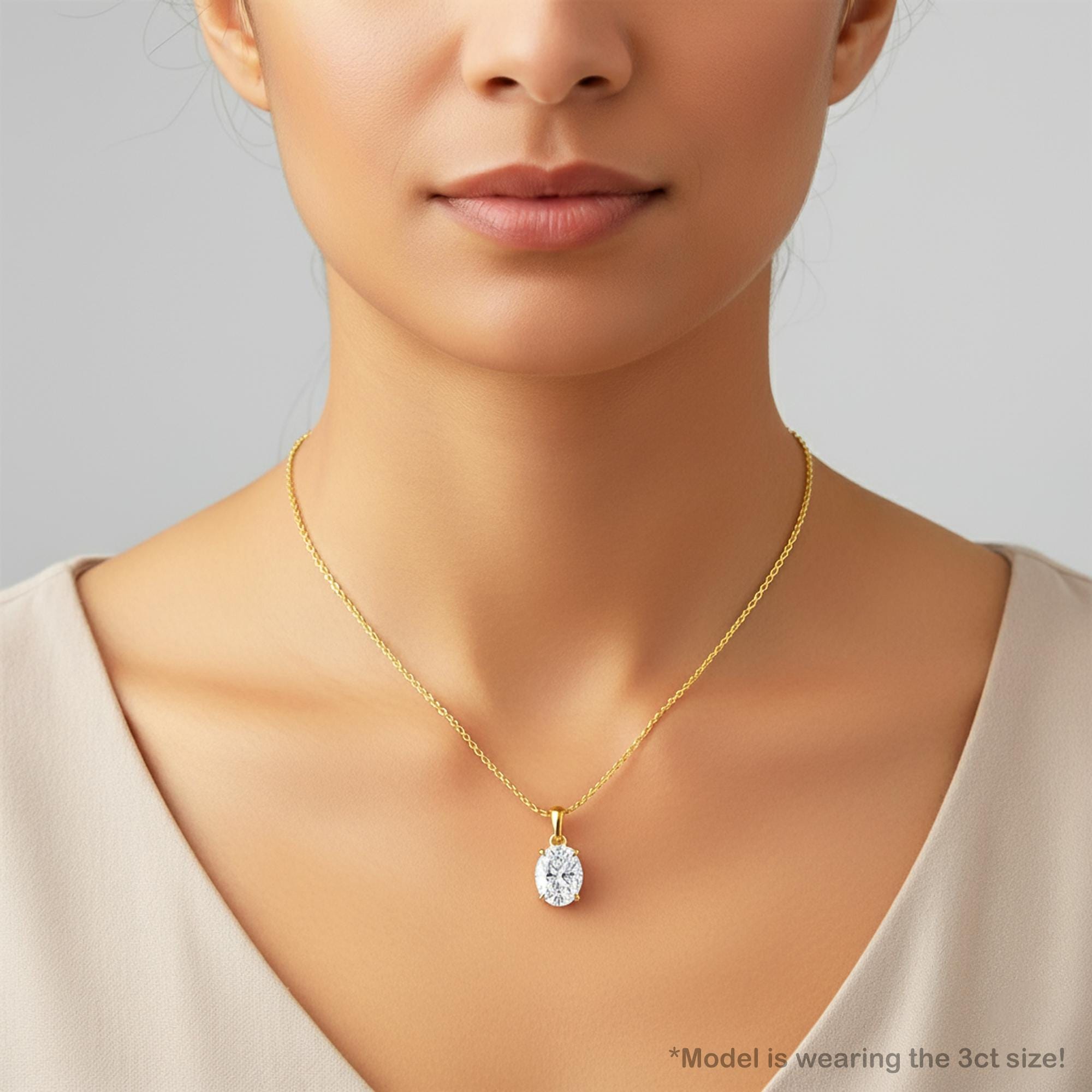 The model is wearing the 3 carat diamond pendant size.