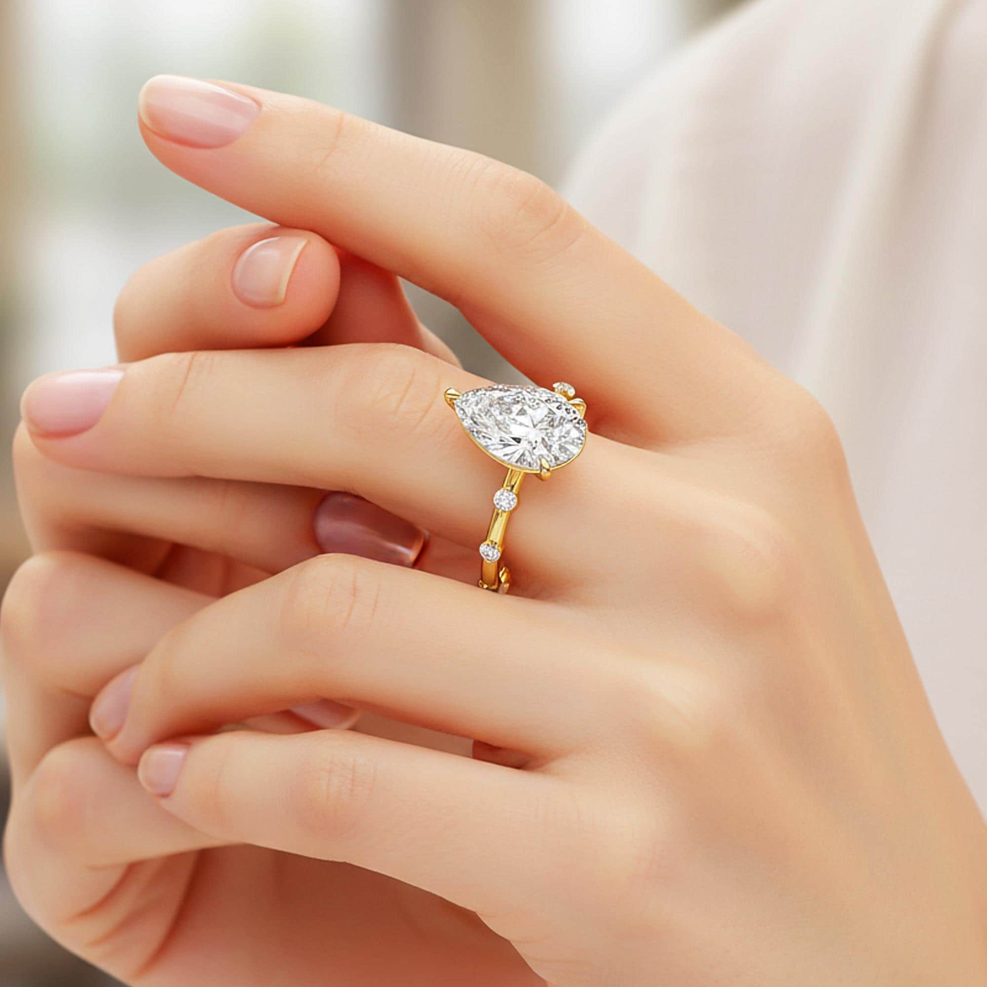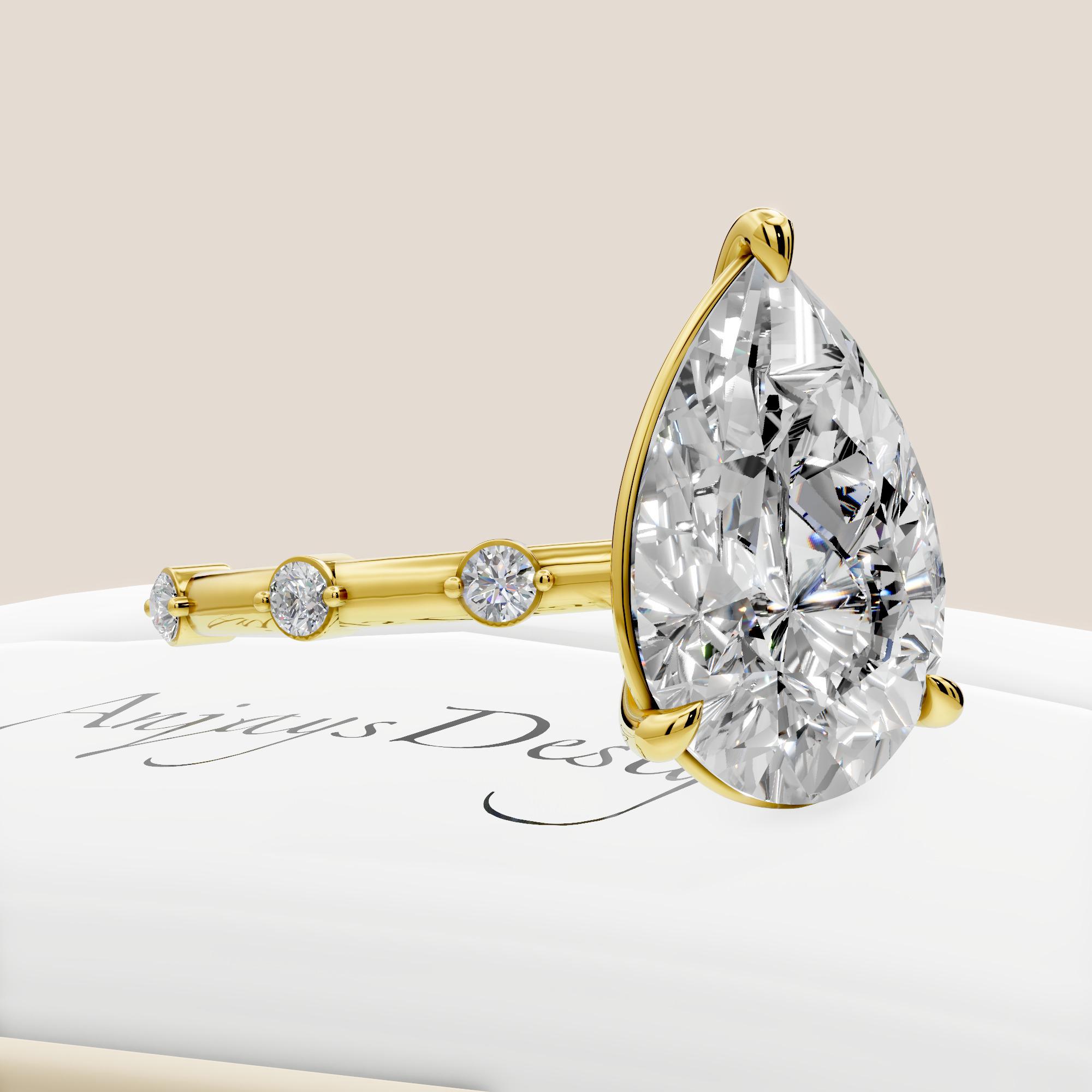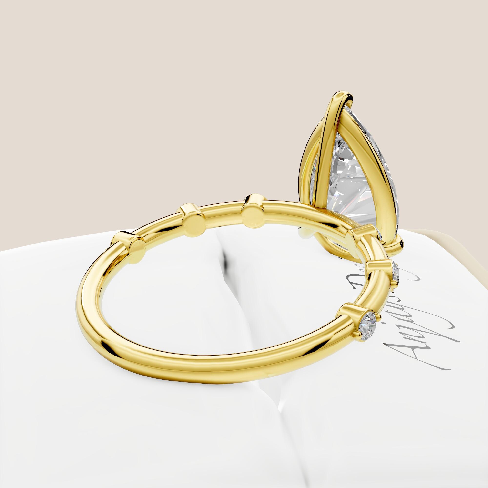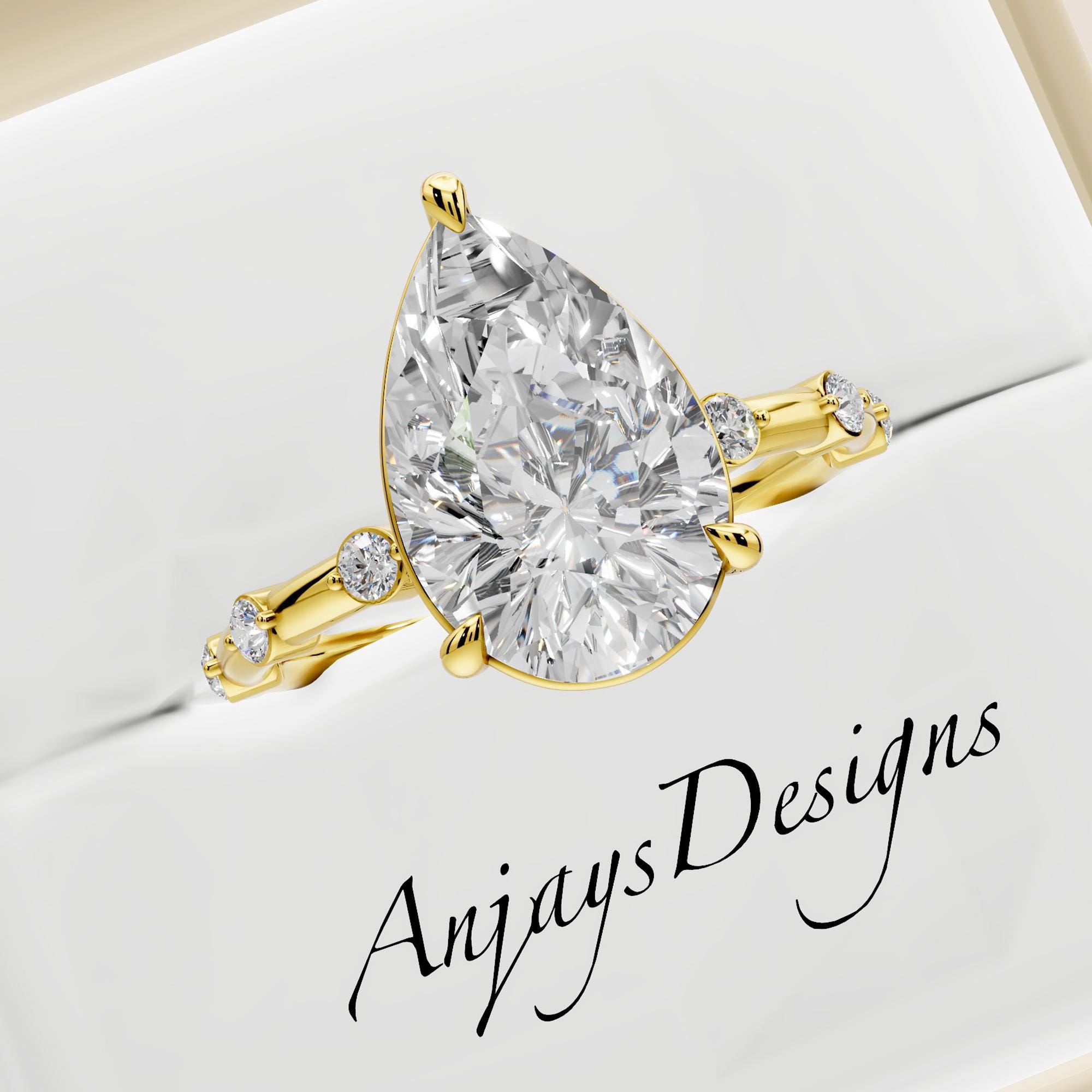 This 3 carat pear diamond engagement ring is beautifully crafted in 14k yellow gold, showcasing a stunning pear-cut lab grown diamond set in a nature-inspired design! The elegant, dainty band highlights the diamond’s brilliance while maintaining a delicate, organic look. A perfect choice for those who love timeless beauty with a touch of natural charm — ideal for an engagement or anniversary celebration.
