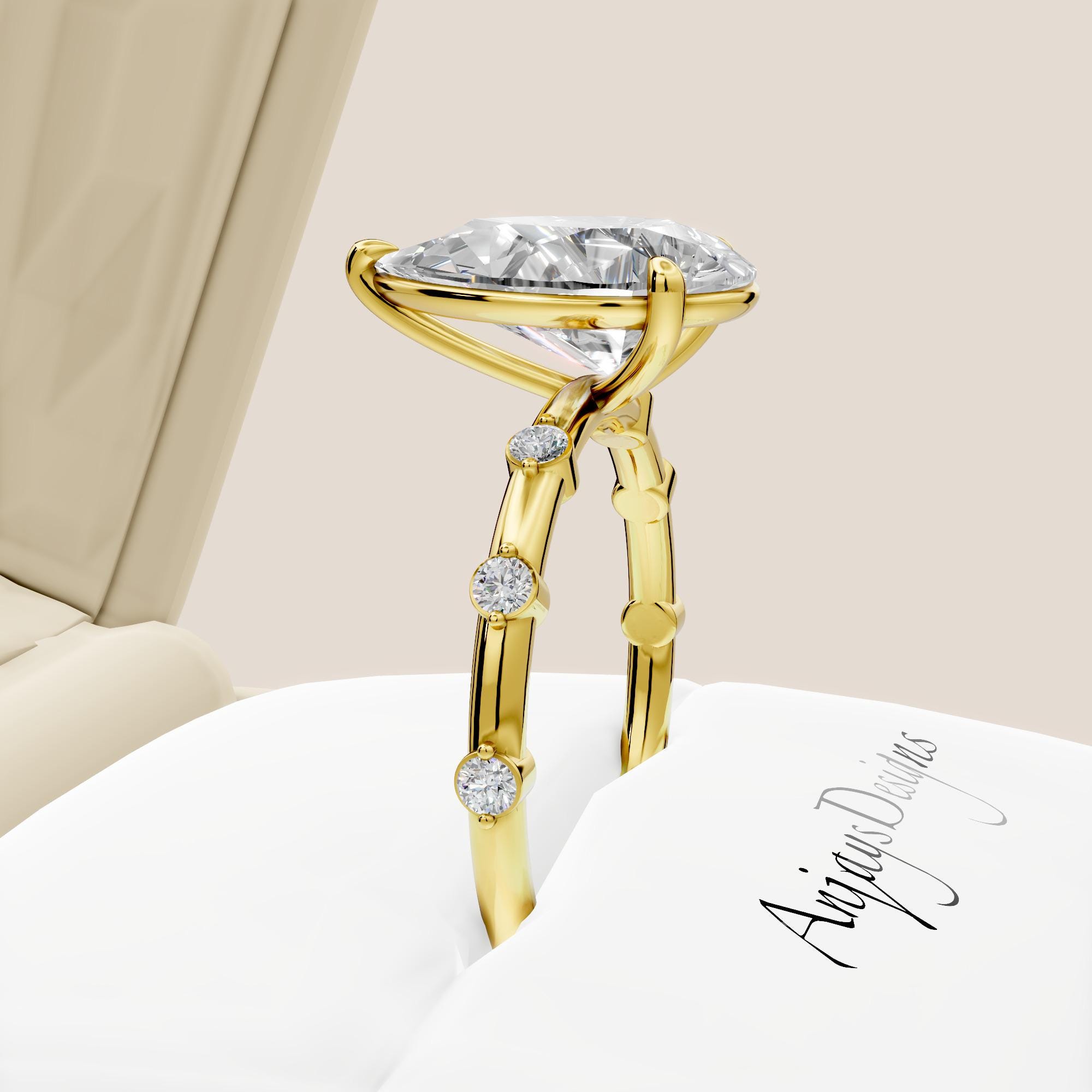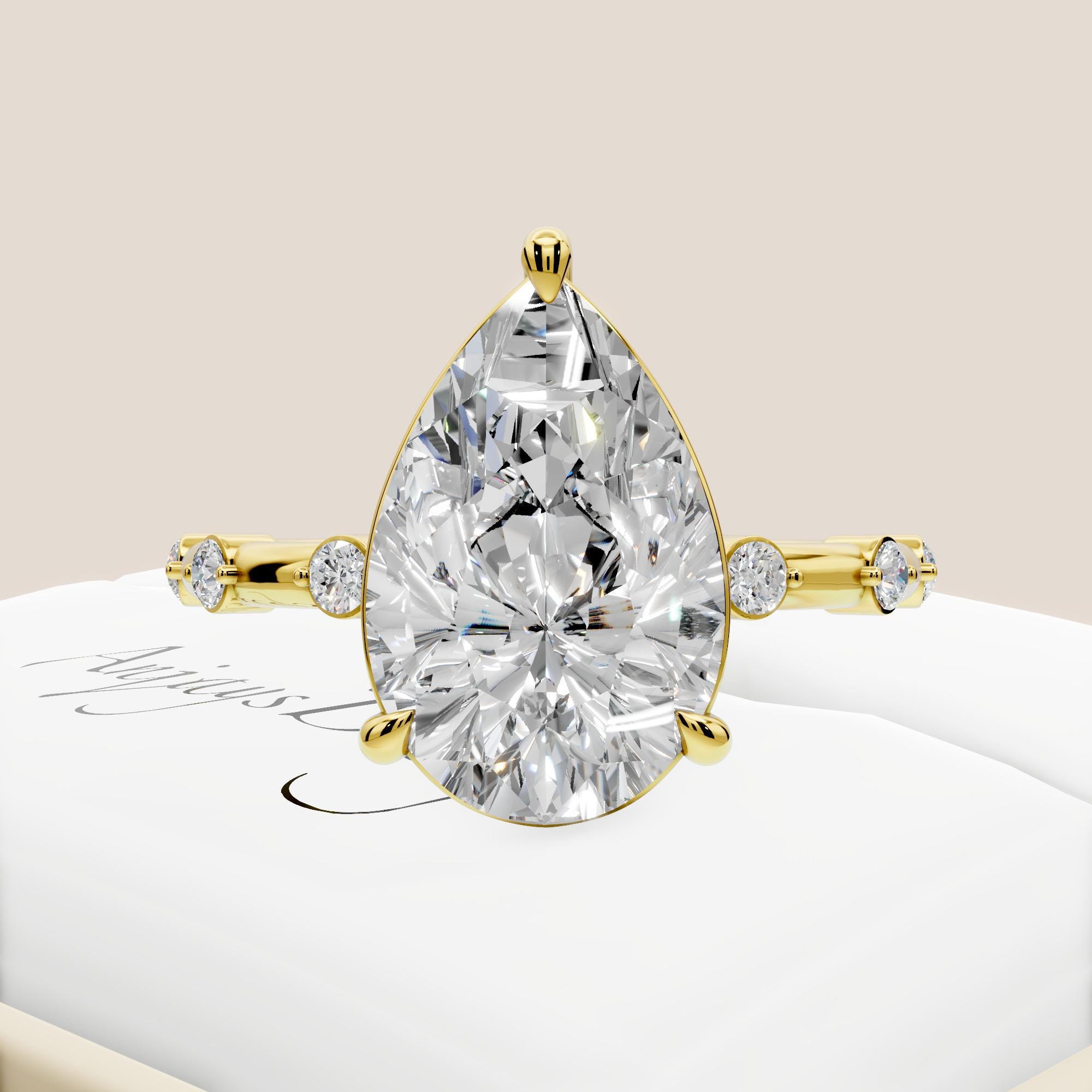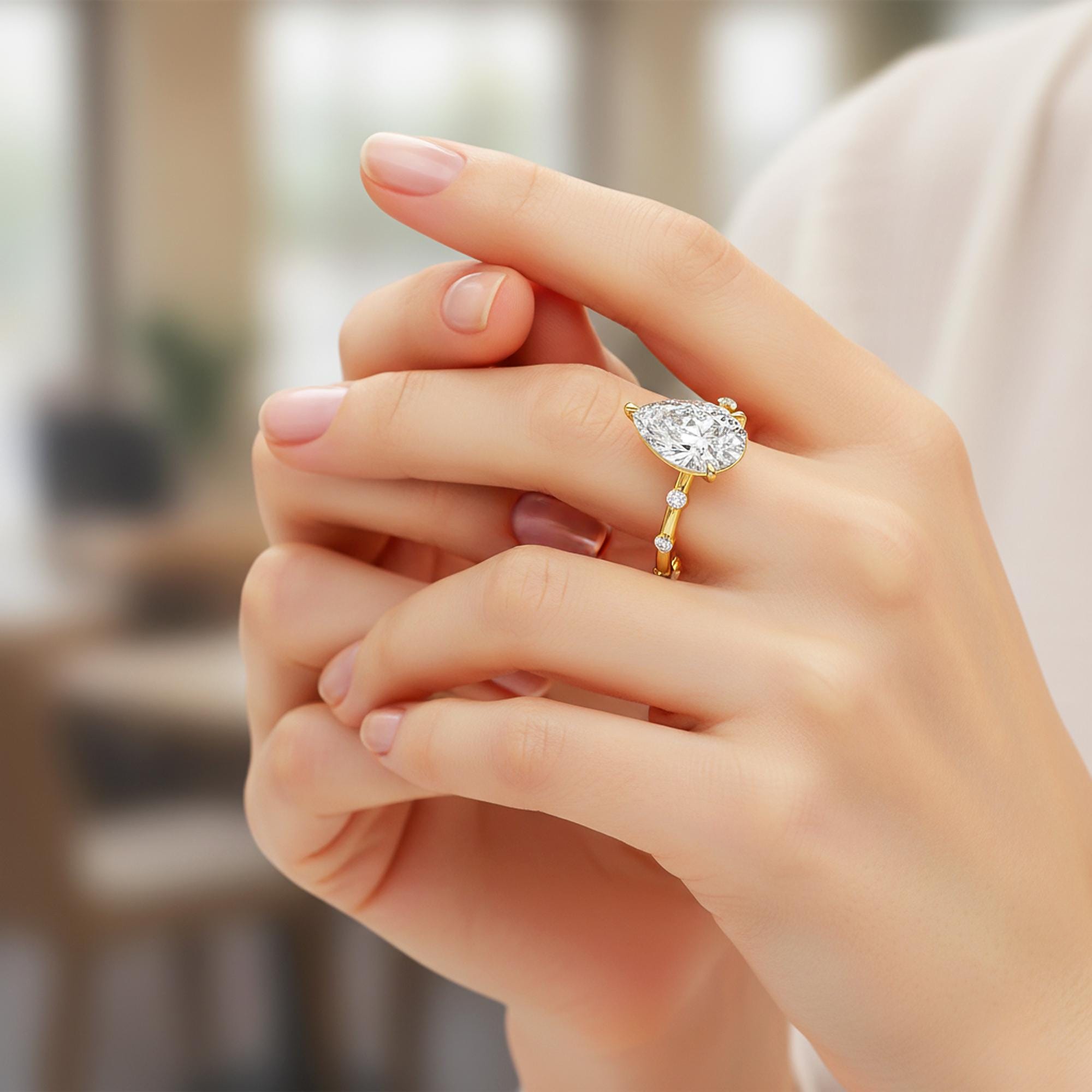 This 3 carat pear diamond engagement ring is beautifully crafted in 14k yellow gold, showcasing a stunning pear-cut lab grown diamond set in a nature-inspired design! The elegant, dainty band highlights the diamond’s brilliance while maintaining a delicate, organic look. A perfect choice for those who love timeless beauty with a touch of natural charm — ideal for an engagement or anniversary celebration.
