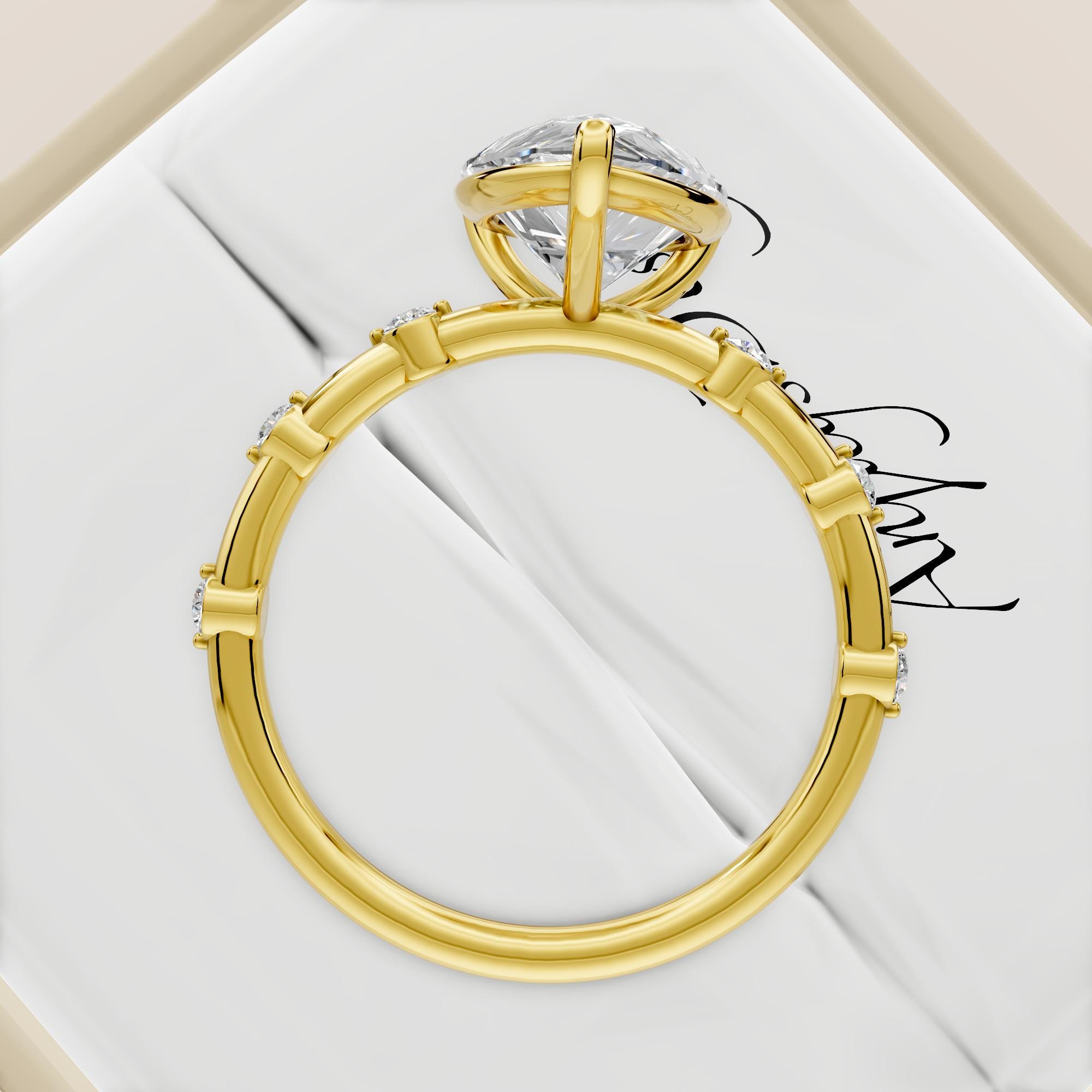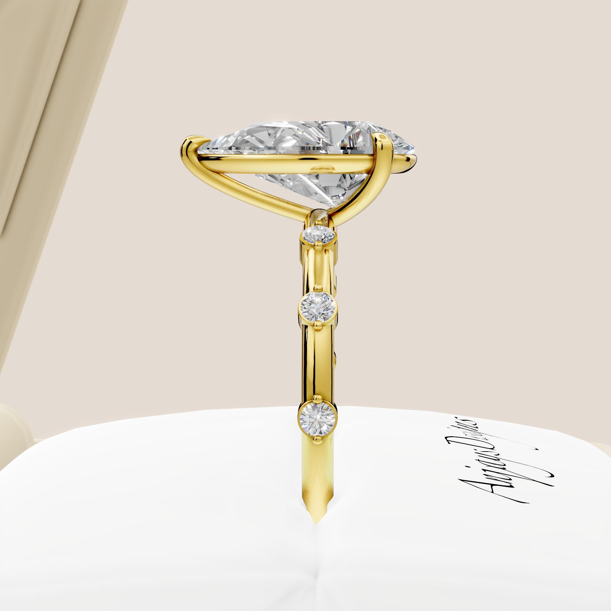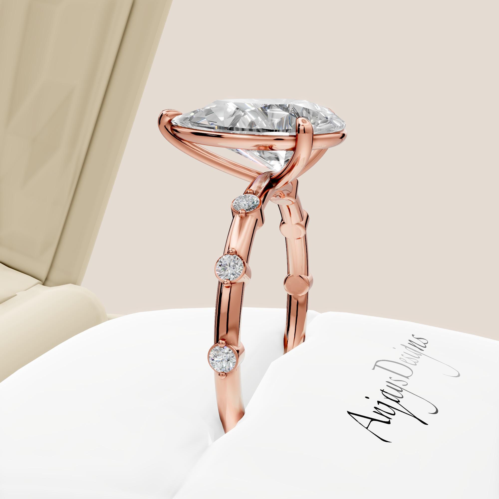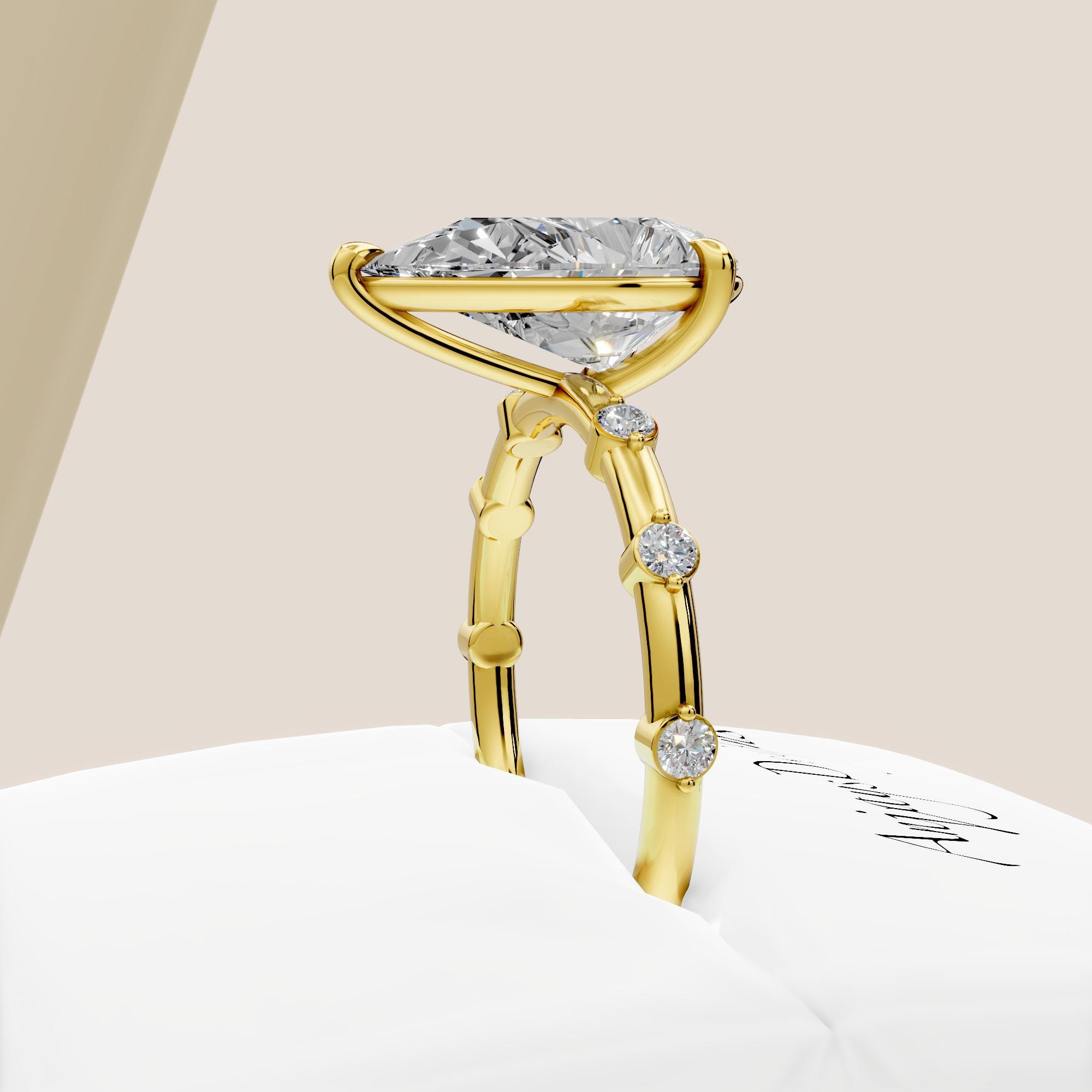 This 3 carat pear diamond engagement ring is beautifully crafted in 14k yellow gold, showcasing a stunning pear-cut lab grown diamond set in a nature-inspired design! The elegant, dainty band highlights the diamond’s brilliance while maintaining a delicate, organic look. A perfect choice for those who love timeless beauty with a touch of natural charm — ideal for an engagement or anniversary celebration.