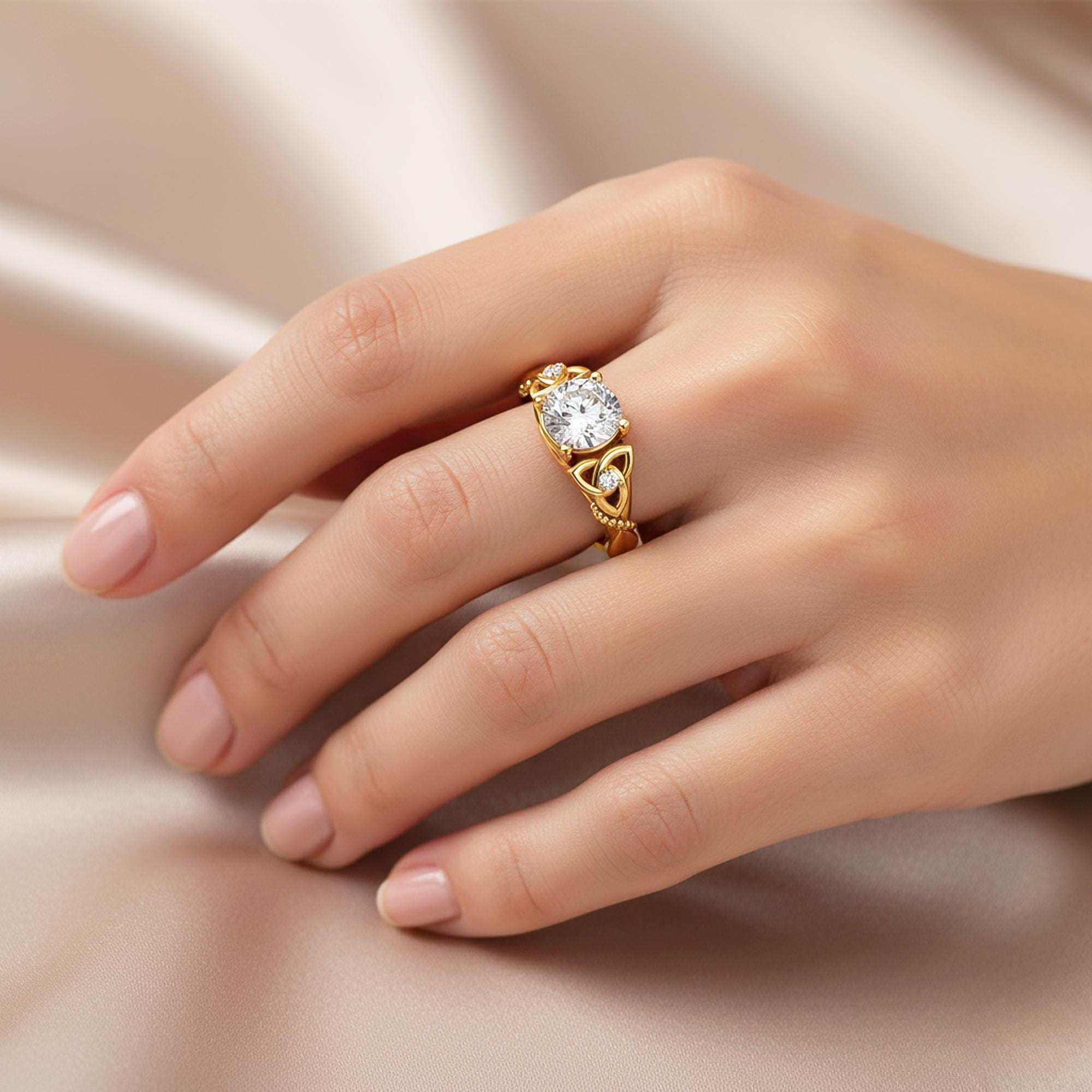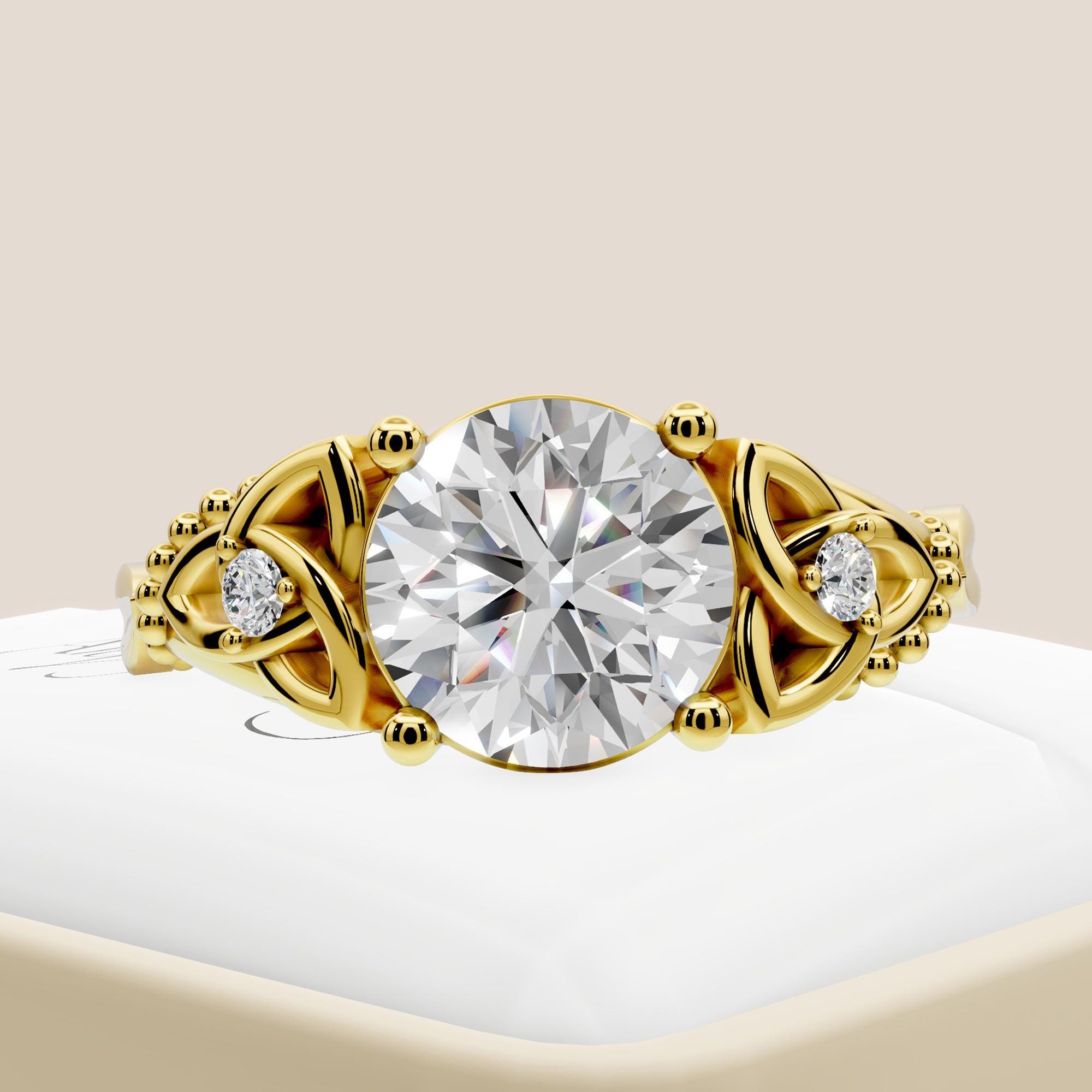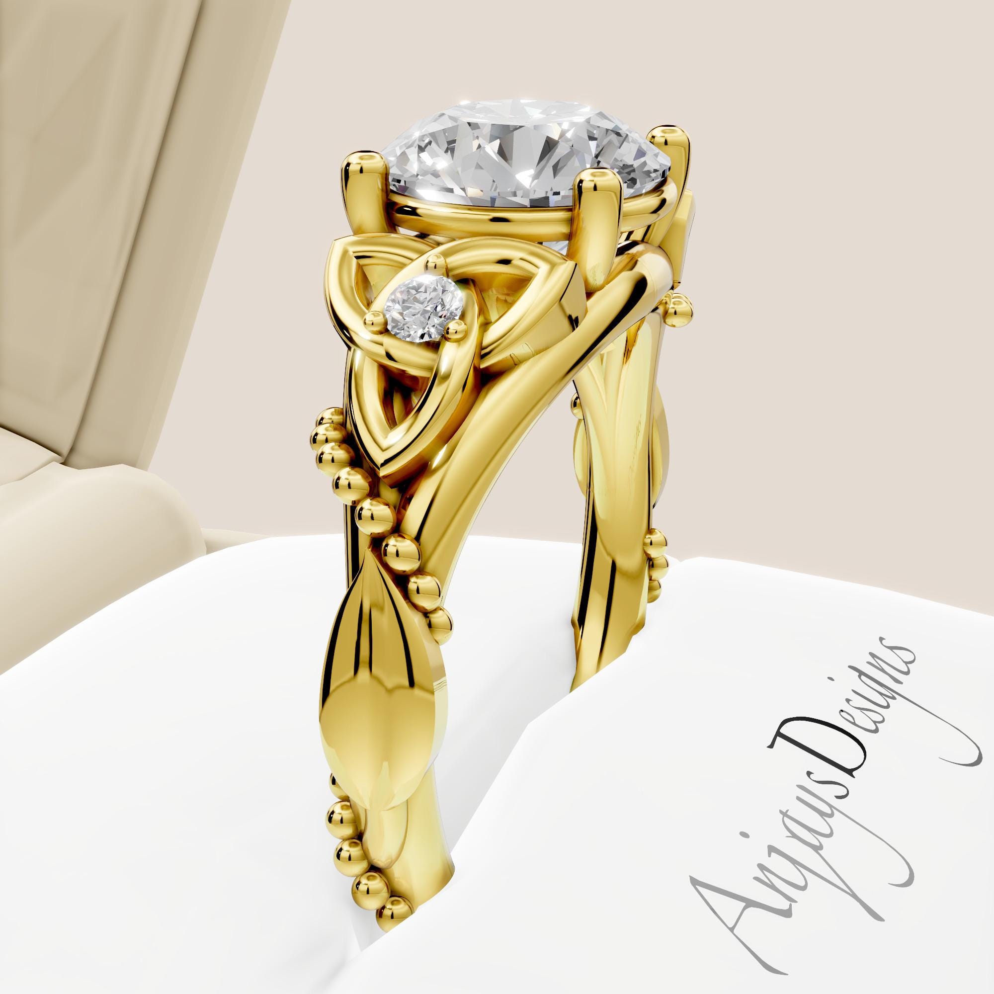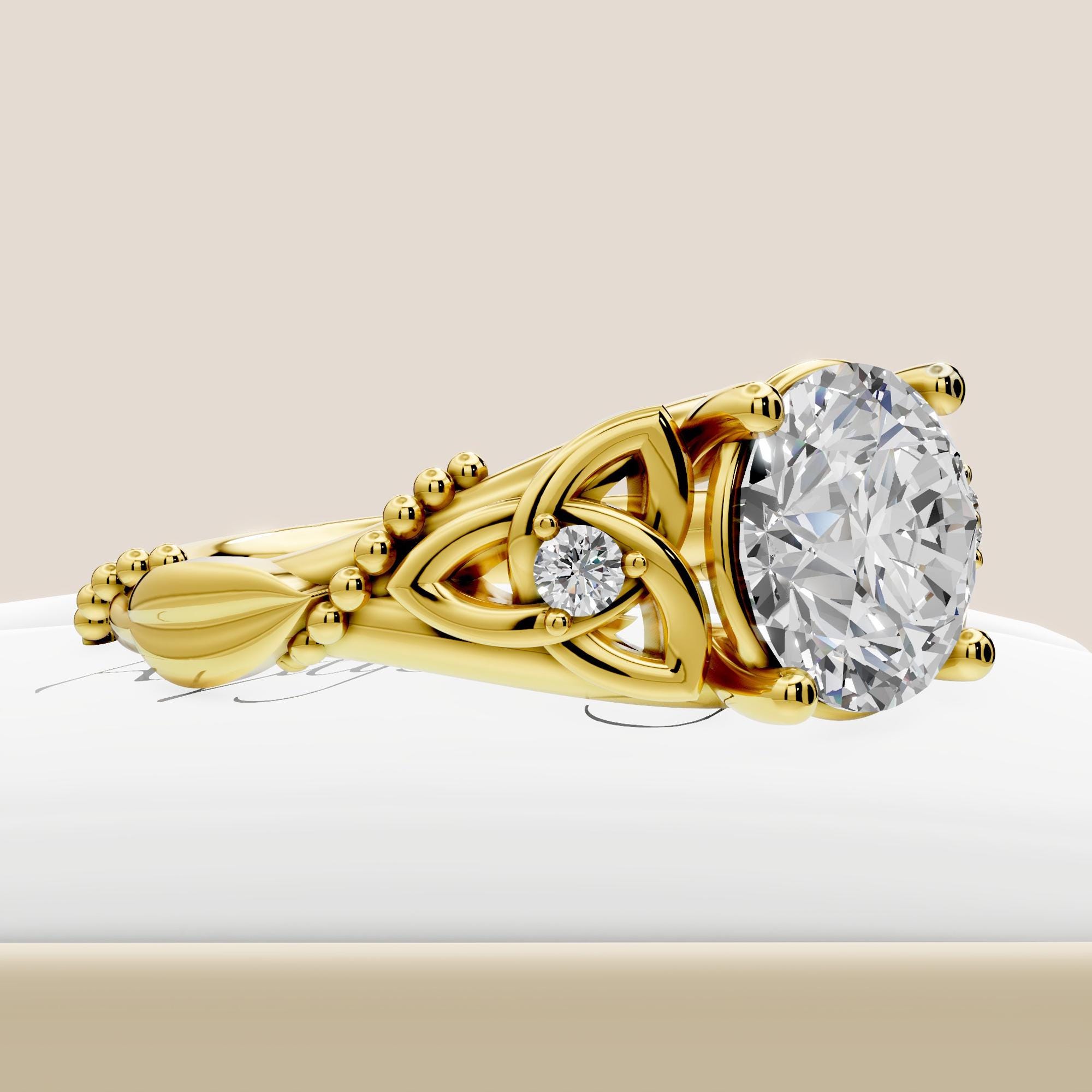 This stunning nature inspired engagement ring features a 2 carat round lab grown diamond set in 14k yellow gold! Adorning the center stone are Celtic trinity knots symbolizing love, unity, and eternity. The unique combination of Celtic and nature designs makes this wedding ring a perfect choice for those who value beauty and meaning in their jewelry!