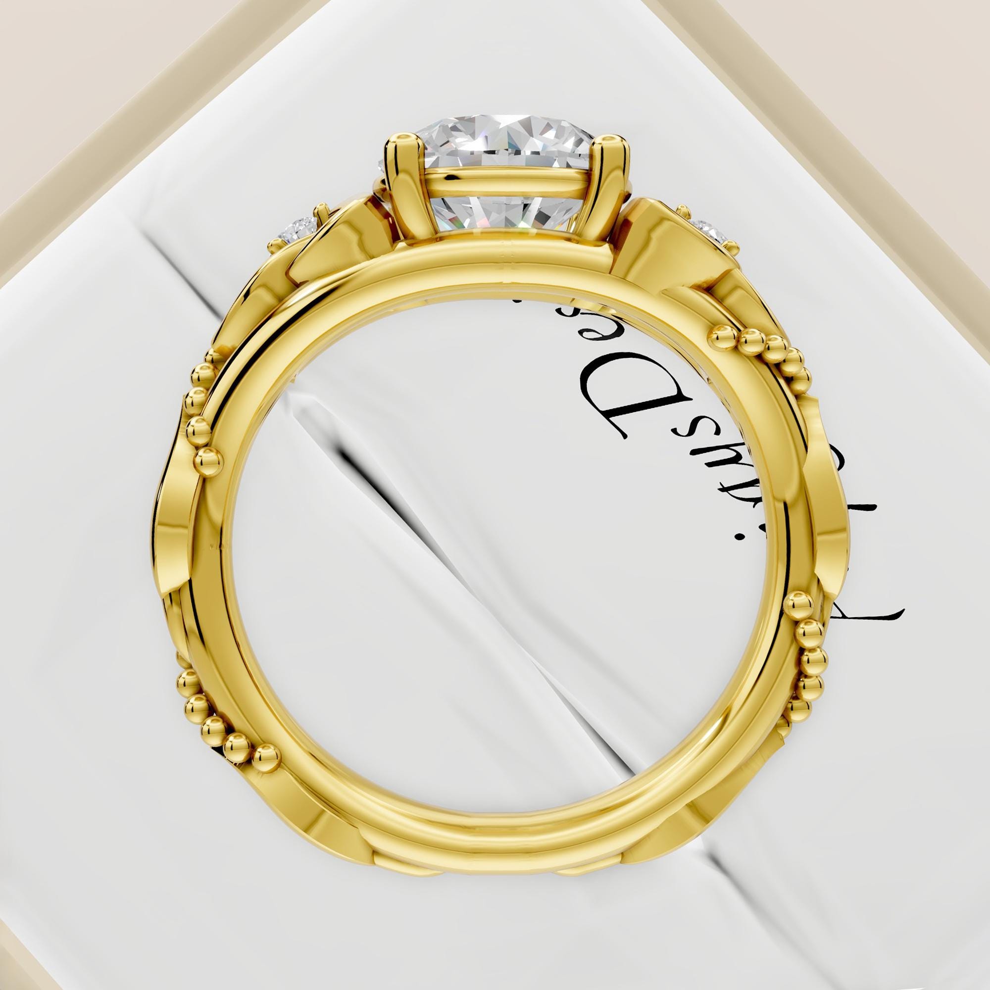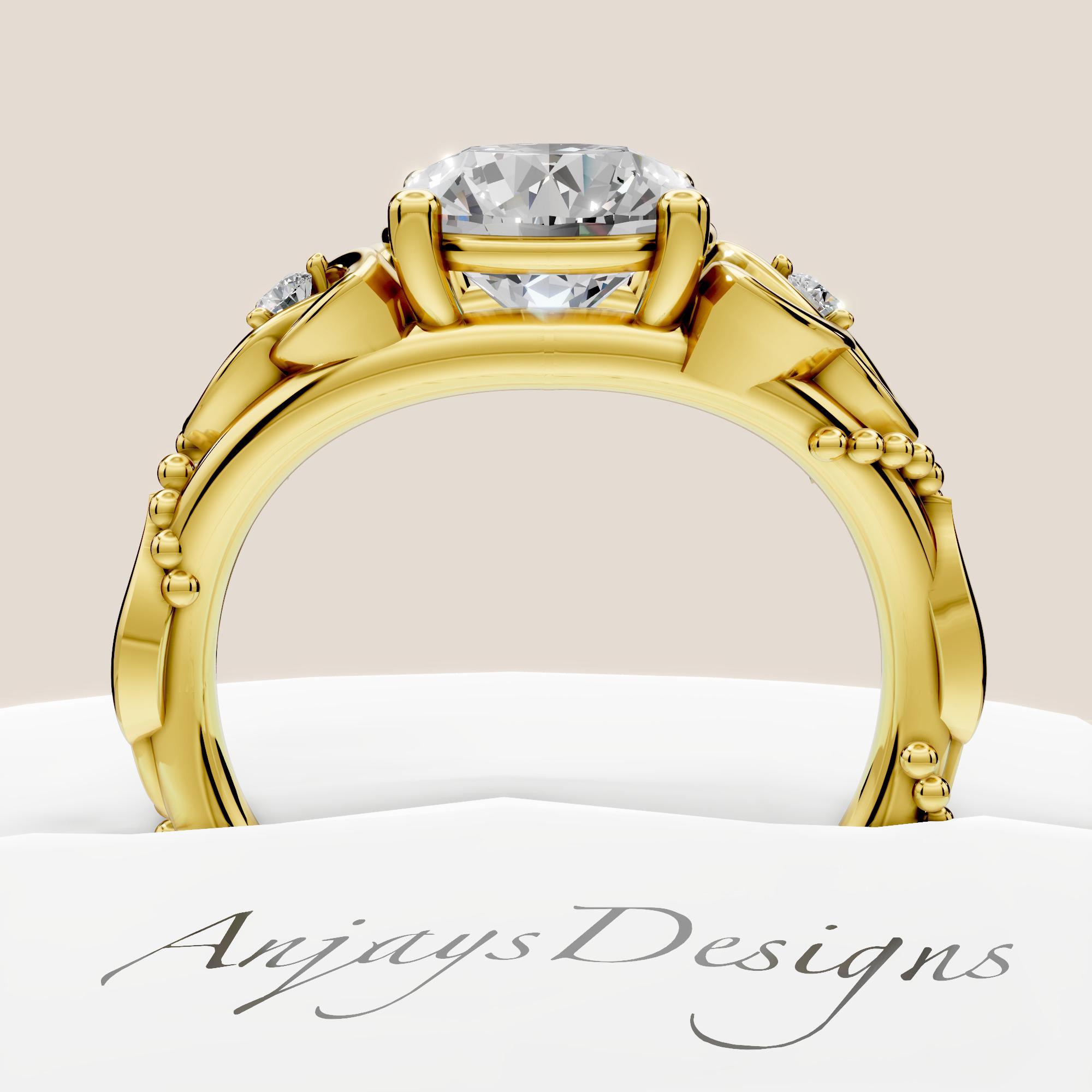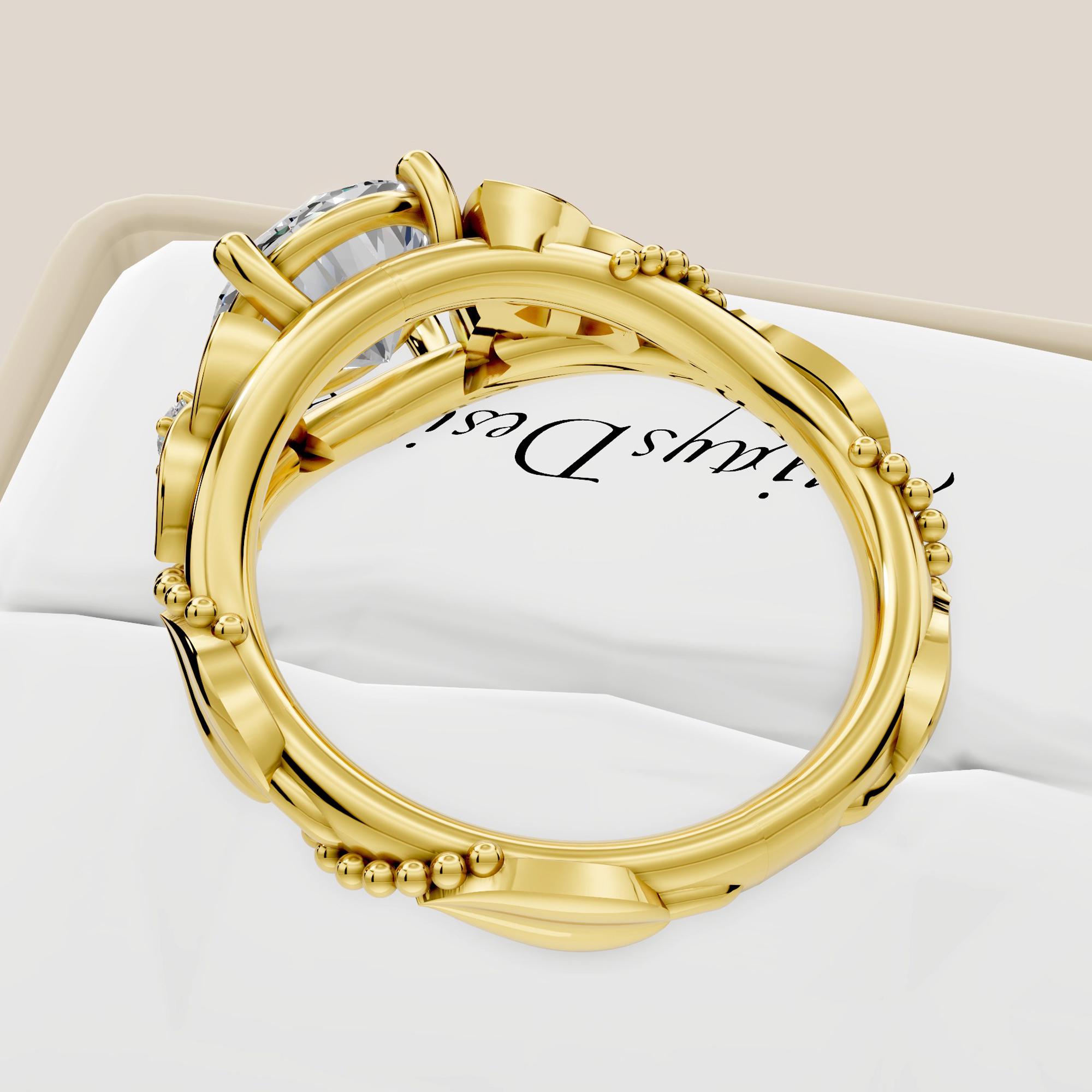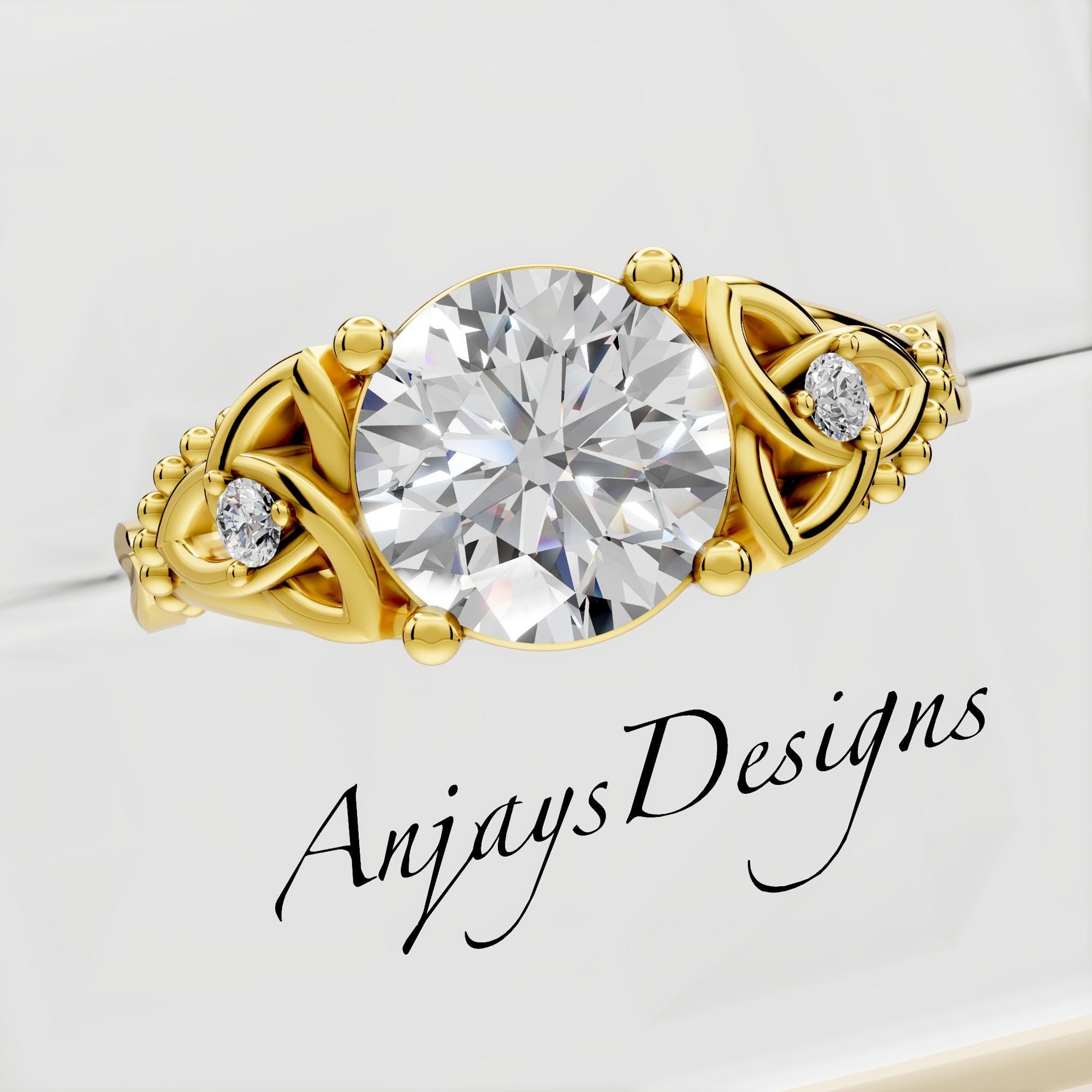 This stunning nature inspired engagement ring features a 2 carat round lab grown diamond set in 14k yellow gold! Adorning the center stone are Celtic trinity knots symbolizing love, unity, and eternity. The unique combination of Celtic and nature designs makes this wedding ring a perfect choice for those who value beauty and meaning in their jewelry!