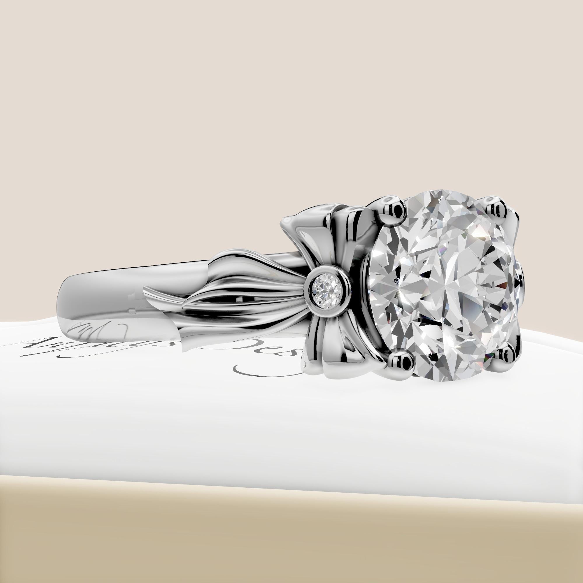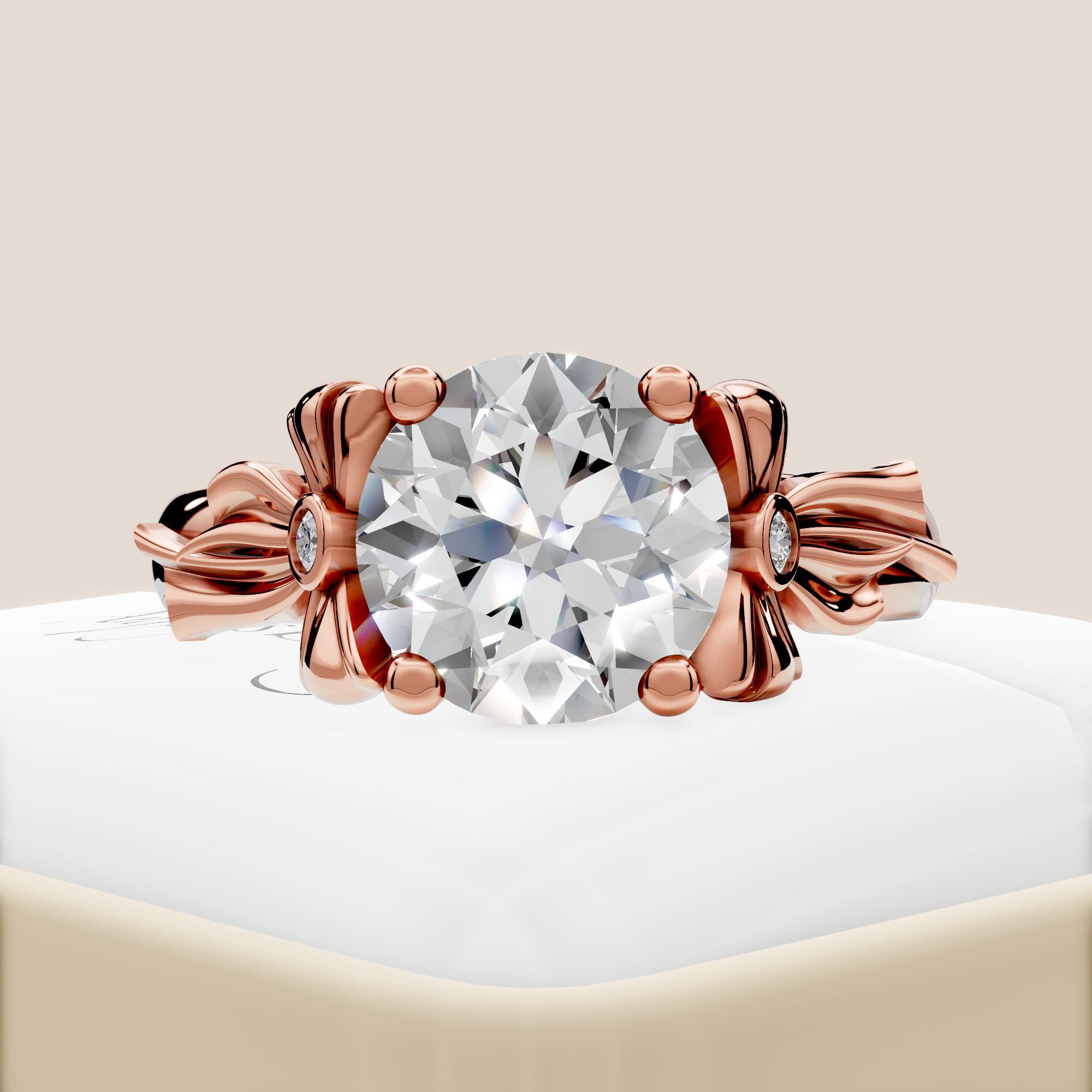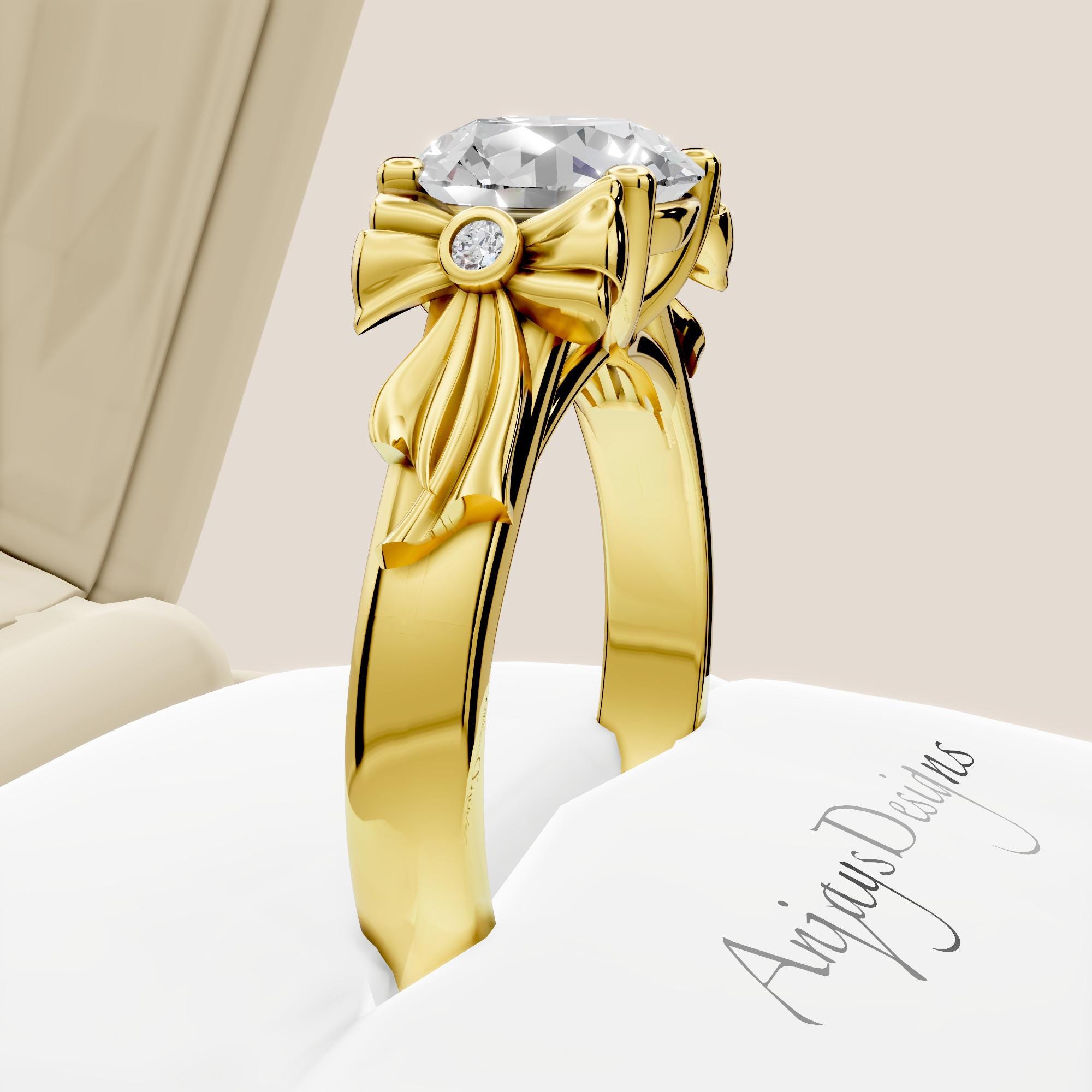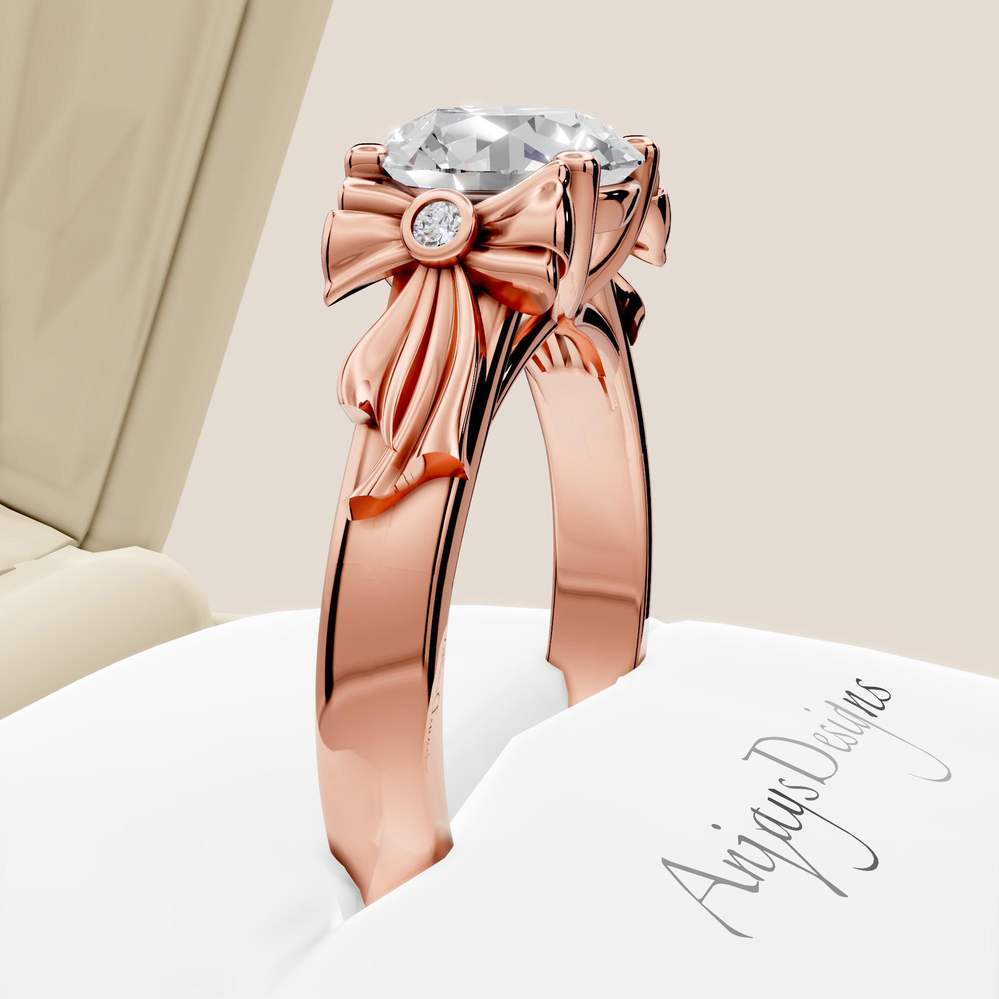 This unique diamond engagement ring features a round 2 carat lab grown diamond adorned by a bow tie design on each side. Made in solid gold, this minimalist wedding ring combines timeless charm with modern sophistication—a perfect symbol of everlasting love!