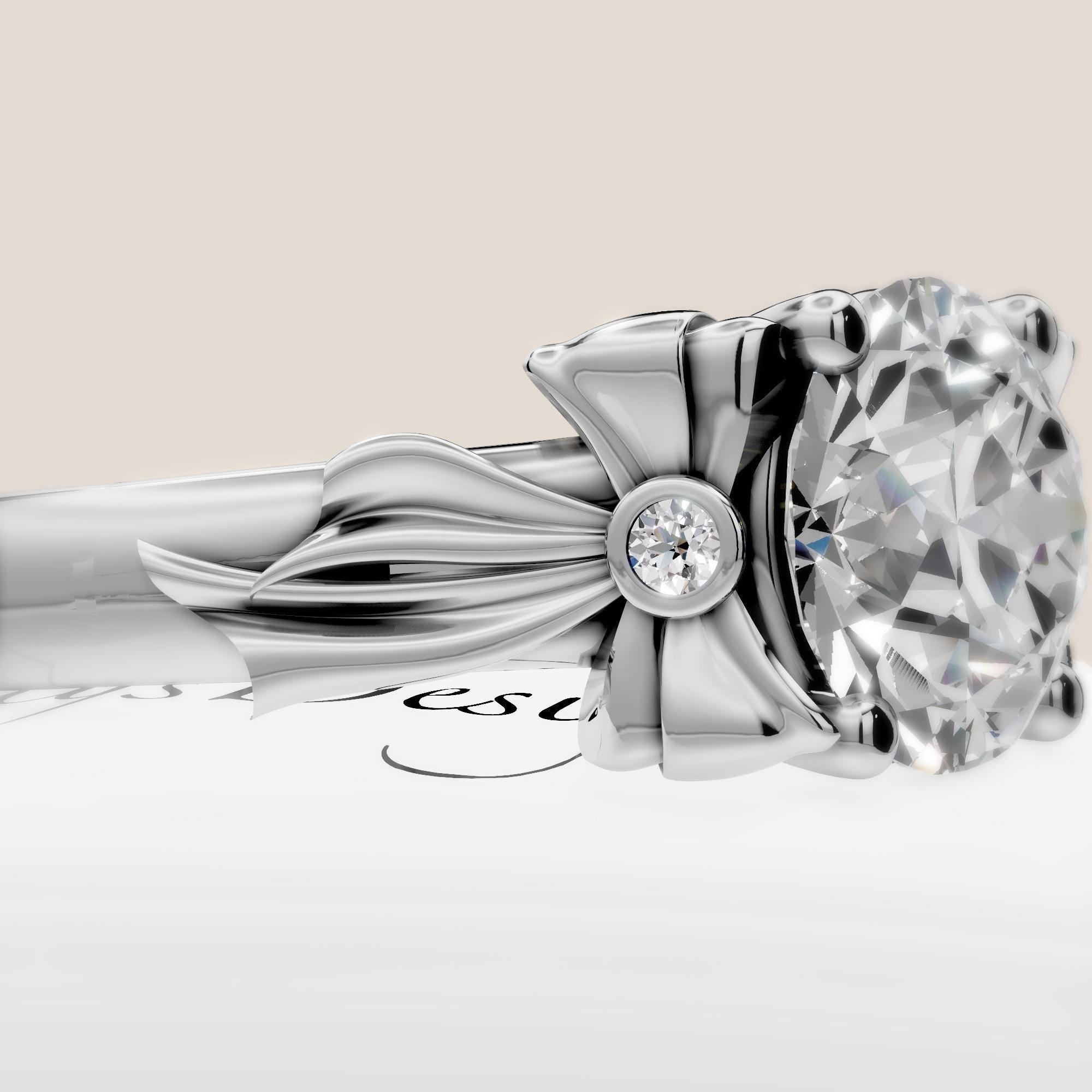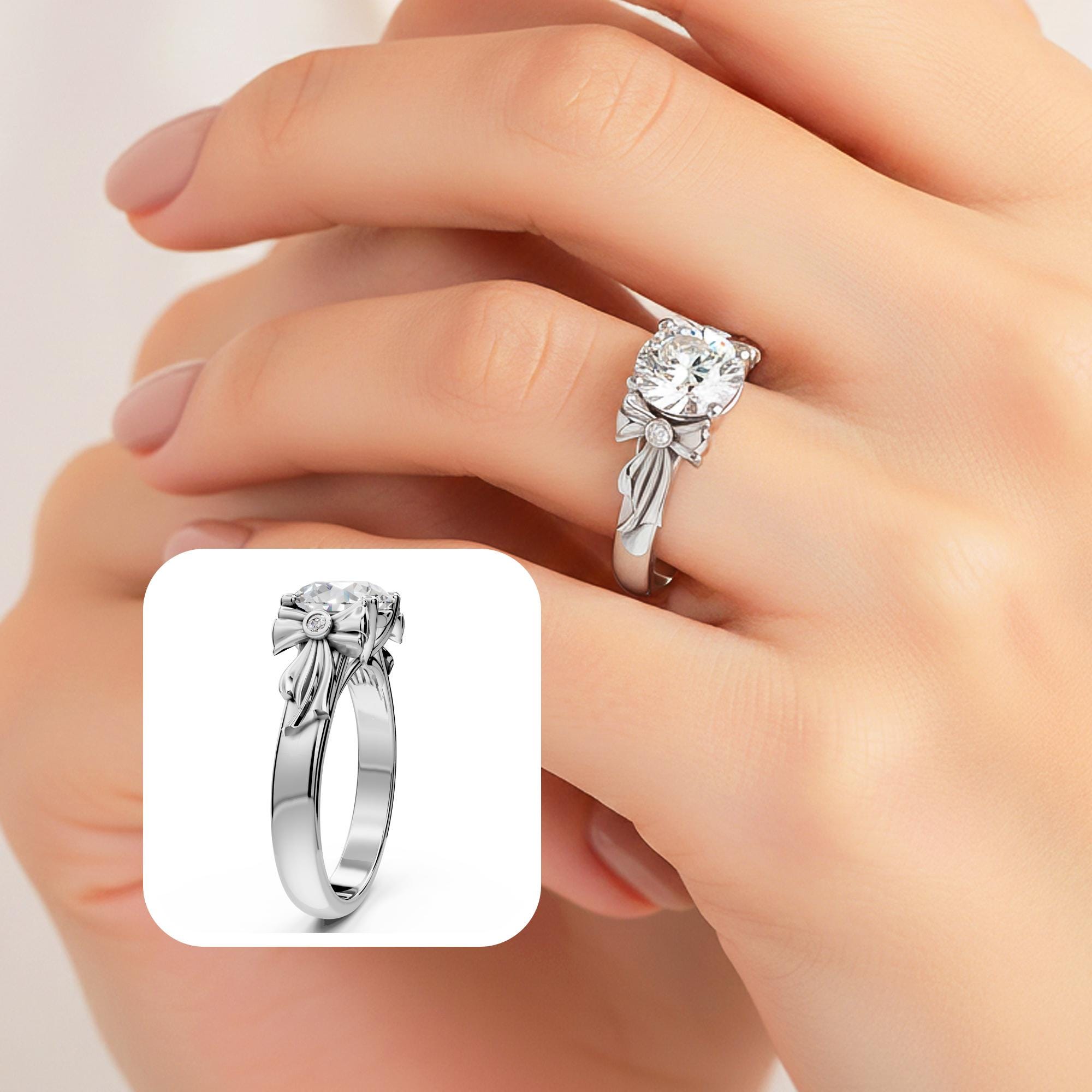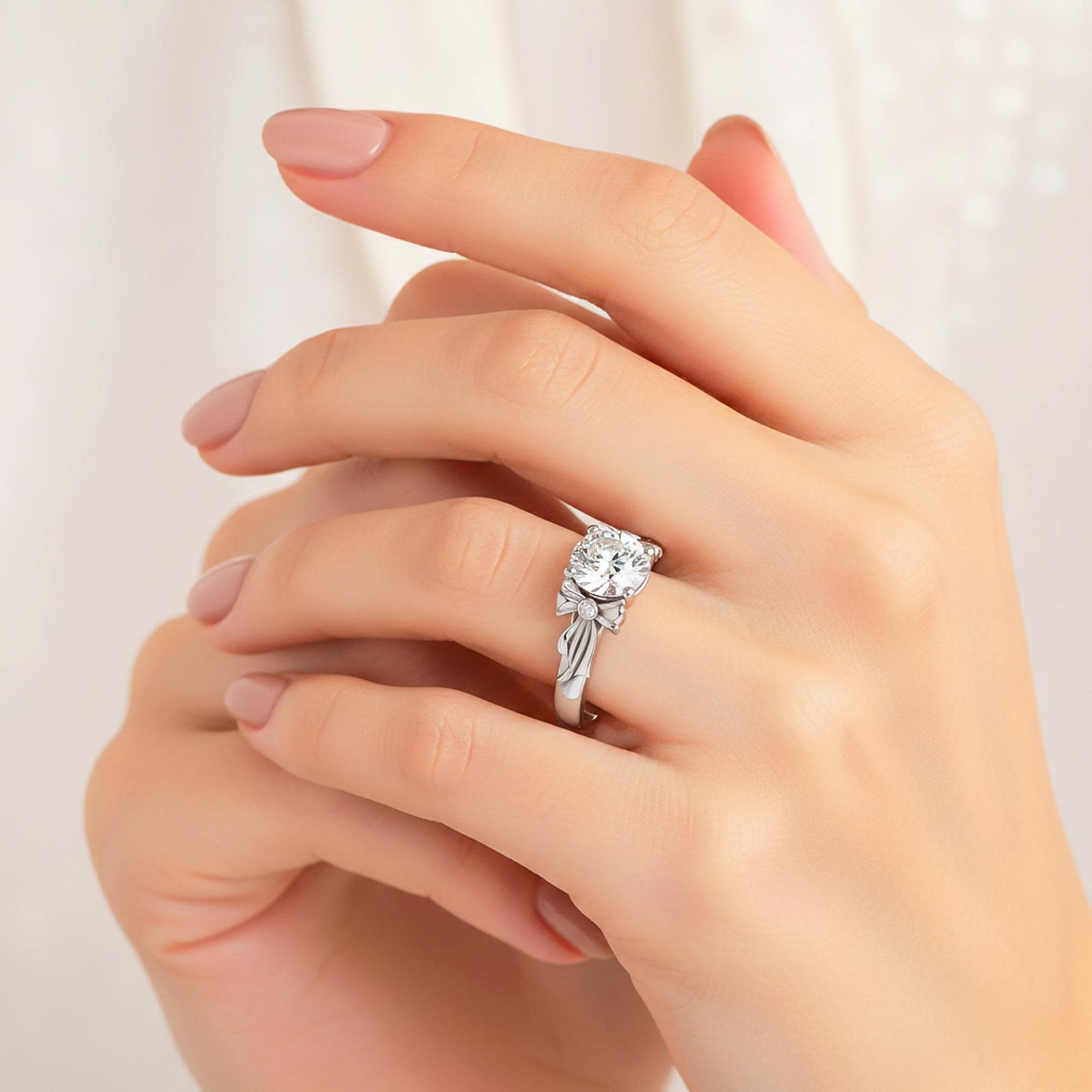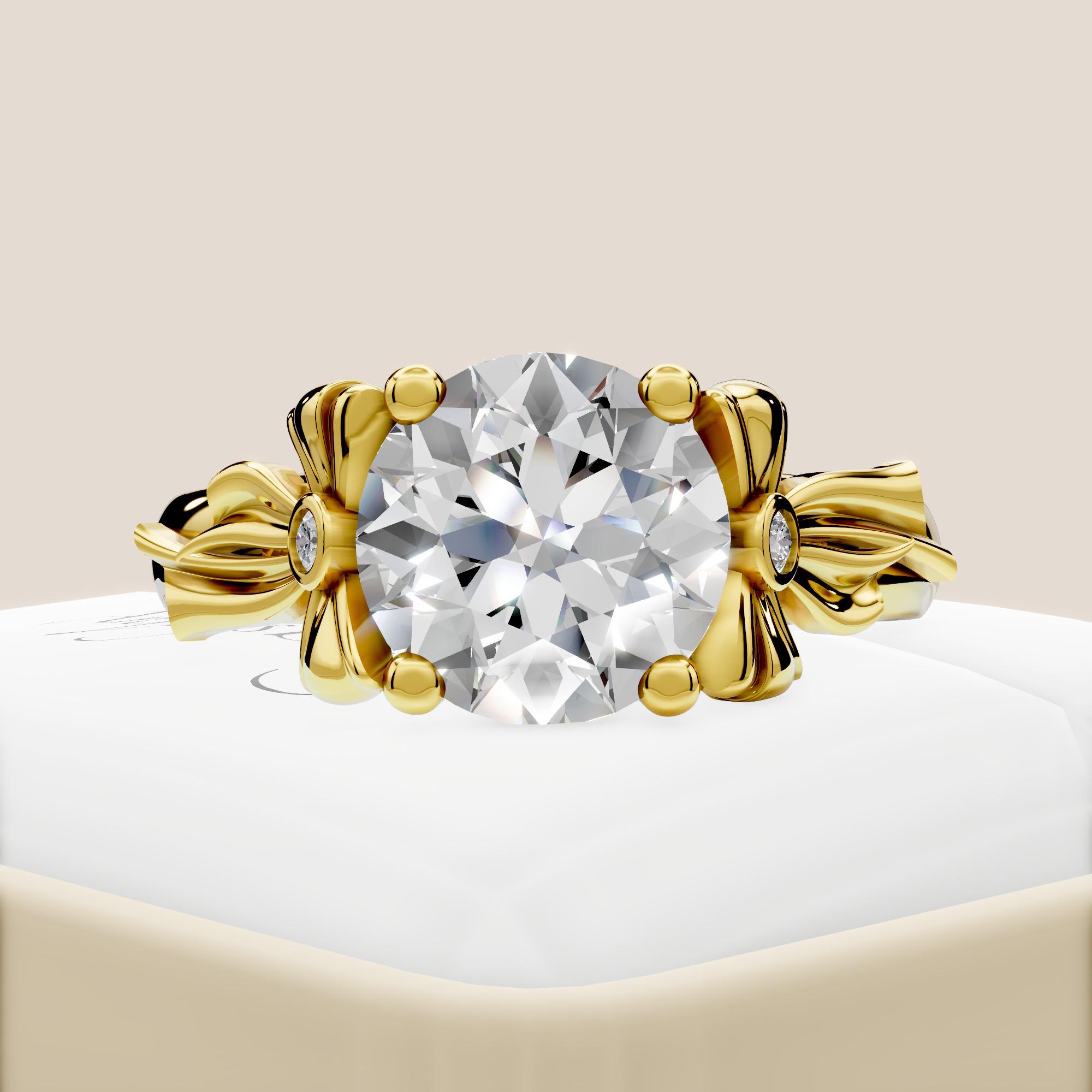 This unique diamond engagement ring features a round 2 carat lab grown diamond adorned by a bow tie design on each side. Made in solid gold, this minimalist wedding ring combines timeless charm with modern sophistication—a perfect symbol of everlasting love!