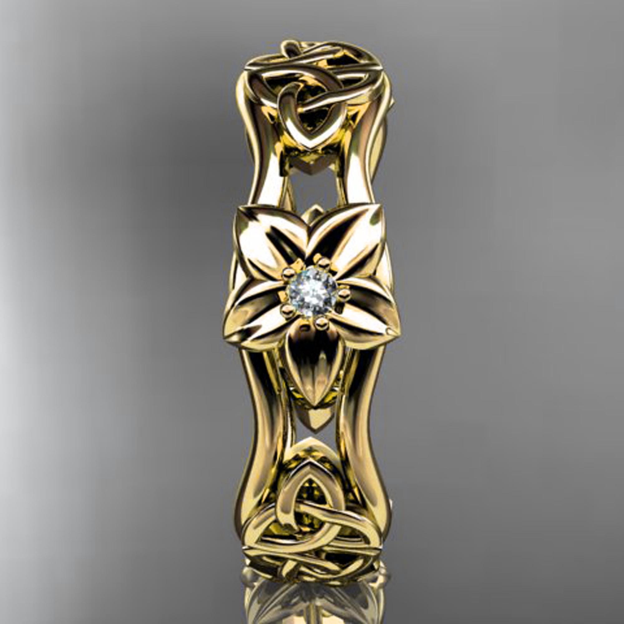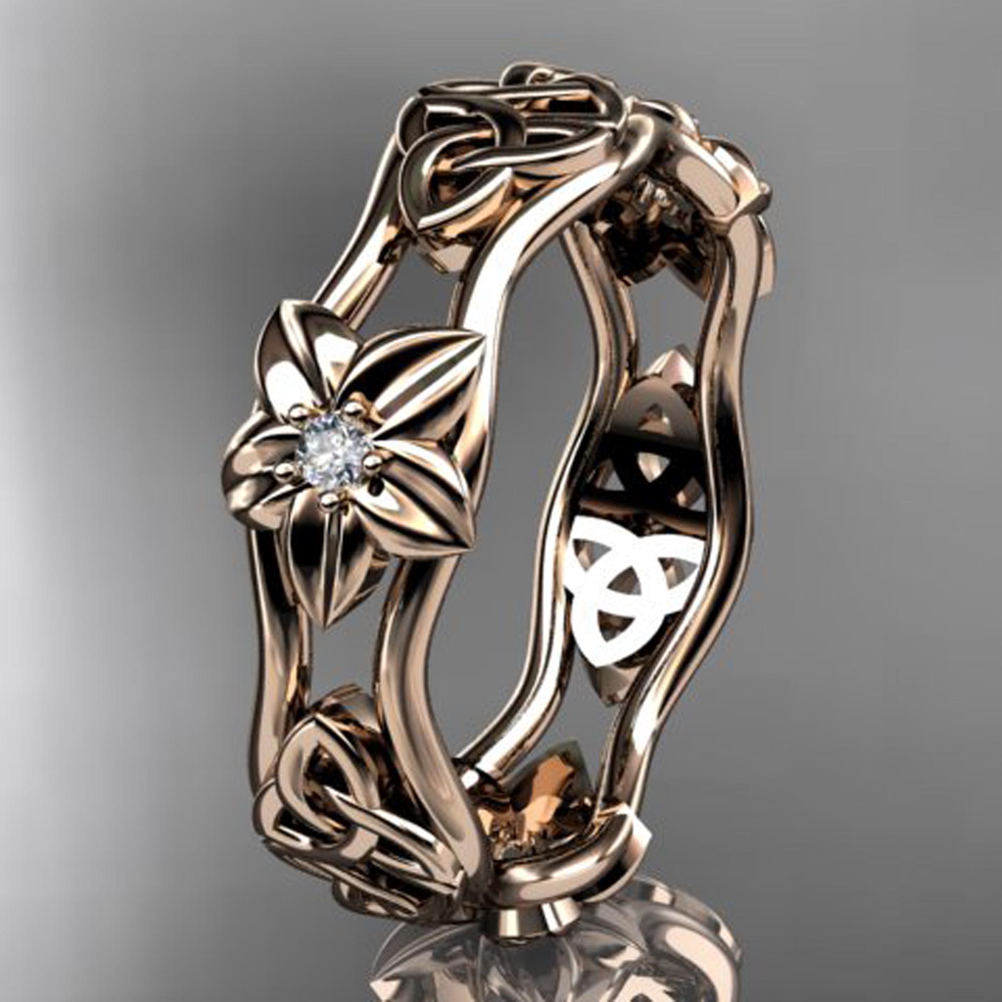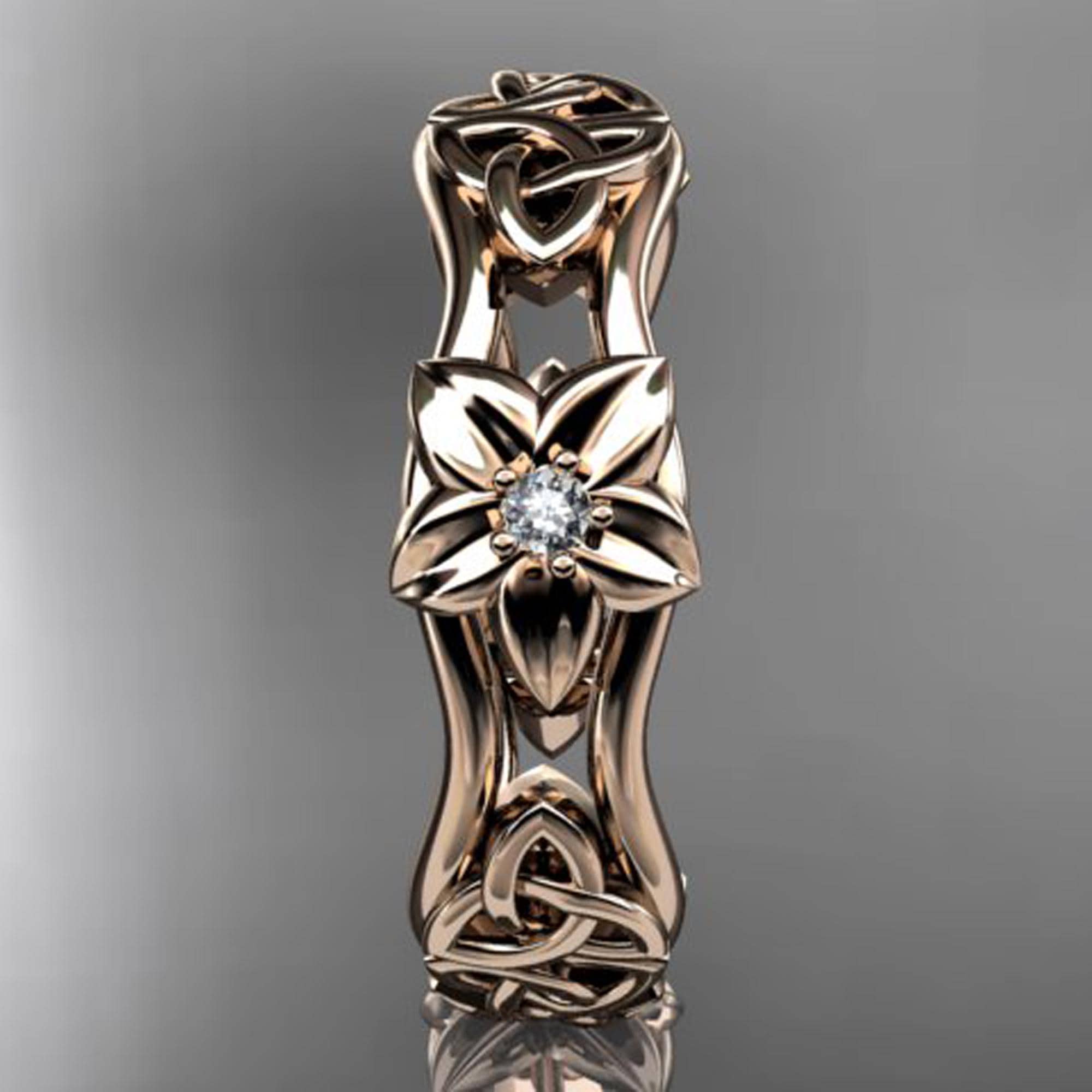 This nature inspired wedding ring in 14k rose gold features entwined Celtic trinity knot designs symbolizing eternal love and foreverness. Perfect as an anniversary ring or unique wedding band for women, it combines timeless elegance with meaningful craftsmanship!