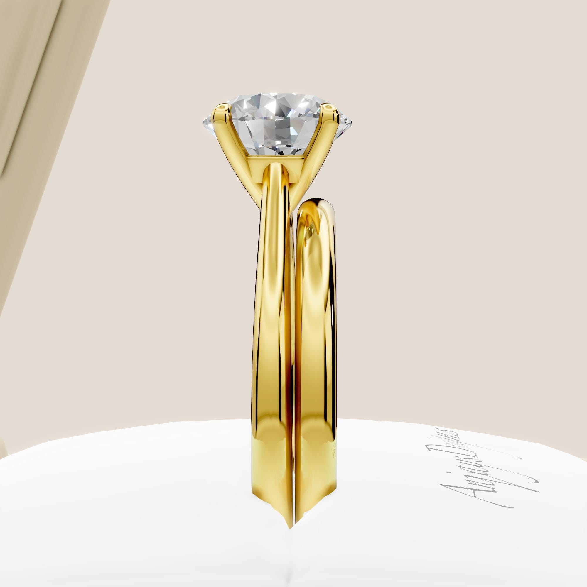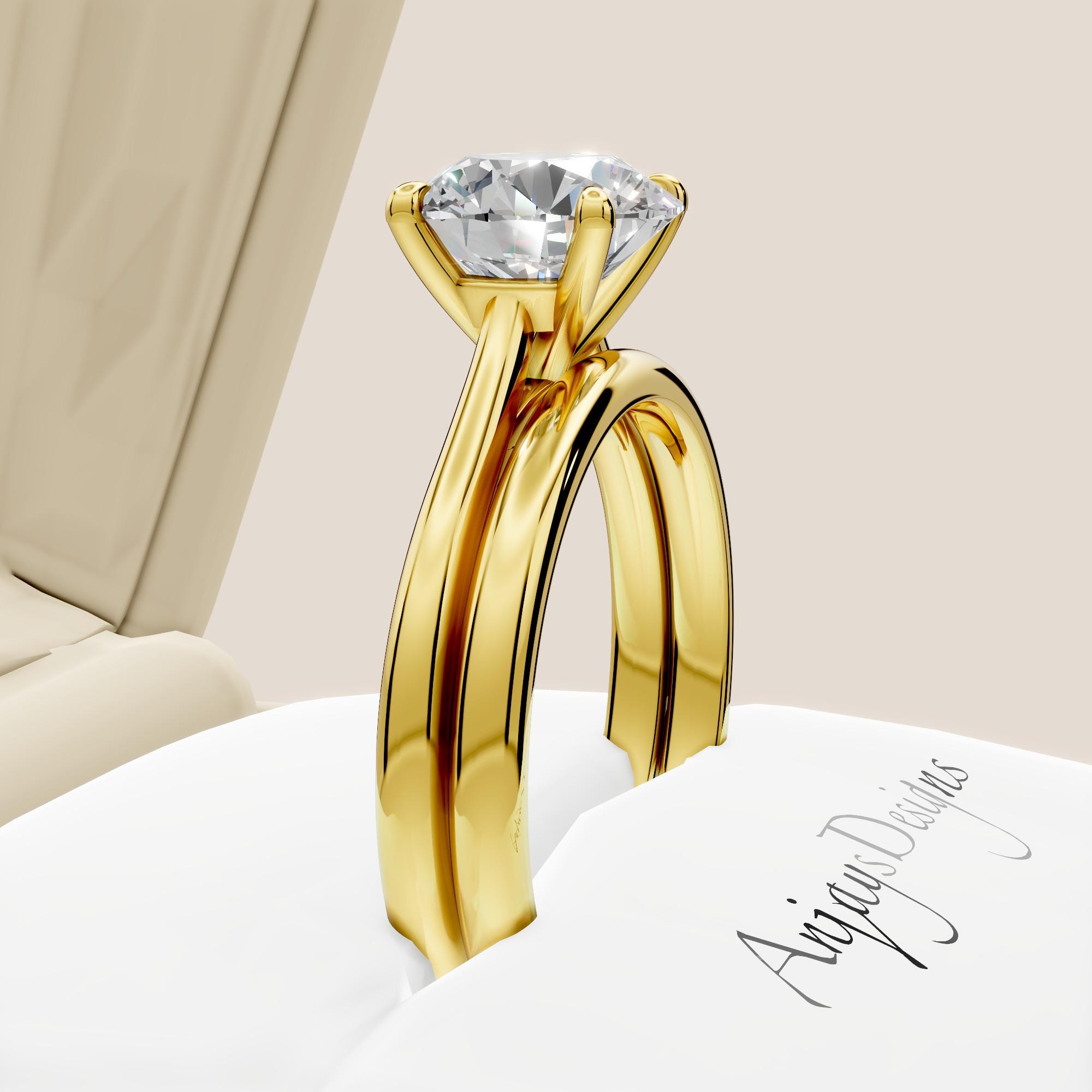 If you love a sleek, timeless look, this wedding ring set is the perfect match! The solitaire engagement ring features a 2 carat round cut lab grown diamond paired with a matching plain wedding band, giving you a classic bridal set that never goes out of style. The 2ct diamond sparkle does all the talking, while the polished yellow gold band keeps everything timeless and elegant!