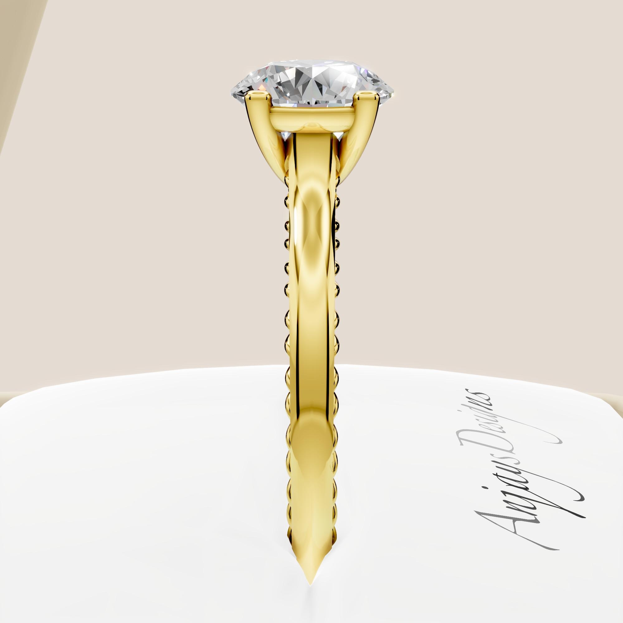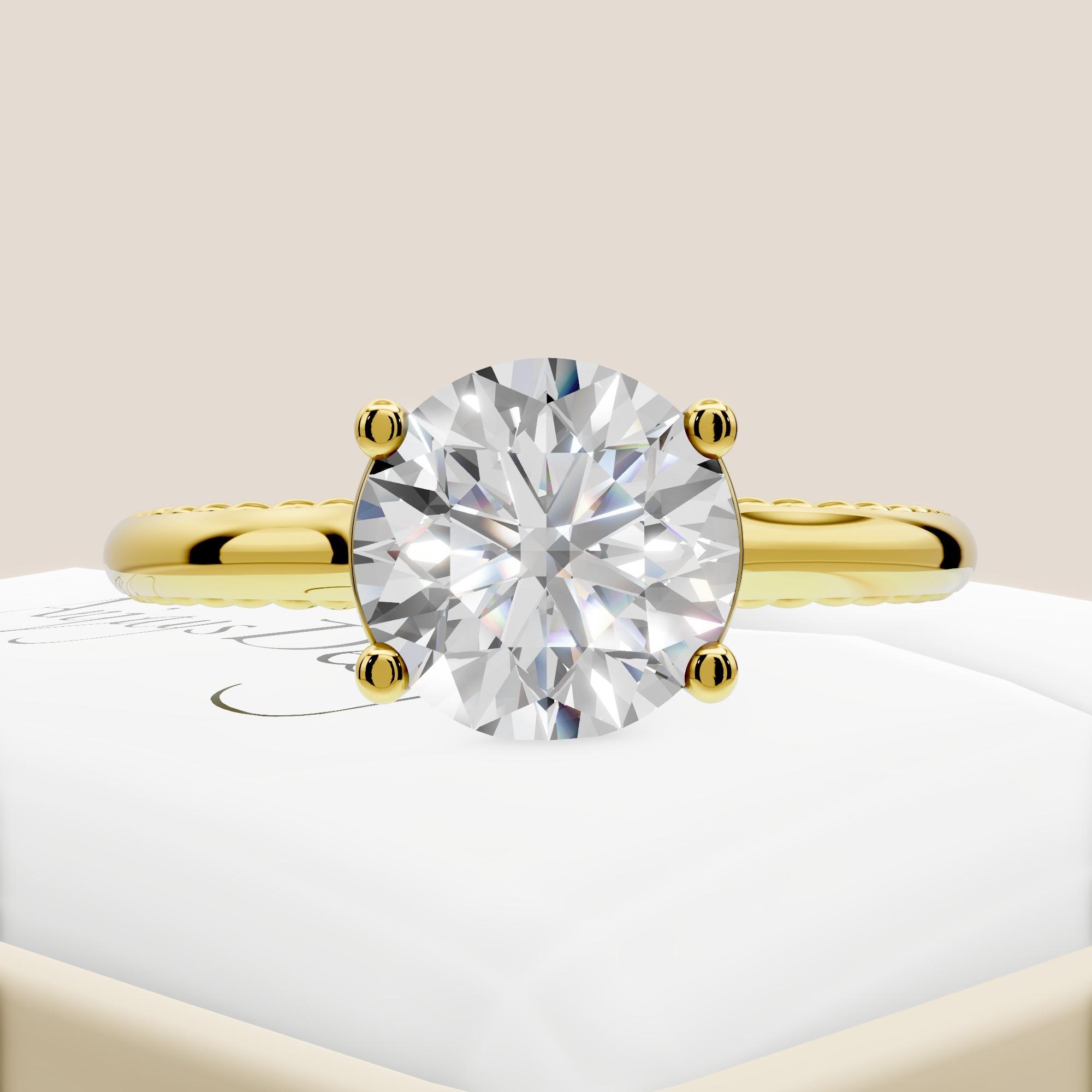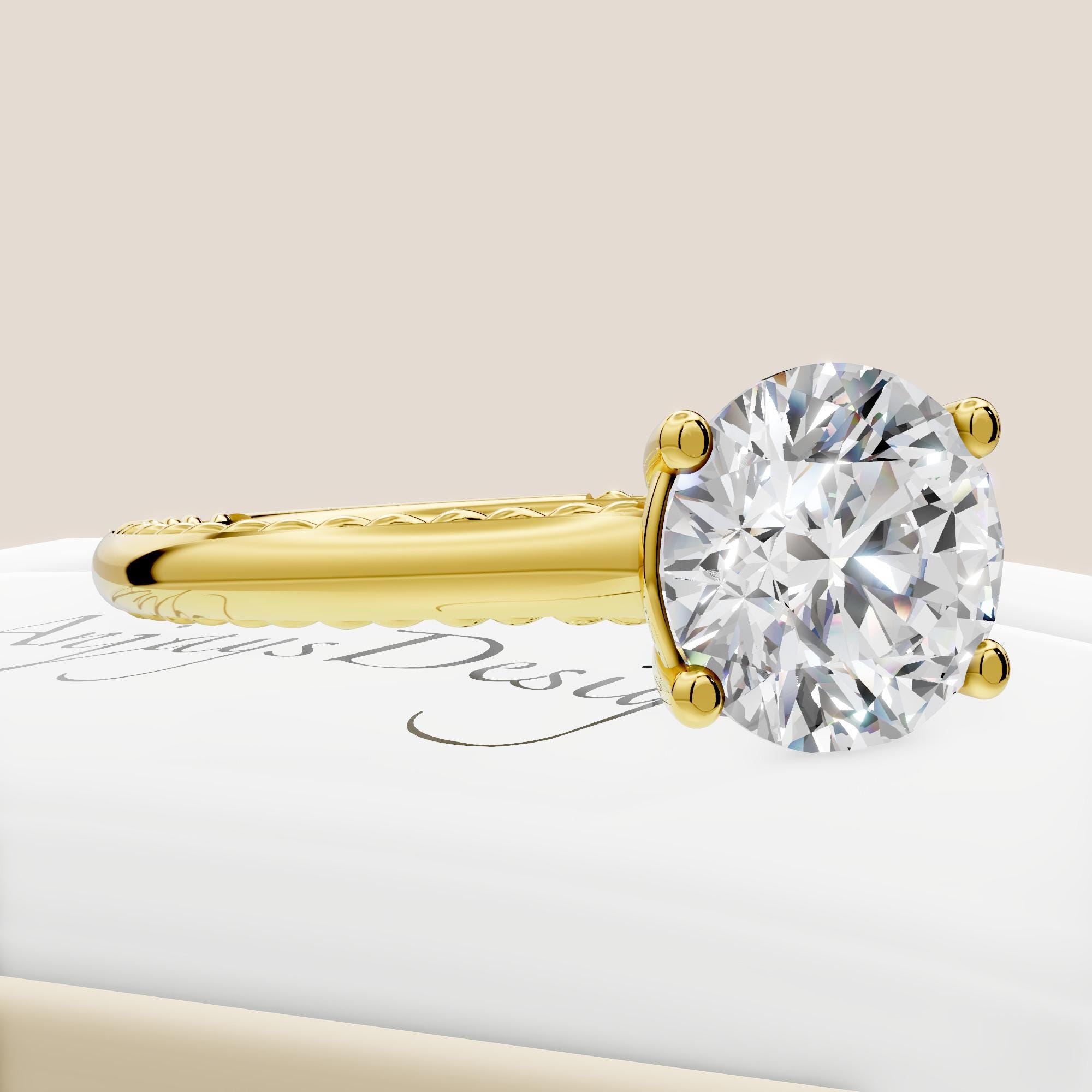 This round cut 2 carat engagement ring showcases a stunning IGI Certified D Color, VS1 Clarity lab grown diamond set in luxurious 14k yellow gold! The hidden halo adds extra brilliance beneath the center stone, offering a modern twist on a classic round brilliant solitaire. A radiant, ethically crafted engagement ring designed for maximum sparkle and timeless elegance!