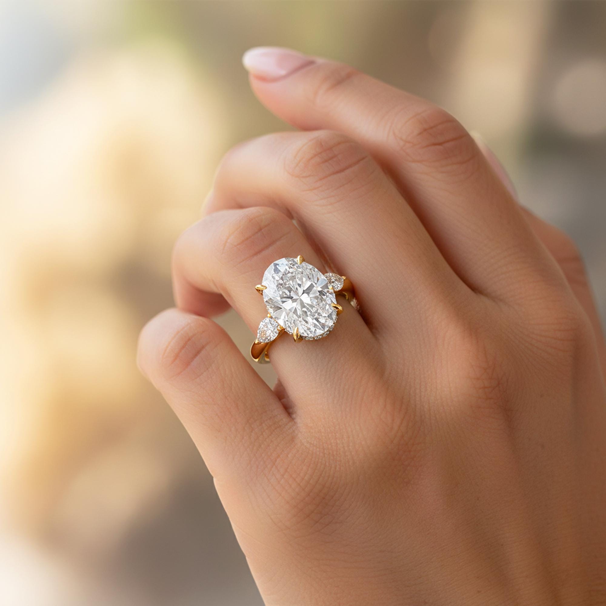 This 4 carat oval cut diamond engagement ring features a glistening 4 CT lab grown oval shaped diamond set in a thin, dainty 14k yellow gold band! Designed with stunning pear shaped side diamonds and a hidden halo for added sparkle, this ring offers a luxurious yet minimalist look. A perfect blend of sparkle and sophistication, it makes an unforgettable choice for your engagement or anniversary!