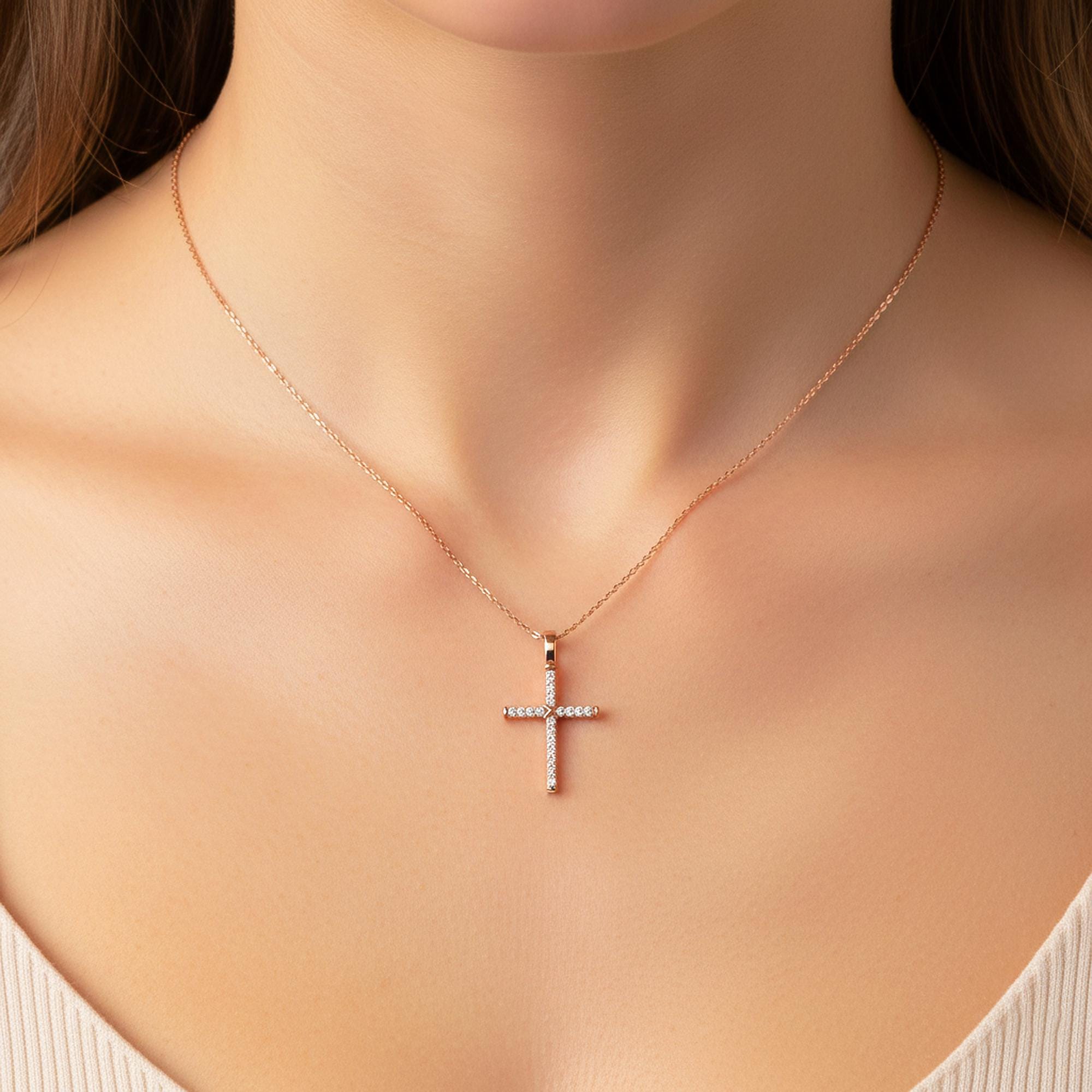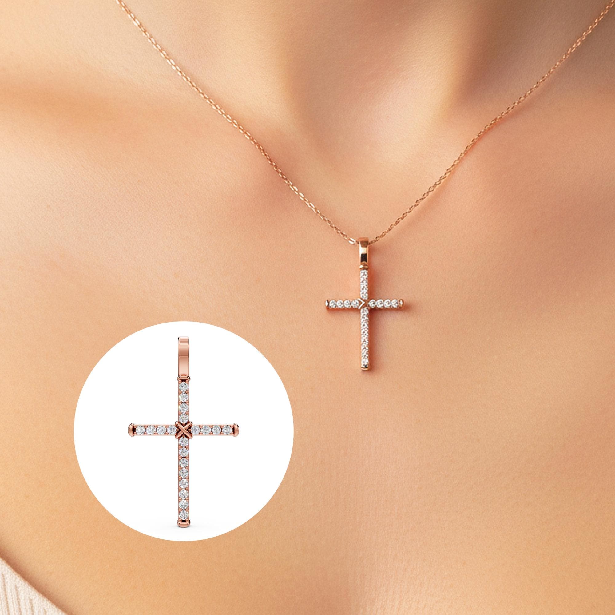 This dainty diamond Cross pendant is made in solid 14k gold and is adorned by glistening round lab grown diamonds! This minimalist Cross charm necklace offers a timeless, elegant look perfect for everyday wear. A meaningful and beautifully refined piece that makes a thoughtful gift for birthdays, anniversaries, or milestones!