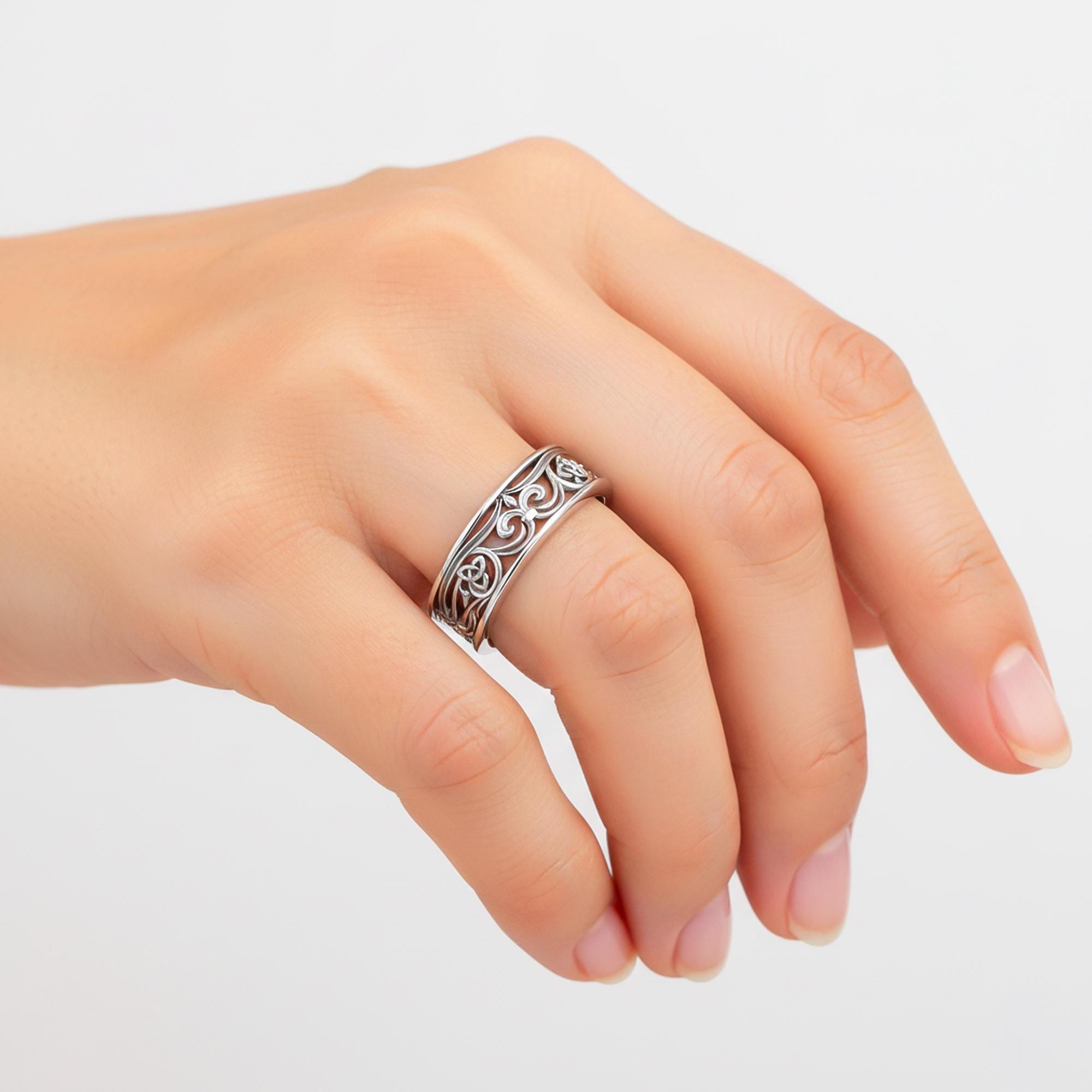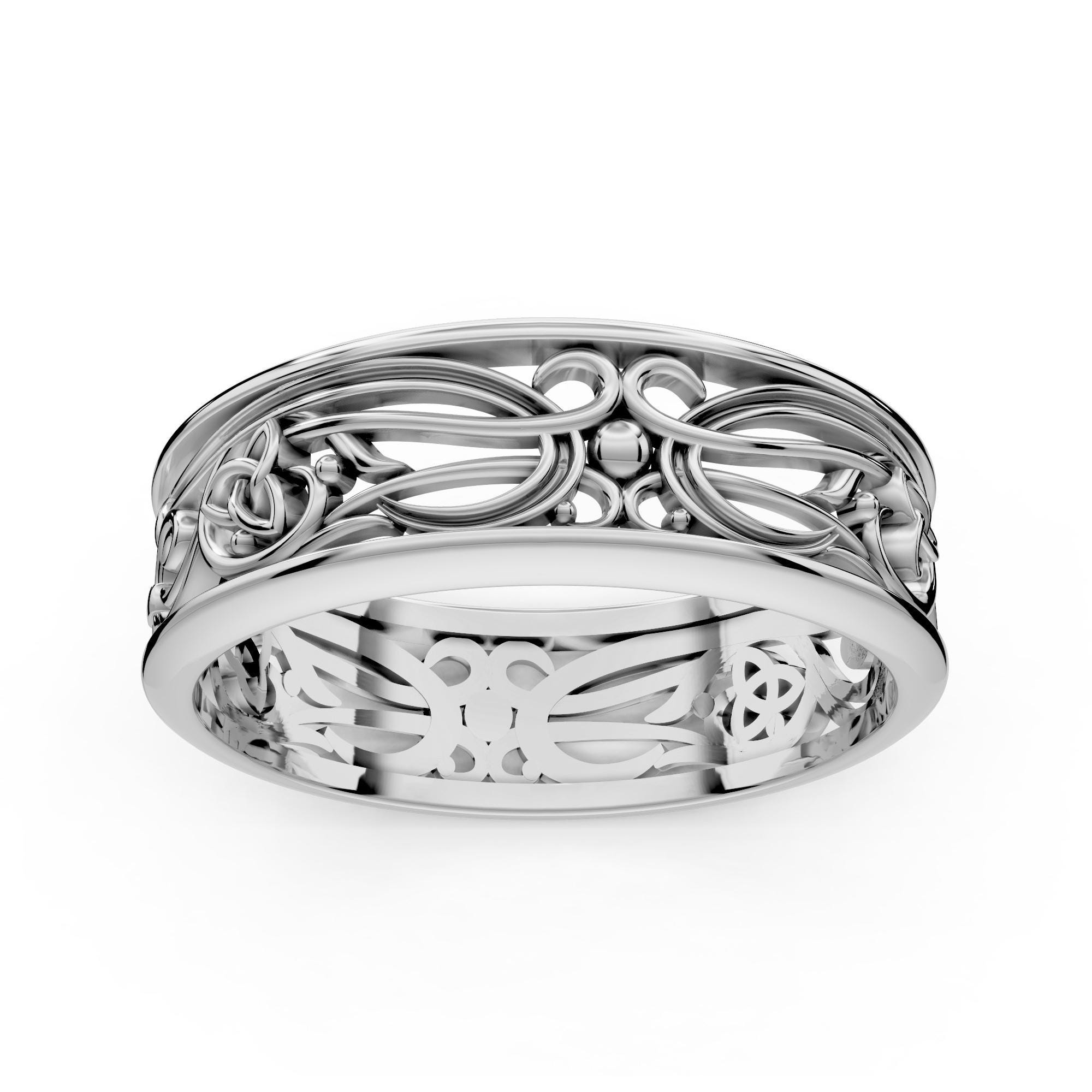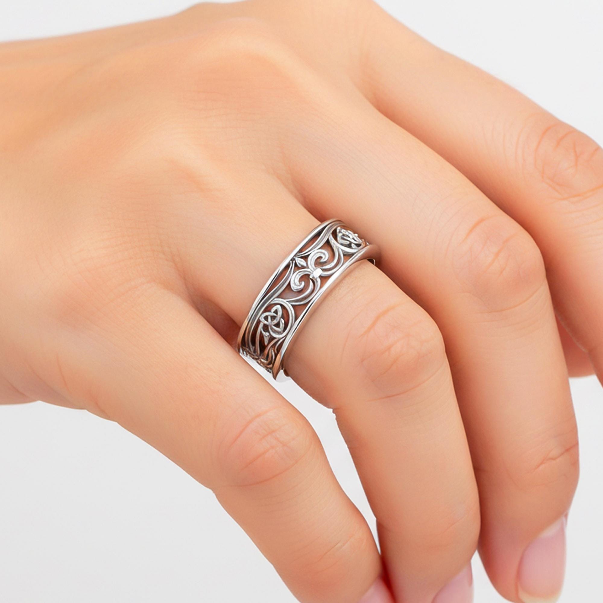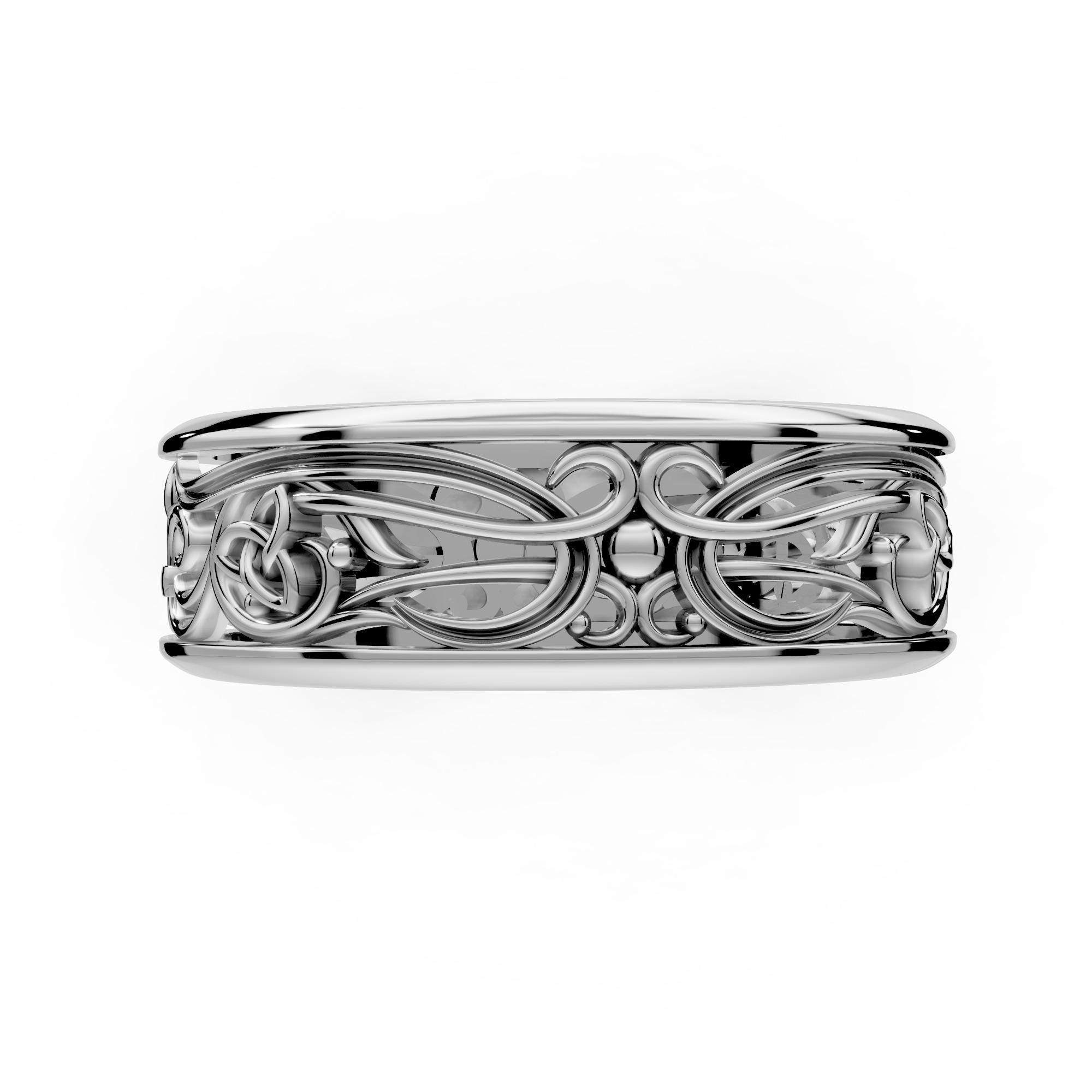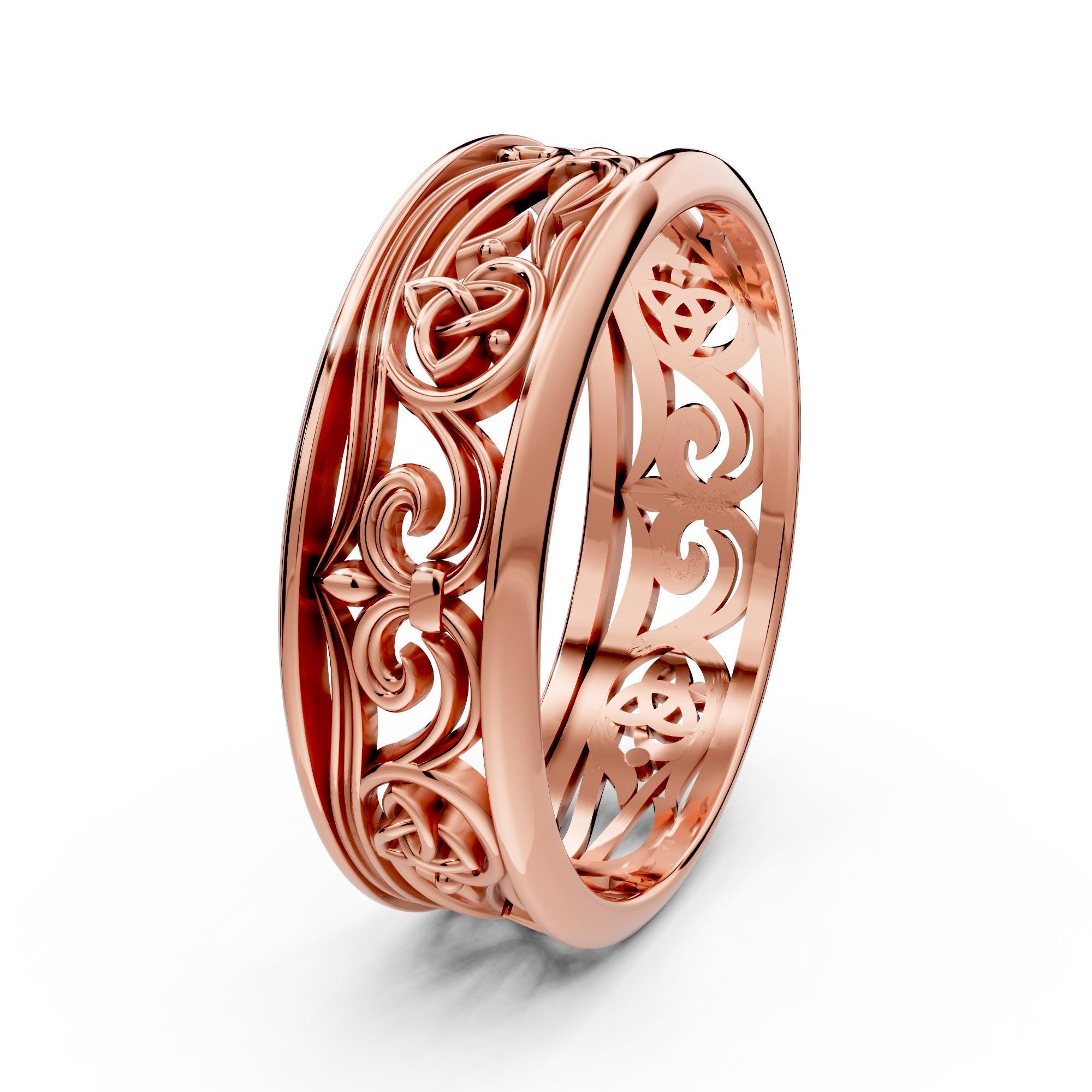 This unique Celtic wedding band is made in lovely solid 18k white gold and features a timeless Fleur de Lis design entwined with the iconic Trinity Knot. Rich in history and symbolism, the design represents unity, loyalty, and eternal love, making it a meaningful choice for an anniversary or wedding ring!