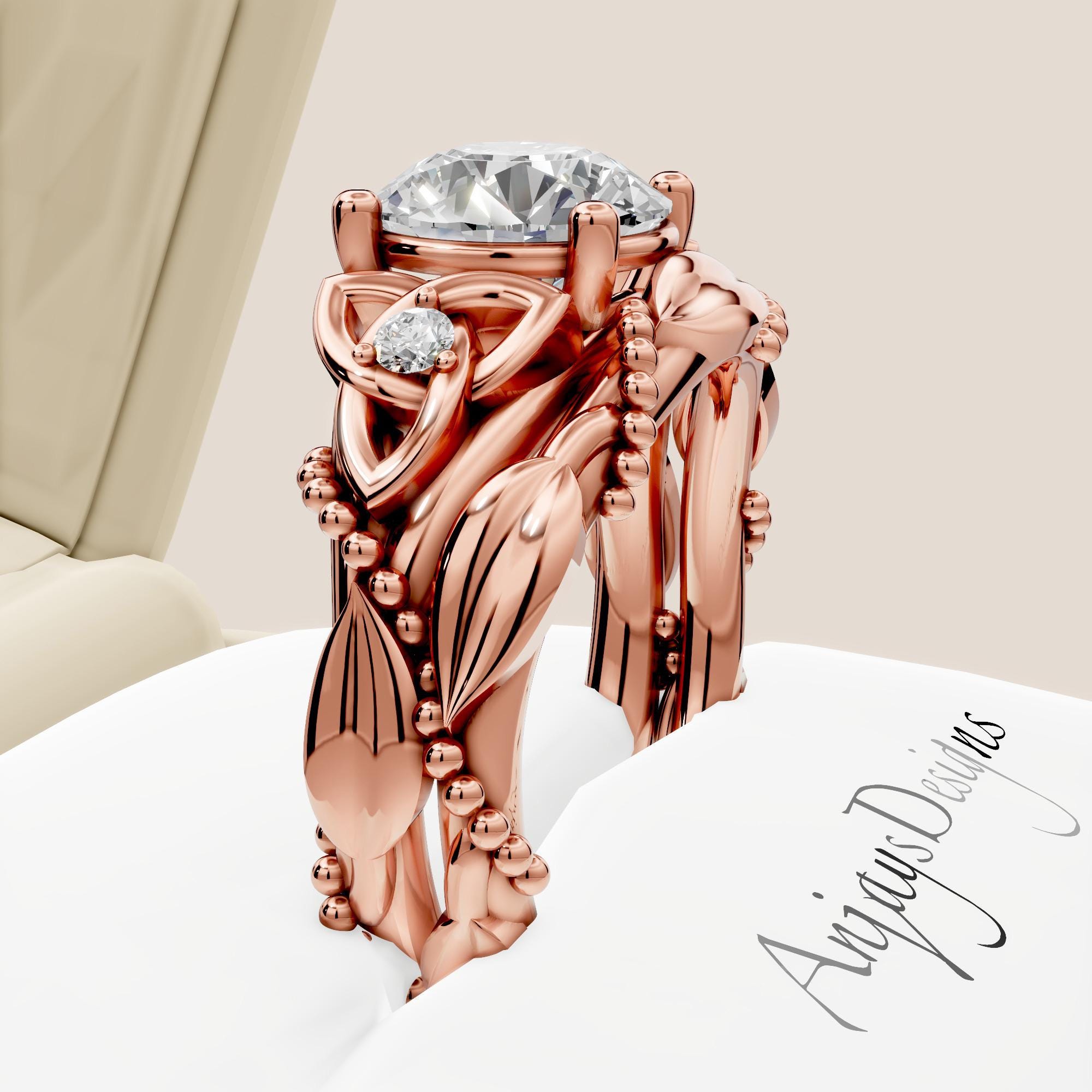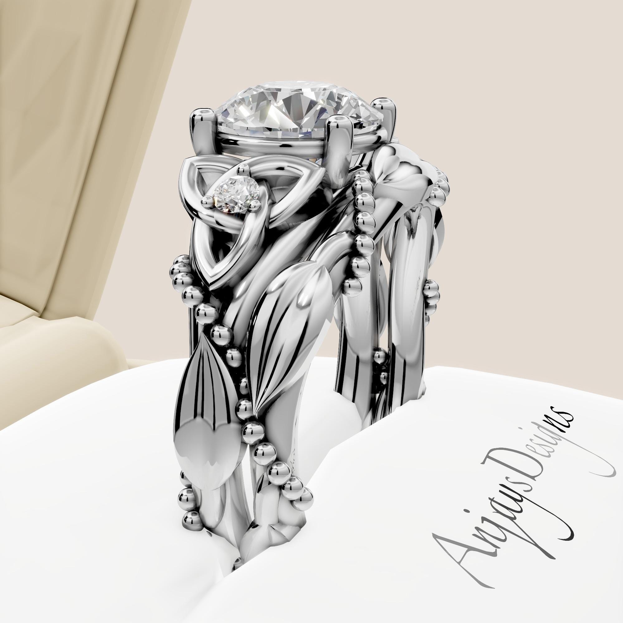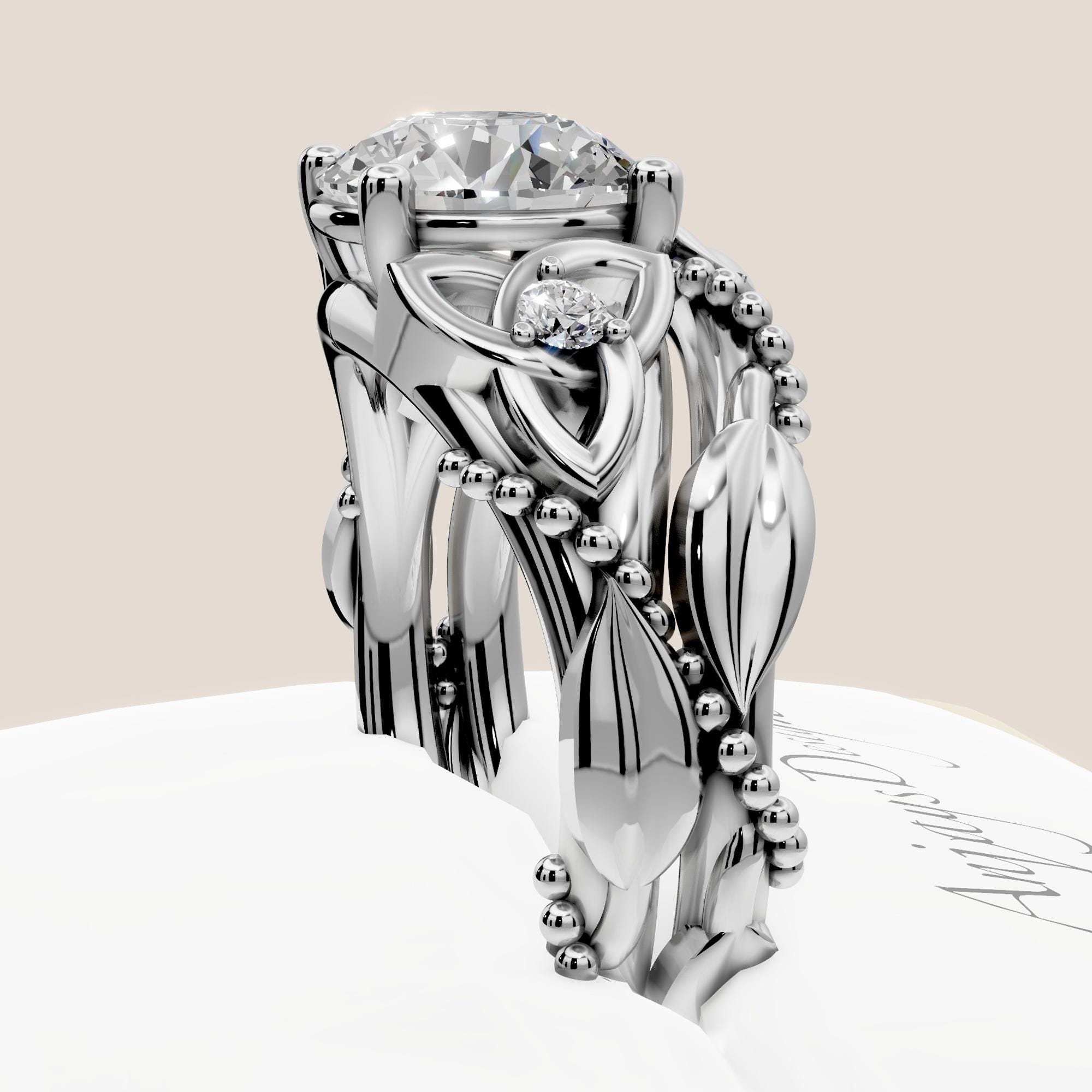 Meet the unique wedding ring set that blends Irish symbolism with modern sparkle! This bridal set features a Celtic trinity knot engagement ring centered with a round 2 carat lab grown diamond and a matching nature inspired wedding band. The band is adorned with leaf and vine designs flowing seamlessly. This Celtic wedding ring set symbolizes eternal love and loyalty, making it the perfect match for your forever person!