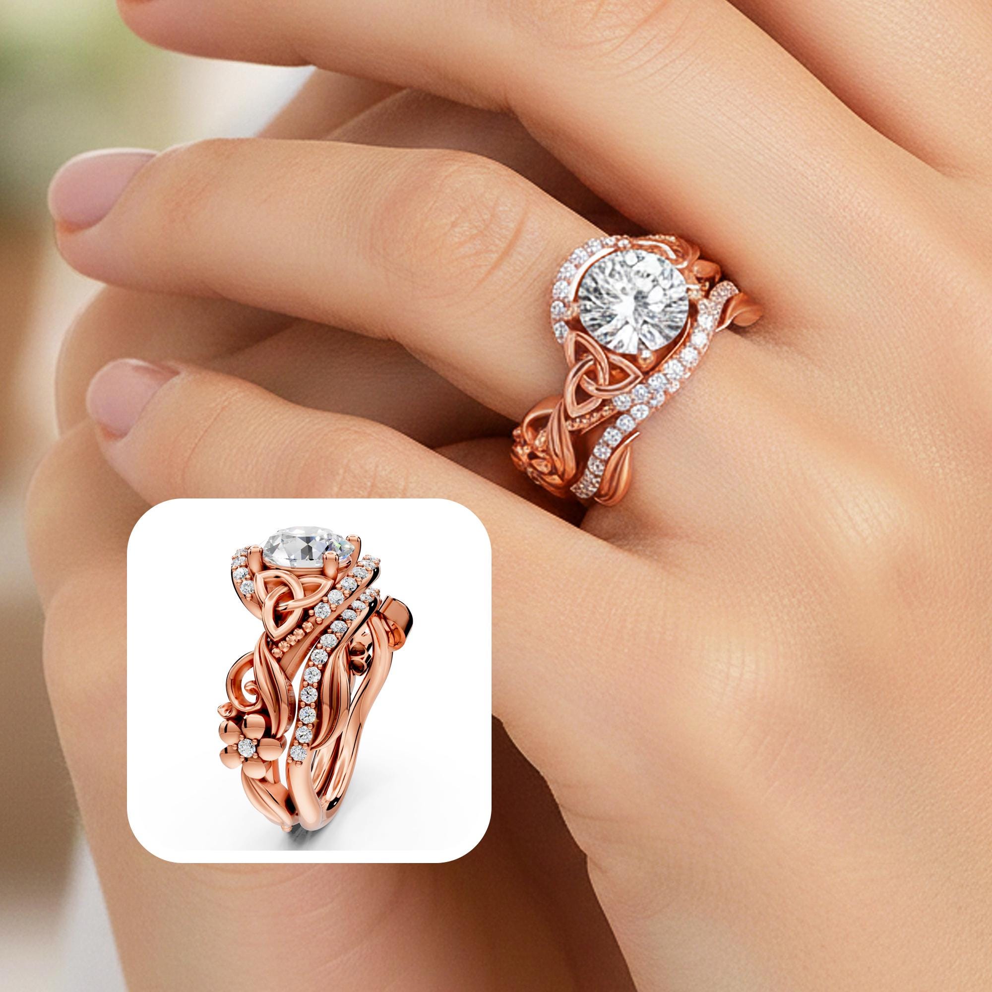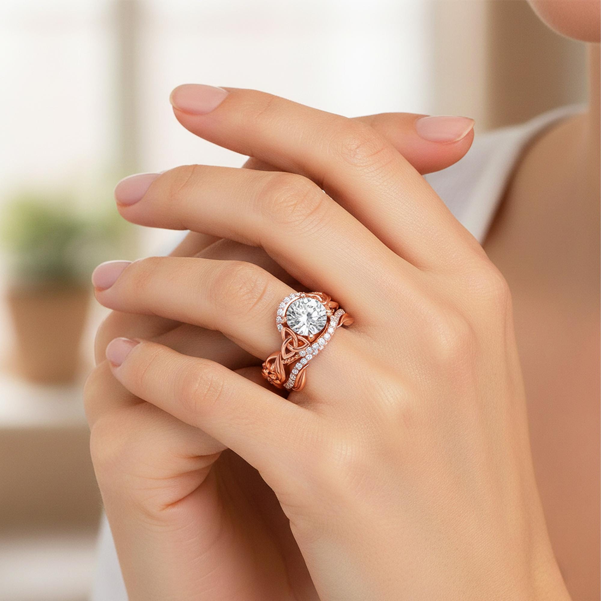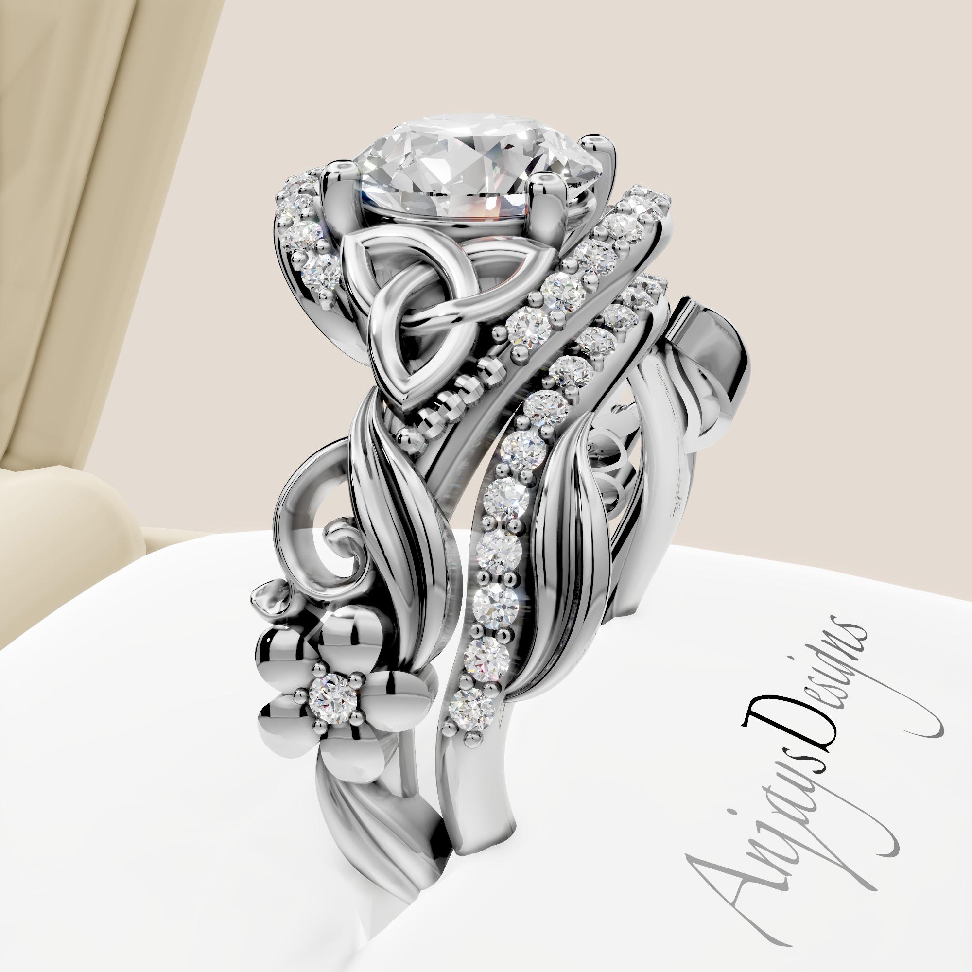 This Celtic knot engagement ring is a beautiful blend of Irish symbolism and nature-inspired designs, designed as a unique wedding ring set meant to be worn together! At the center is a glistening 2 carat round lab grown diamond, IGI certified for its exceptional quality and fire. This bridal set features a Celtic engagement ring paired with a matching diamond wedding band!