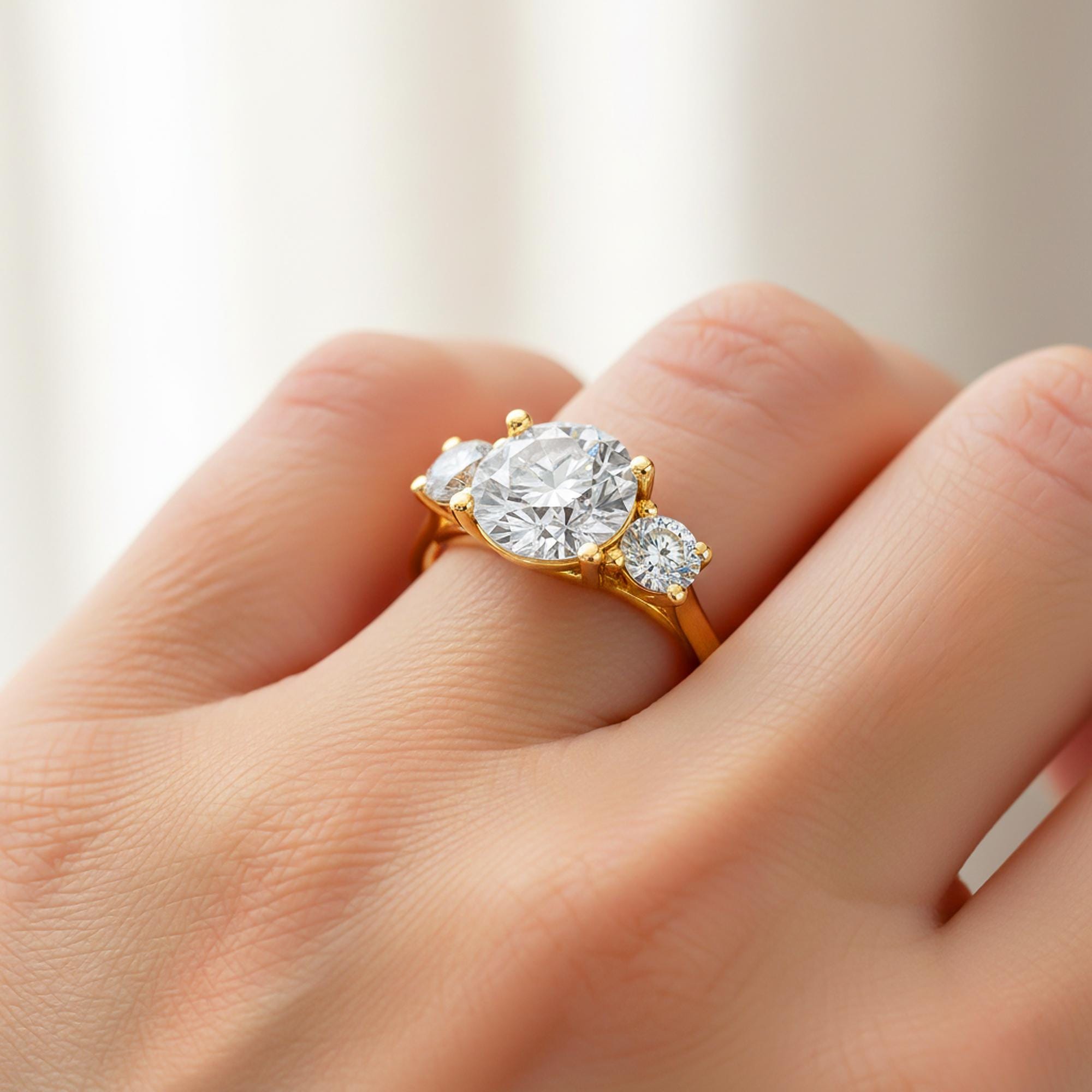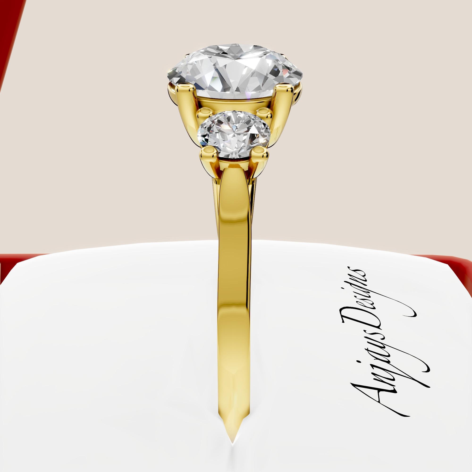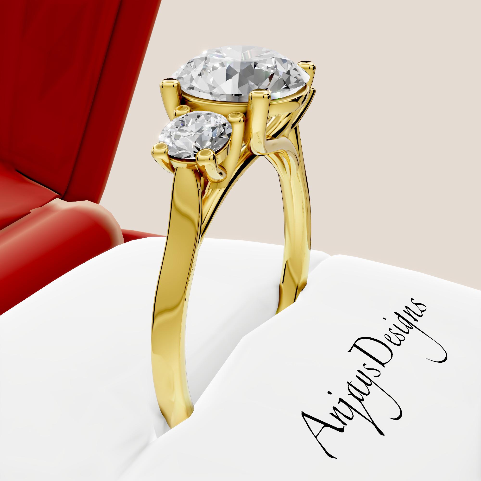 This 2.5 carat three stone lab grown diamond engagement ring is crafted in solid 14k yellow gold and features a timeless trilogy design that symbolizes the past, present, and future! The three diamond setting offers balanced brilliance and elegant sparkle, making it a meaningful and classic choice for an engagement ring. The lab grown diamonds deliver the same beauty, durability, and fire as mined diamonds while offering a modern and responsible alternative!
