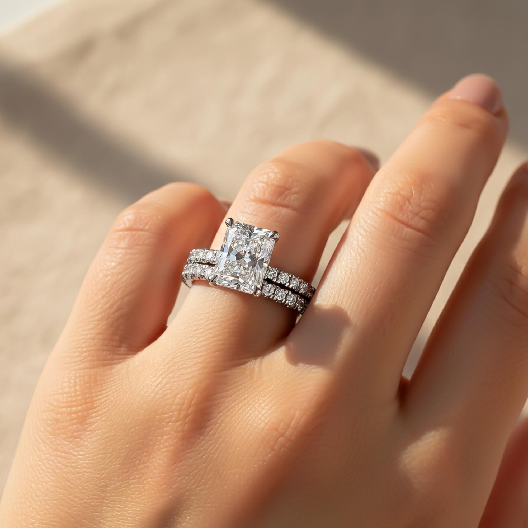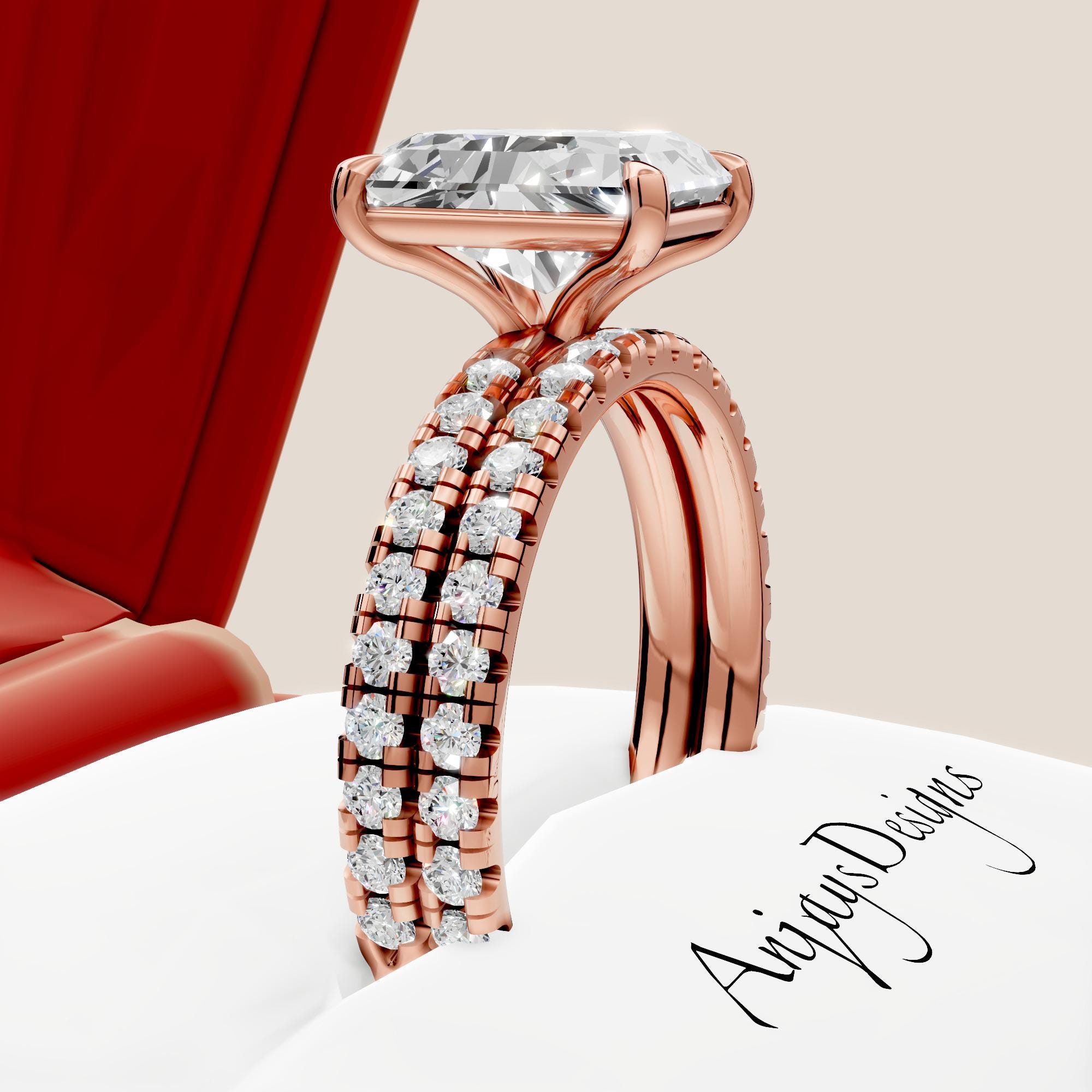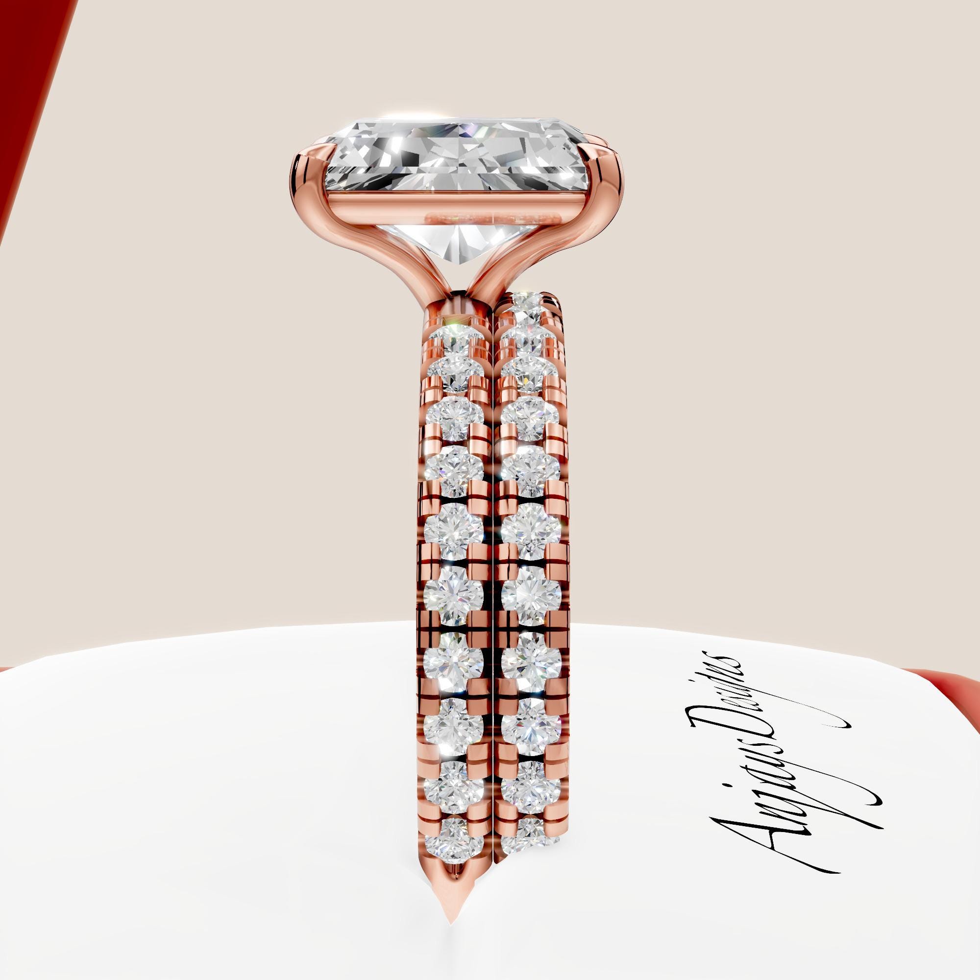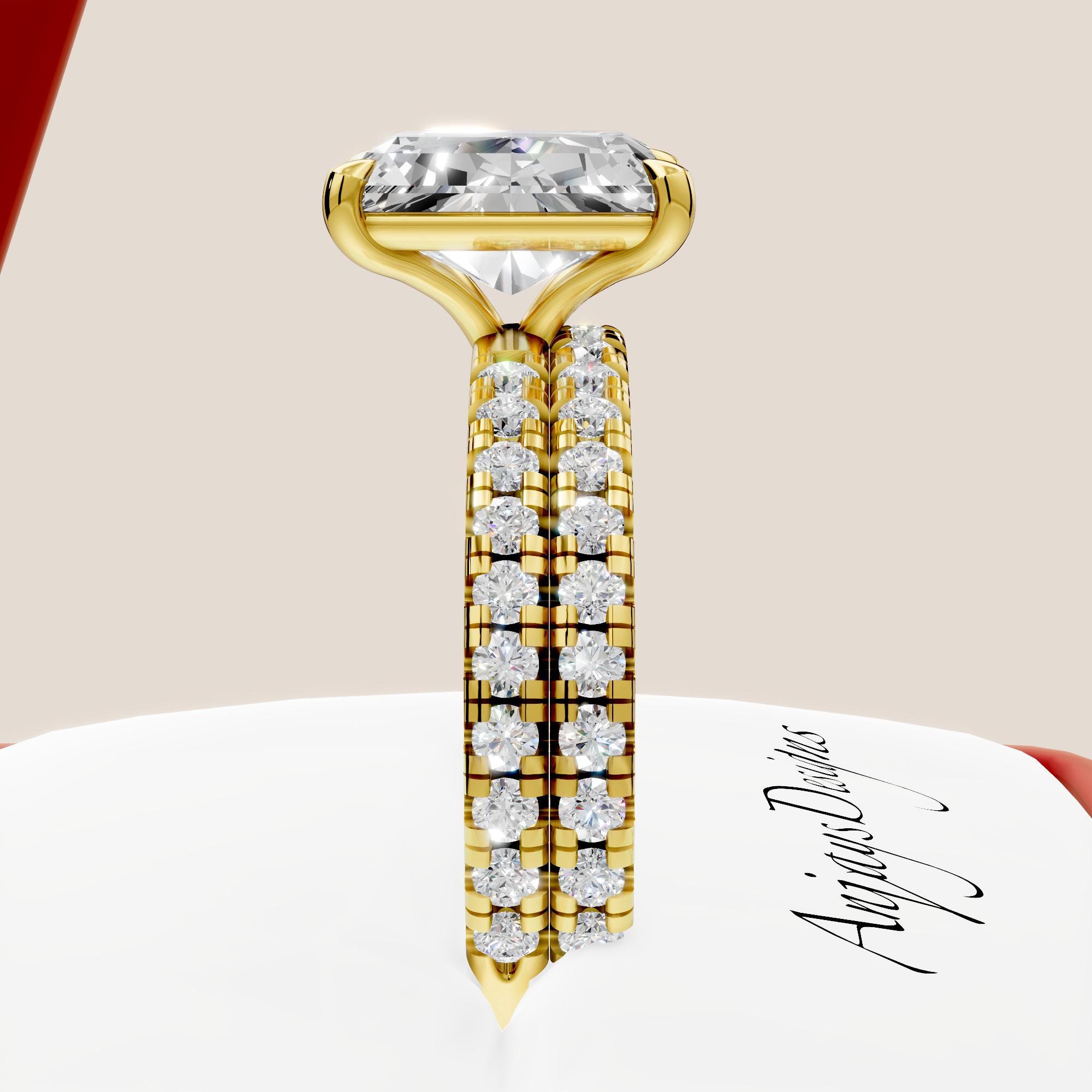 This 3 CT radiant cut diamond engagement ring set is crafted in solid 14k gold and designed as a complete bridal wedding set! Featuring a glistening radiant cut lab grown center diamond, this set offers exceptional brilliance and modern elegance, with the engagement ring and matching wedding band designed to sit perfectly together.