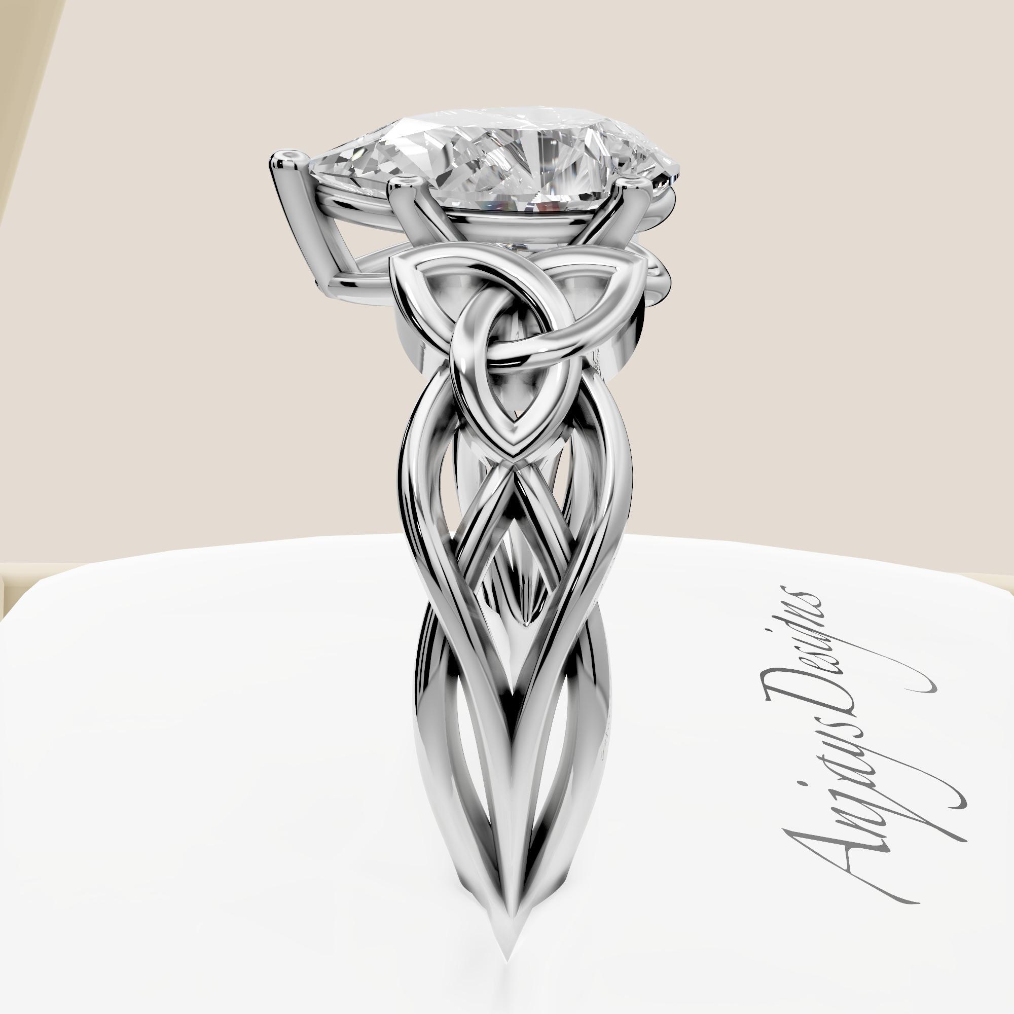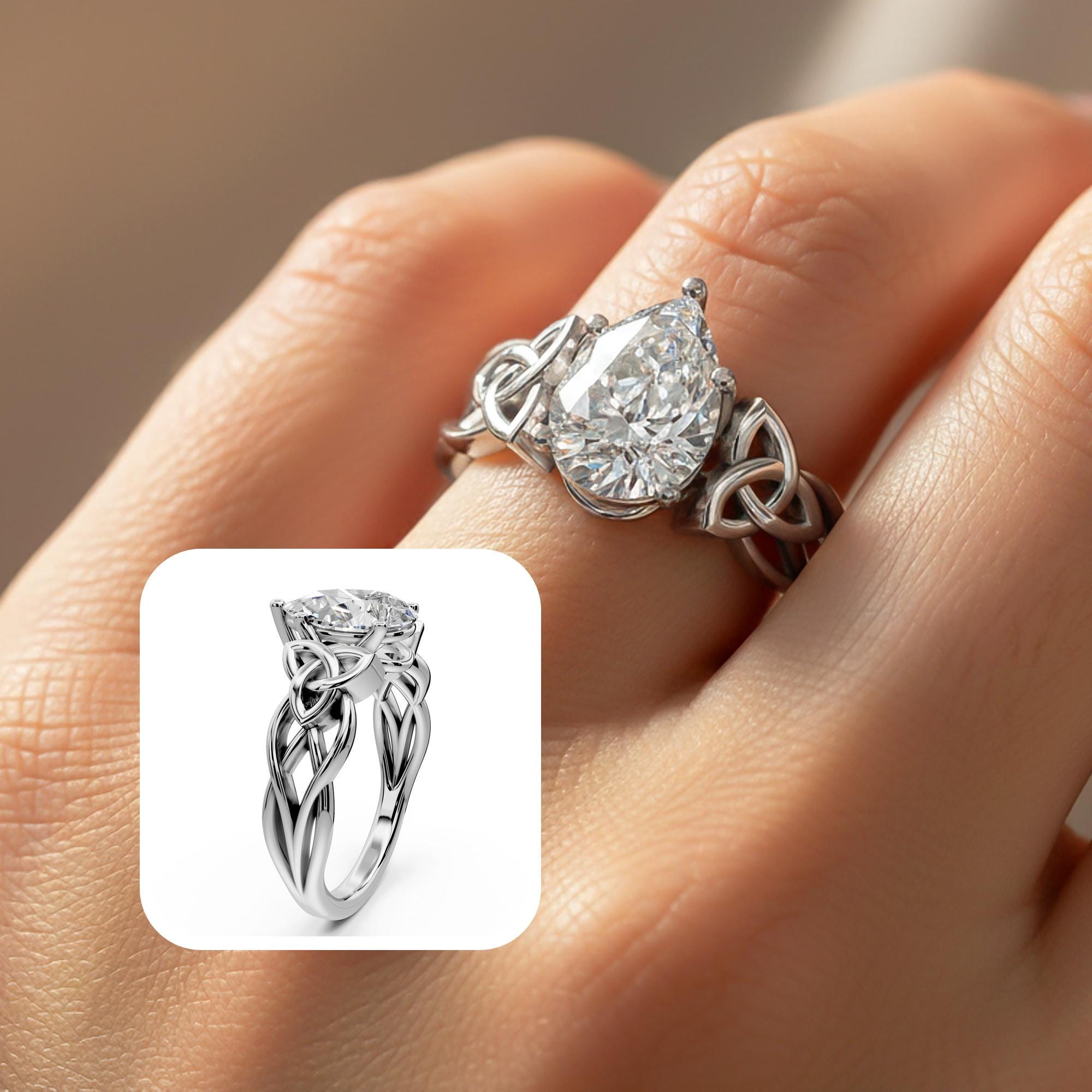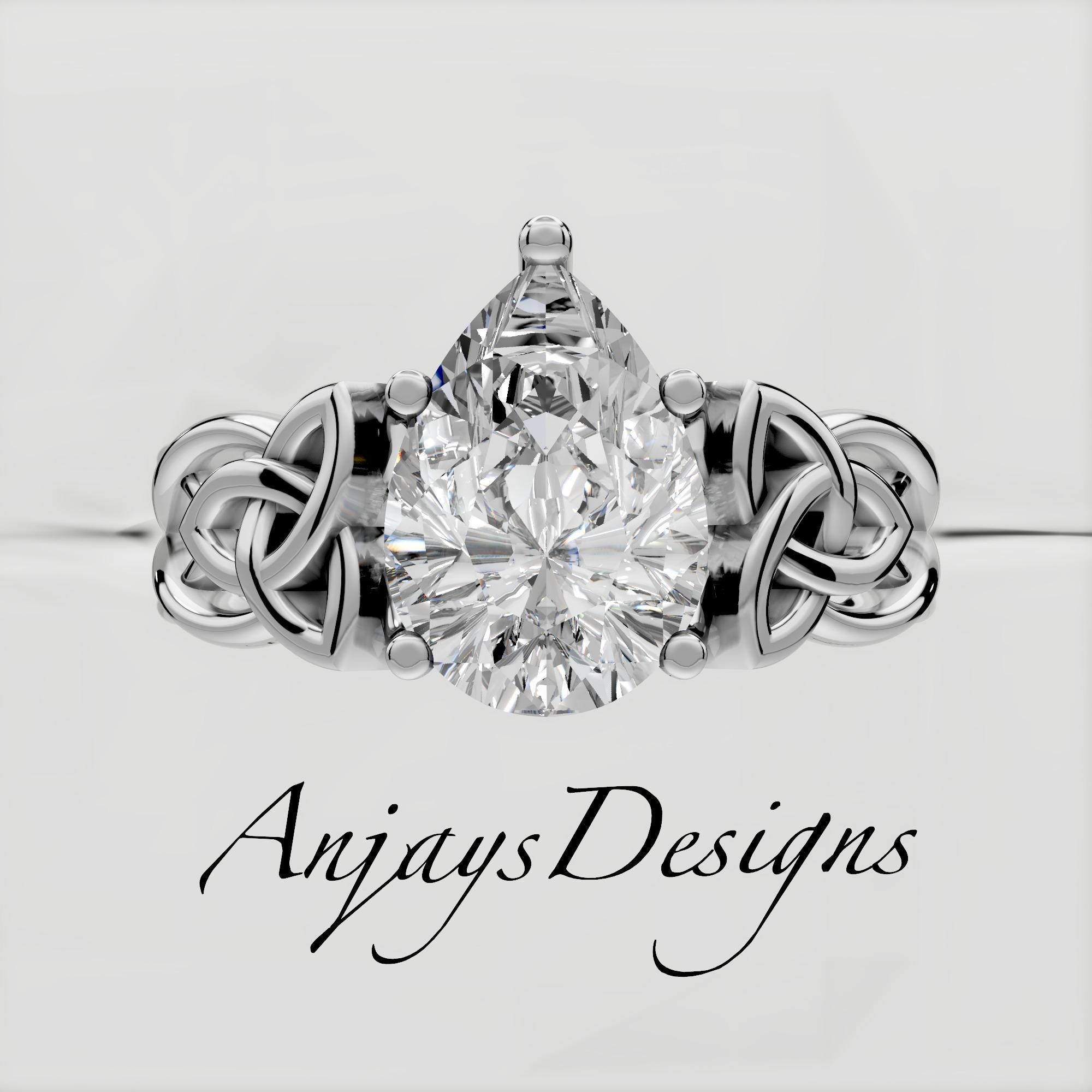 This Celtic knot engagement ring is crafted in solid 14k white gold and features a stunning 2 carat pear shaped lab grown diamond set in a timeless solitaire design! The entwined love knot designs add symbolic meaning, representing unity, eternity, and enduring love. The pear cut diamond offers classic sparkle and brilliance, providing the same beauty and durability as a mined diamond. This Celtic wedding ring makes a meaningful choice for a unique engagement or special occasion!