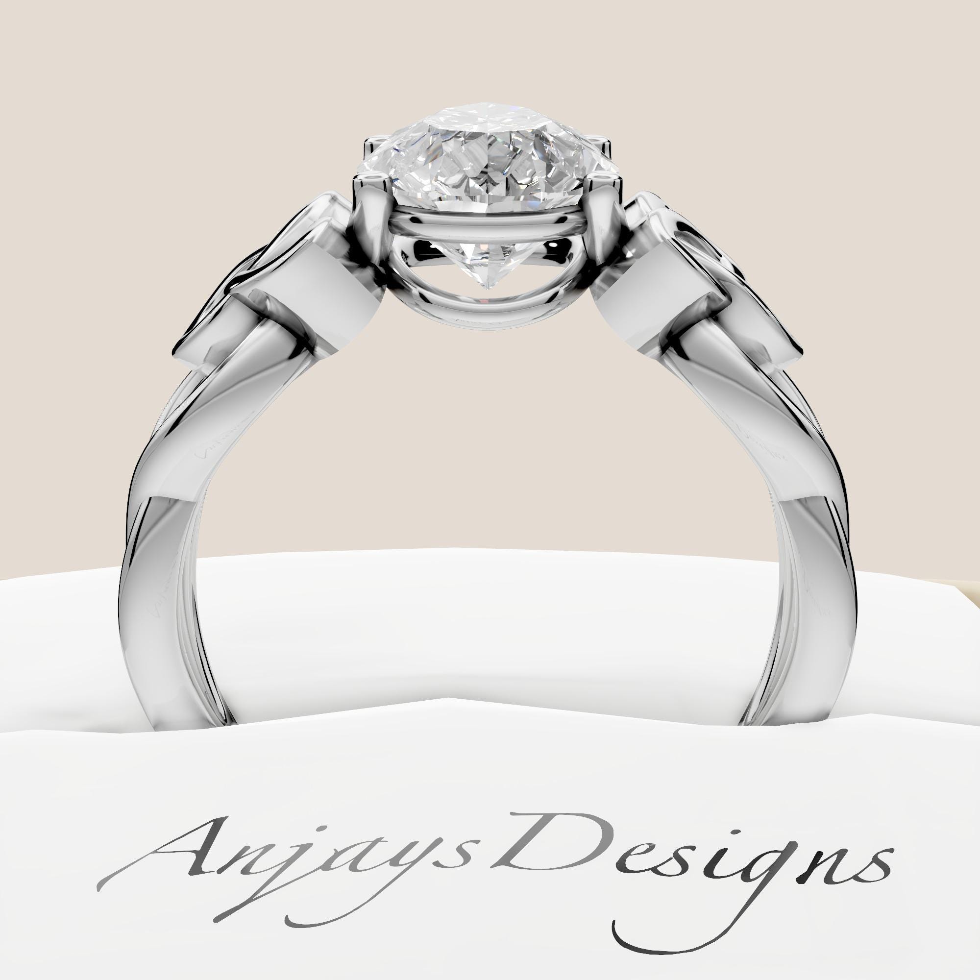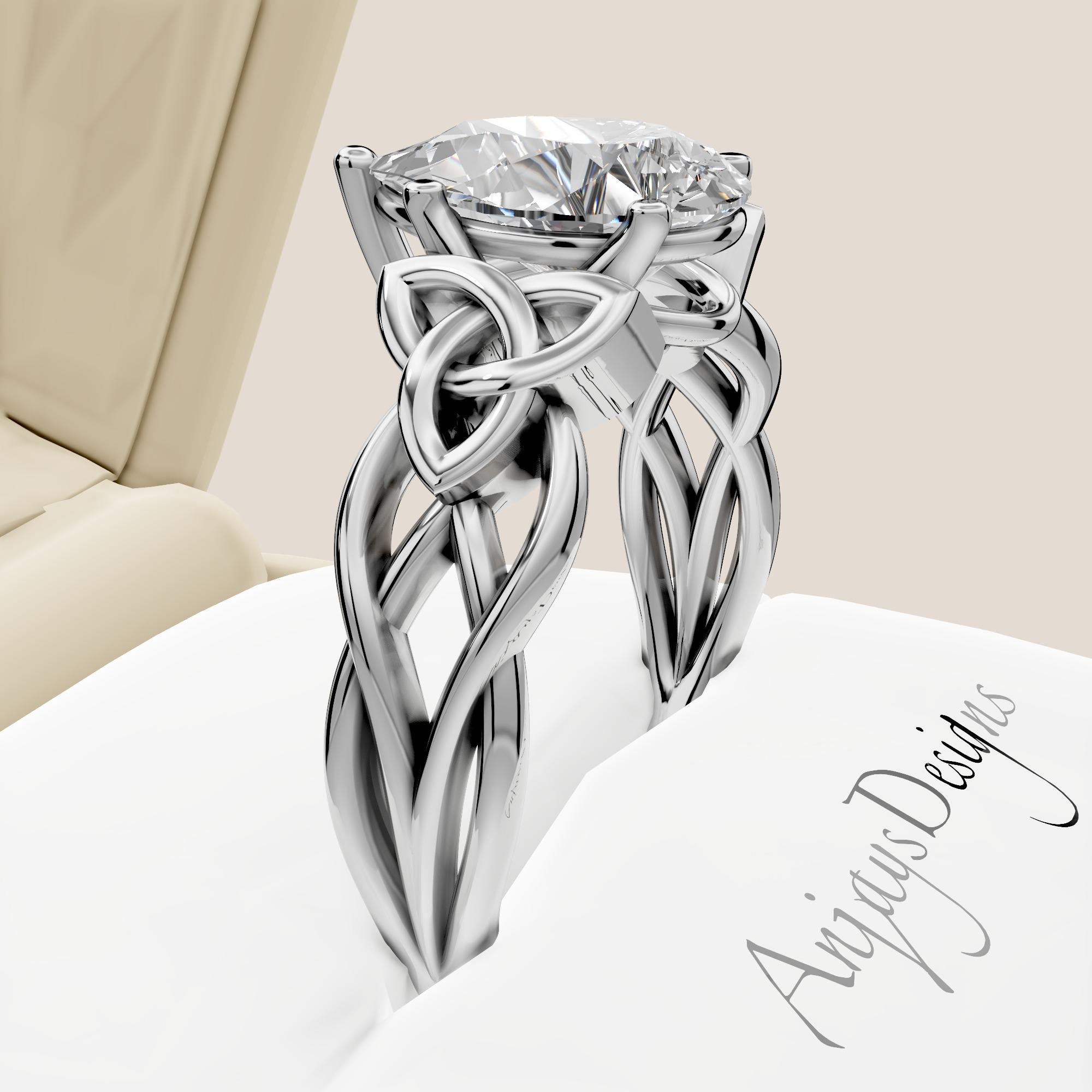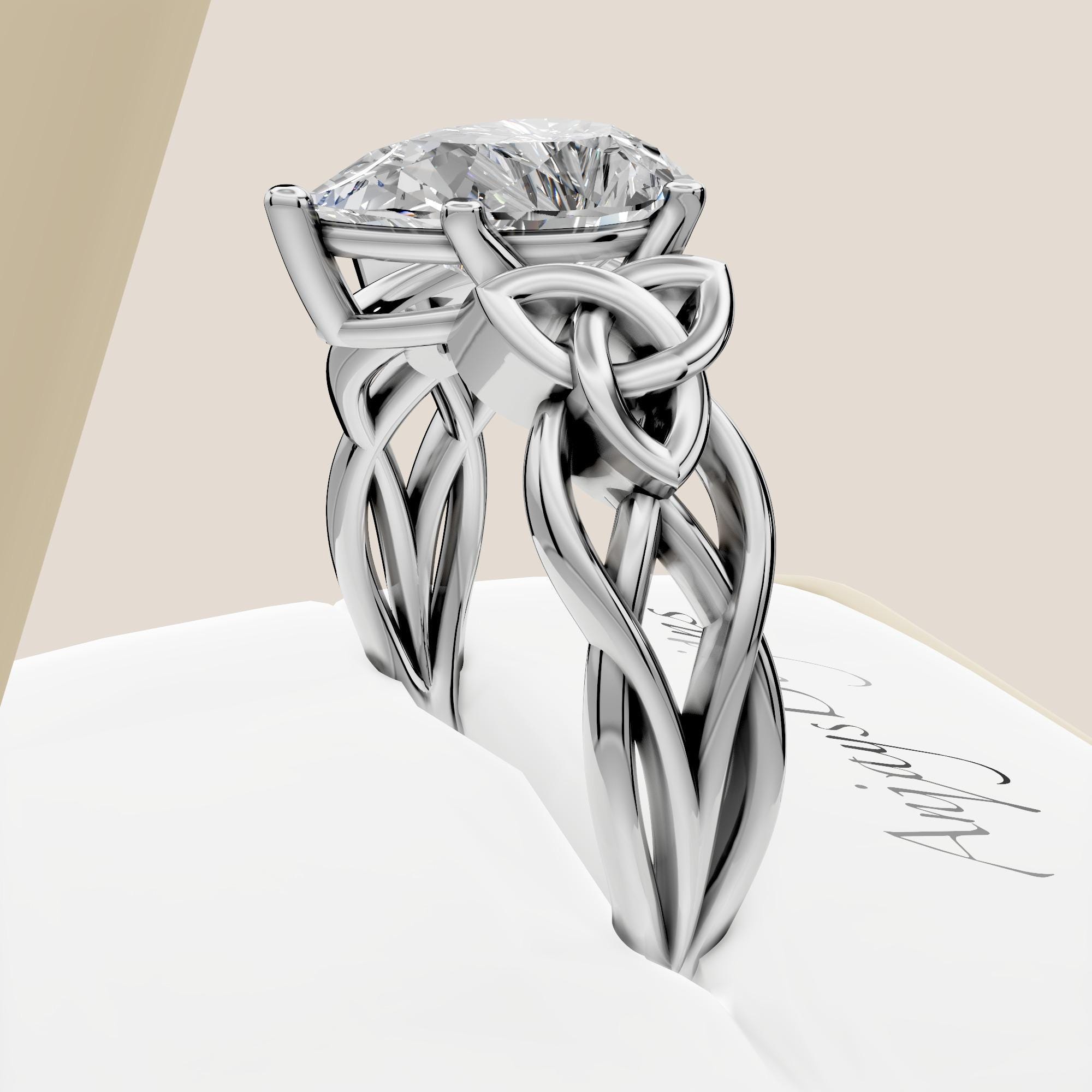 This Celtic knot engagement ring is crafted in solid 14k white gold and features a stunning 2 carat pear shaped lab grown diamond set in a timeless solitaire design! The entwined love knot designs add symbolic meaning, representing unity, eternity, and enduring love. The pear cut diamond offers classic sparkle and brilliance, providing the same beauty and durability as a mined diamond. This Celtic wedding ring makes a meaningful choice for a unique engagement or special occasion!