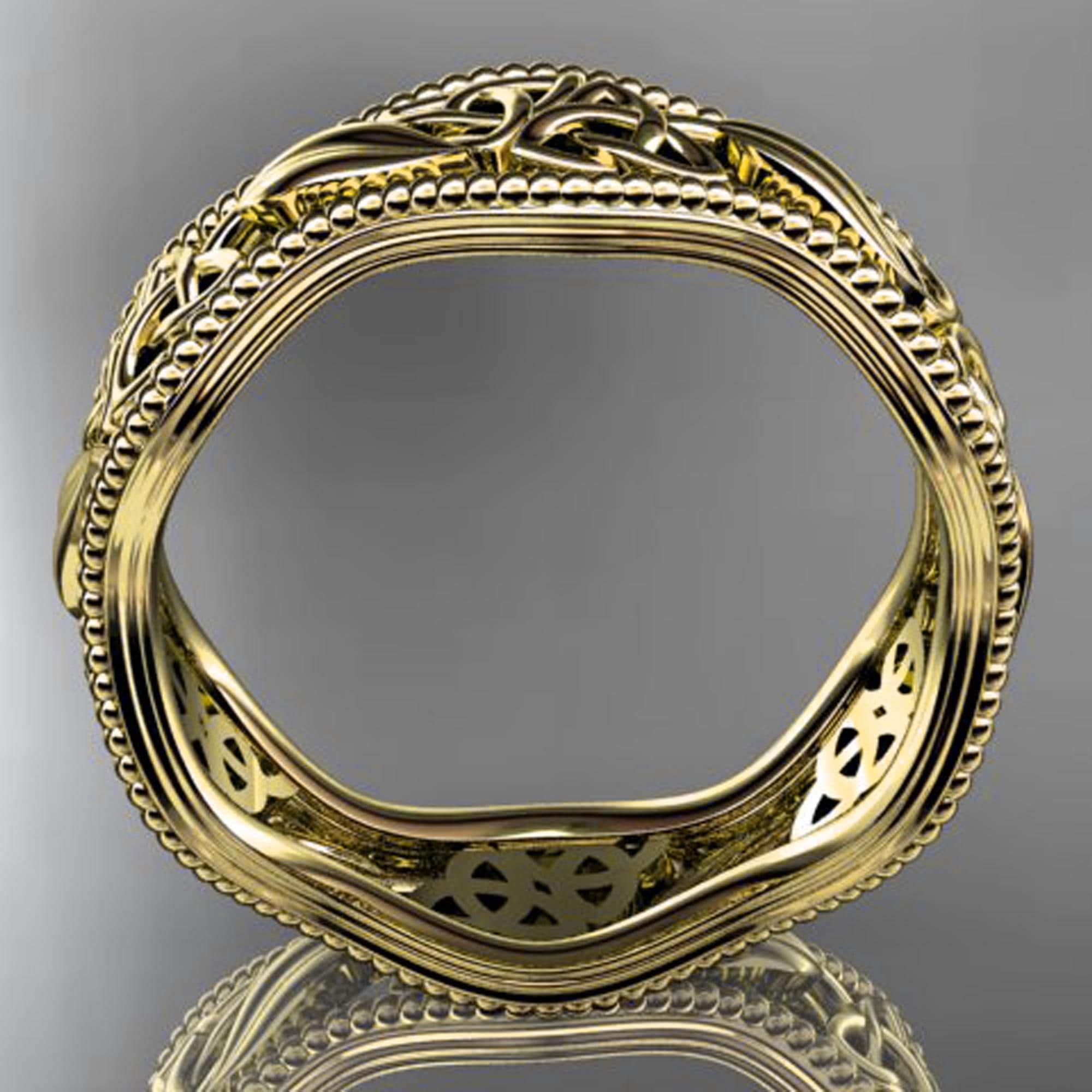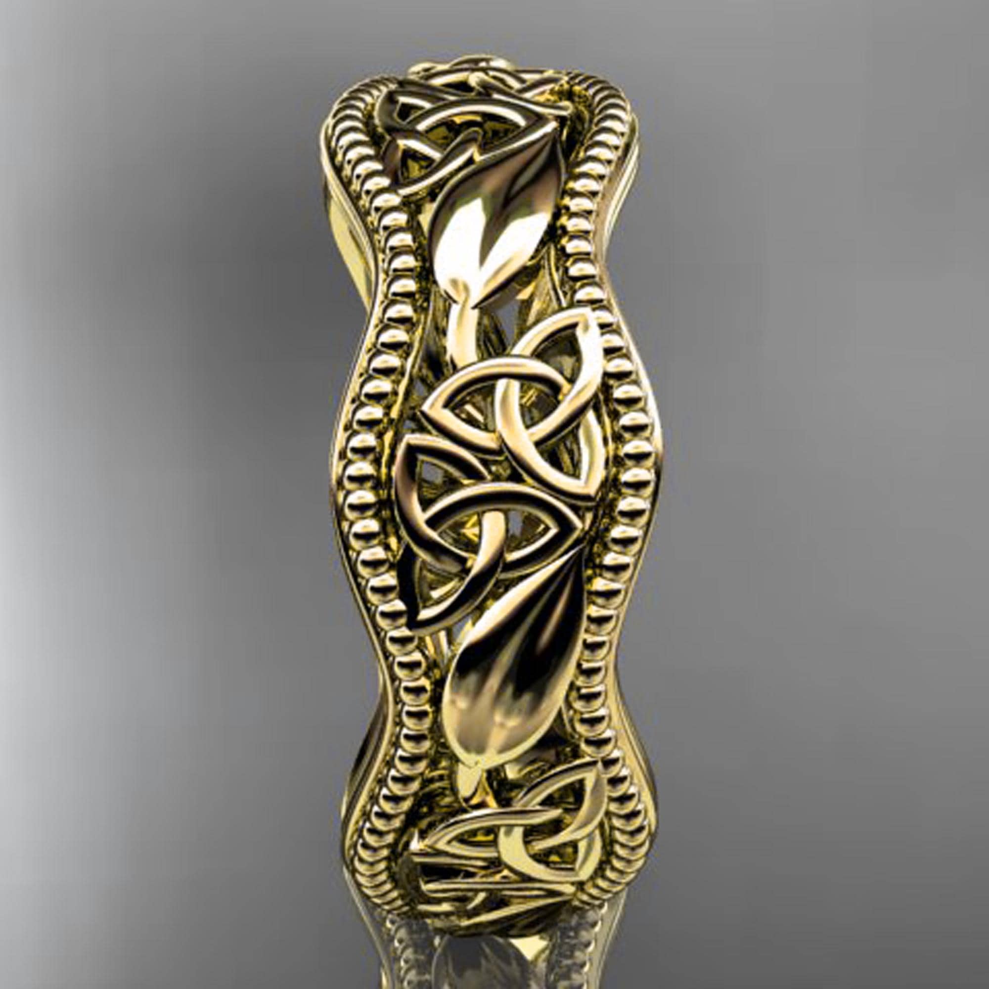 This unique Celtic wedding ring is crafted in solid 14k gold and features timeless trinity love knots around the band with a touch of nature inspired beauty! The intricate knotwork represents unity, eternity, and everlasting love, making this ring a meaningful choice for a wedding band or special promise ring.