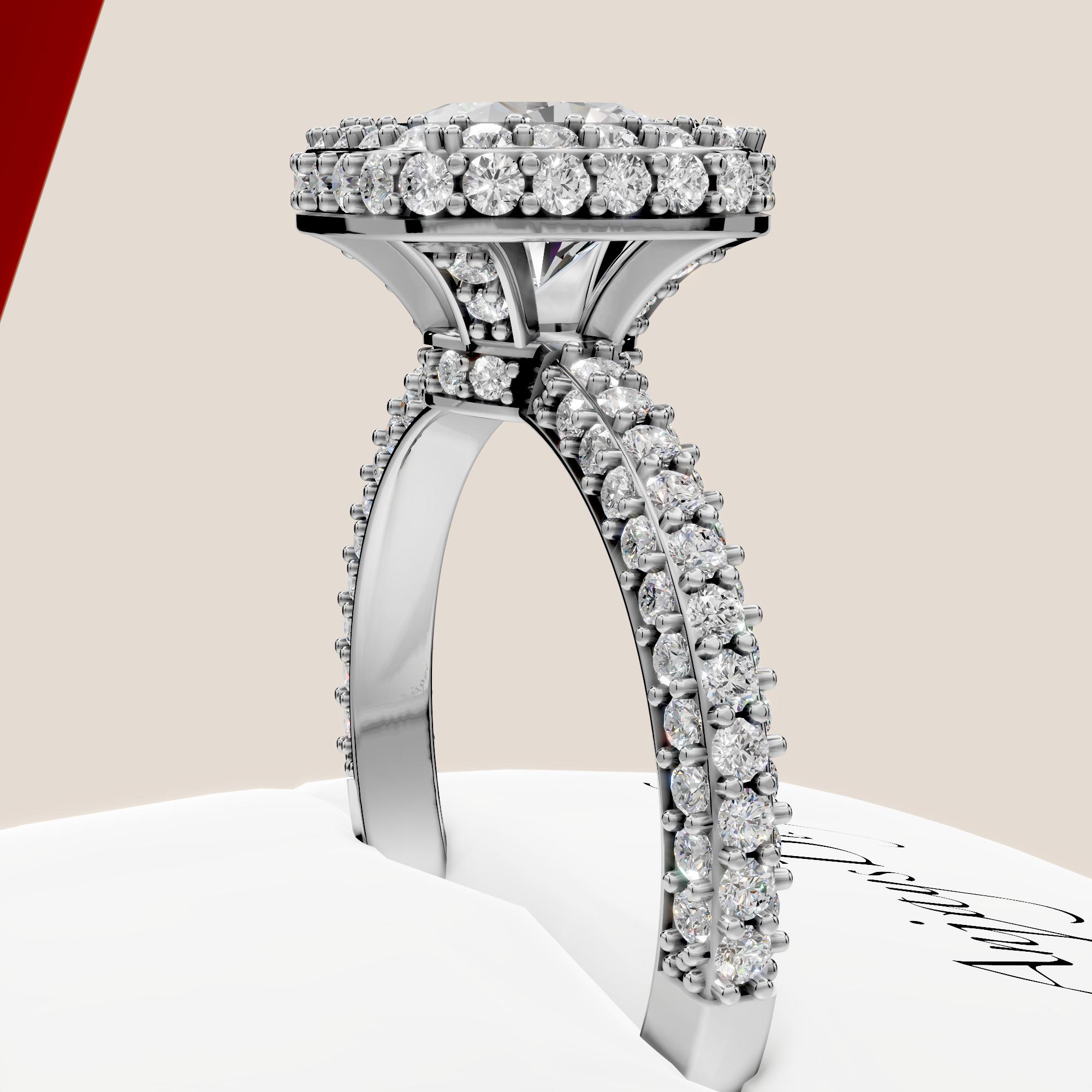 Celebrate your love with this 1.5 carat cushion cut lab grown diamond engagement ring, crafted to perfection in solid 14k white gold. The soft, romantic cushion shape sparkles brilliantly, while the hidden halo adds extra shimmer and a touch of surprise sparkle from every angle!