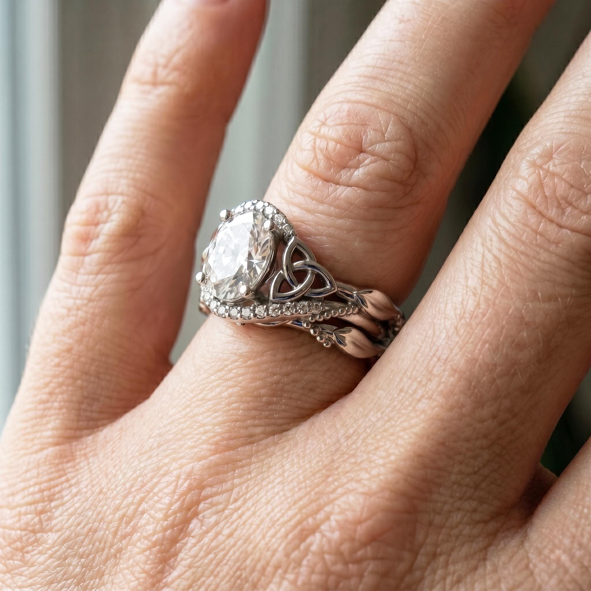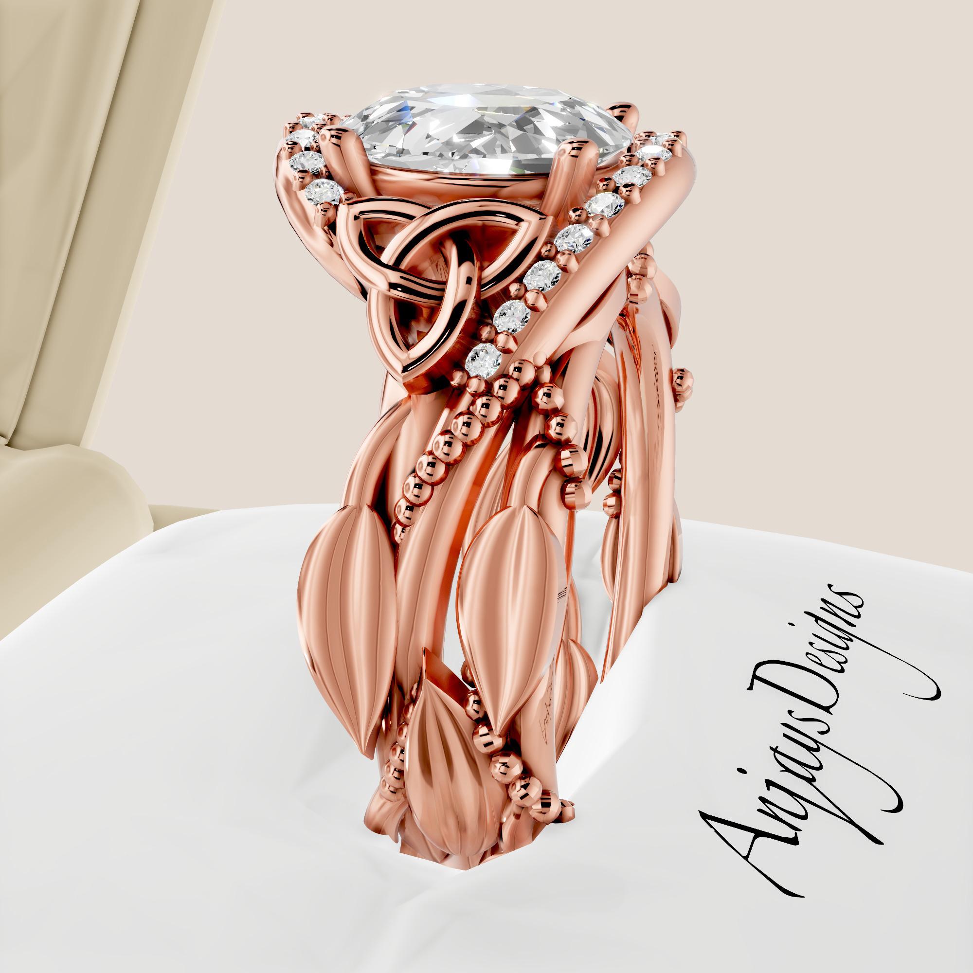 This Celtic knot diamond engagement ring wedding set is designed with timeless symbolism and unique nature inspired designs! The 2ct oval cut lab grown diamond center stone is complemented by intricate Celtic trinity knots that represent unity, eternity, and everlasting love. Paired with a matching wedding band, this unique wedding ring set creates a beautifully coordinated bridal look!