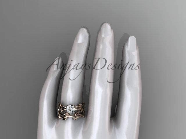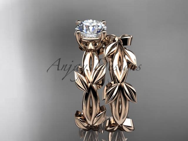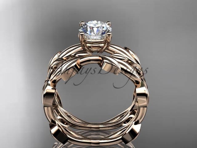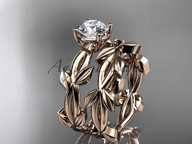 This nature inspired engagement ring set is crafted in solid 14k rose gold and features a brilliant 1 carat lab grown diamond as the centerpiece. The design is inspired by organic elements, with soft flowing details that create a romantic and elegant look. The matching wedding band completes the set, designed to sit perfectly alongside the engagement ring.