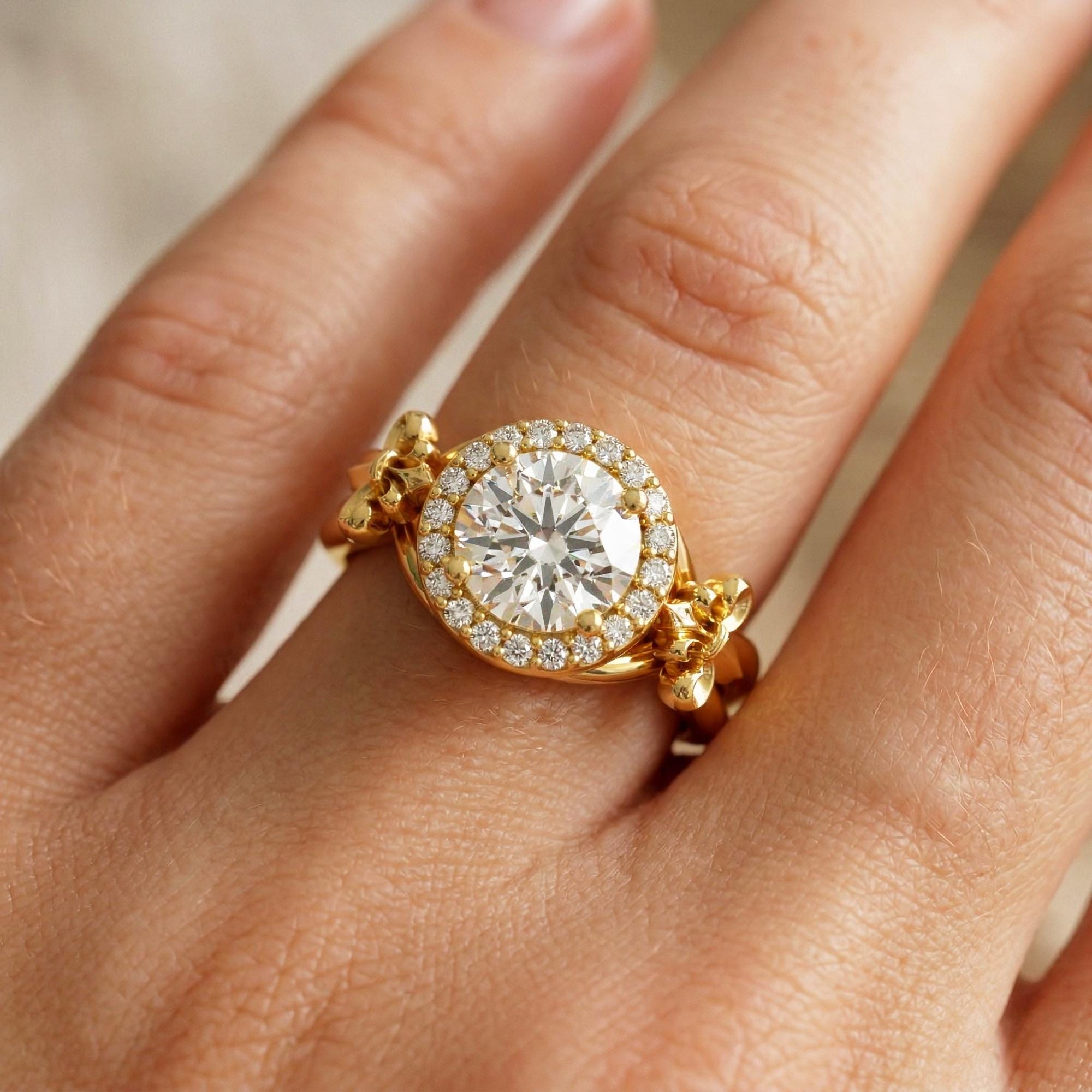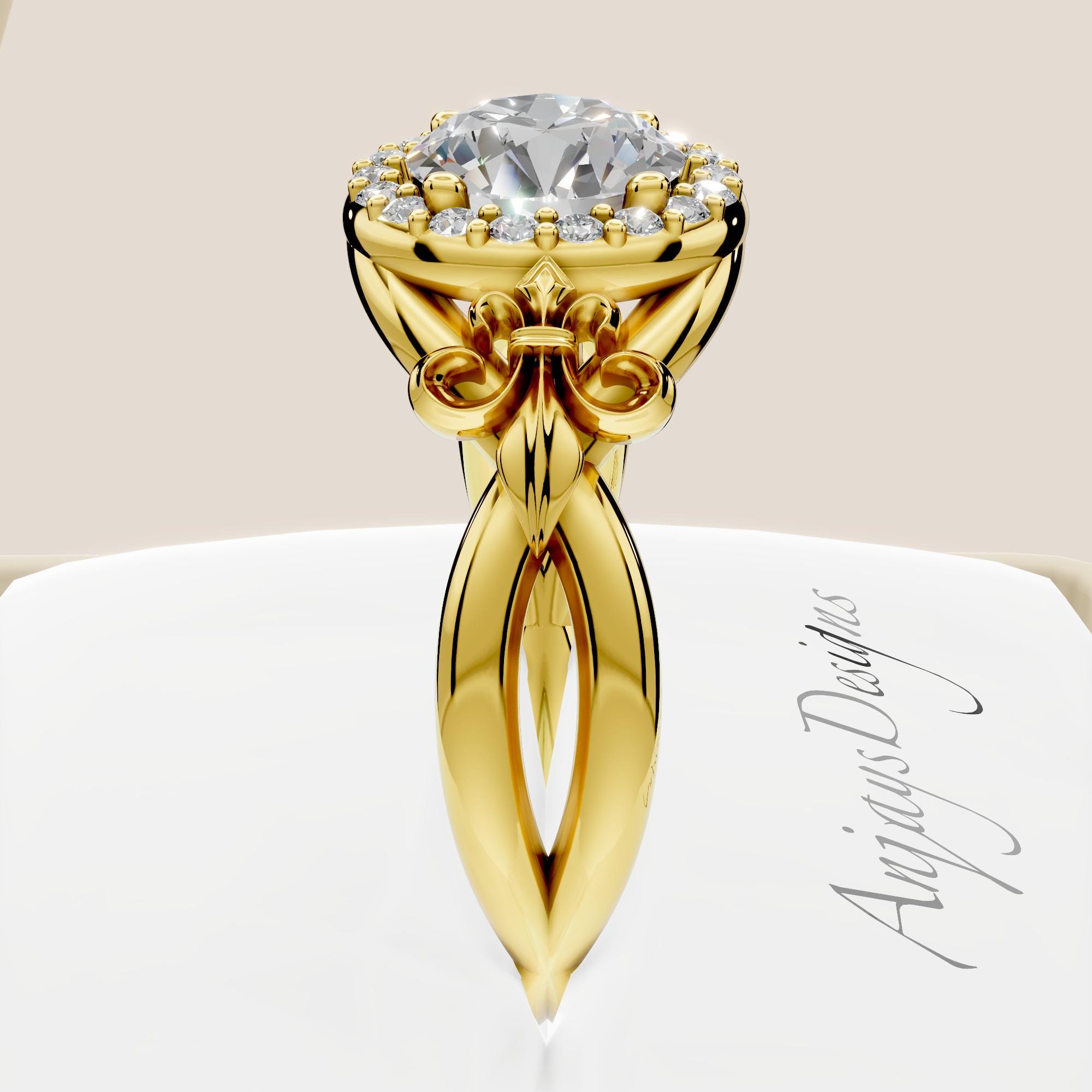 This Fleur de Lis engagement ring is crafted in solid 14k yellow gold and features a brilliant 1 carat round lab grown diamond at its center! The elegant Fleur de Lis design adds a touch of vintage inspired detail and symbolic meaning, representing strength, purity, and timeless beauty.
