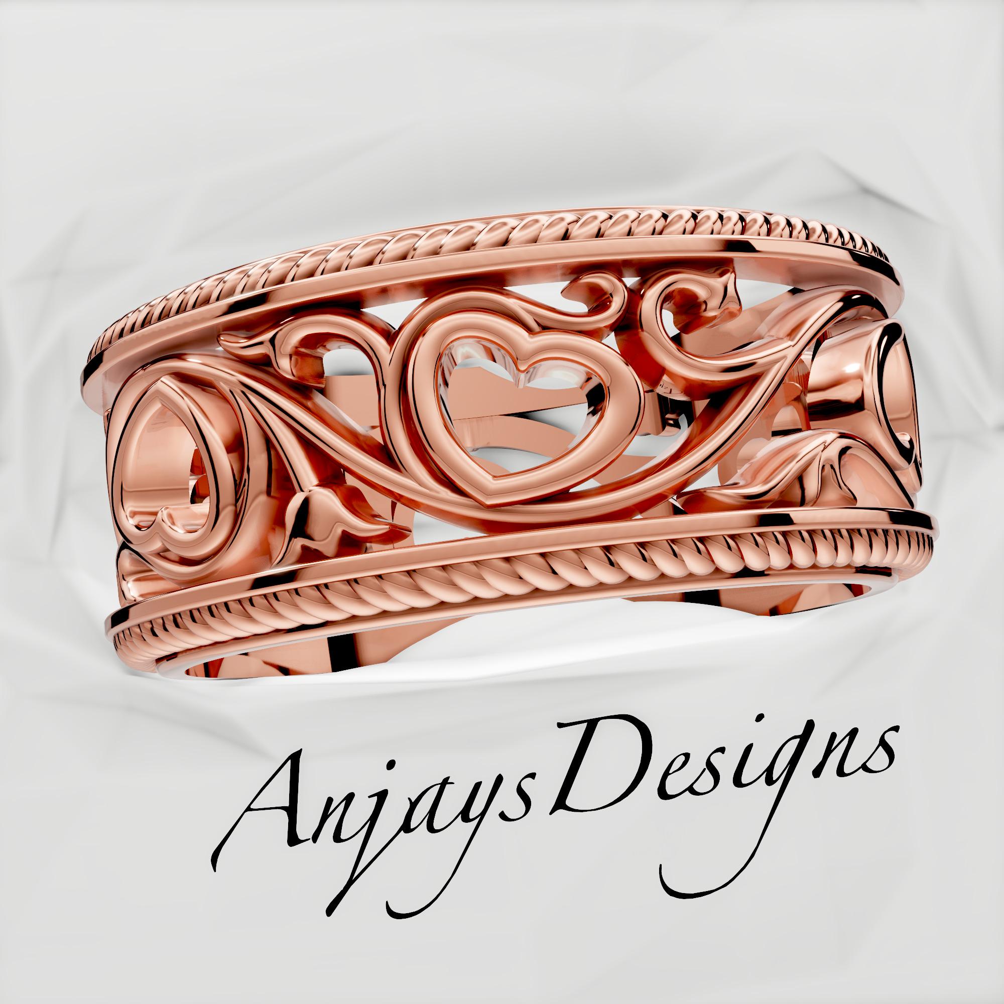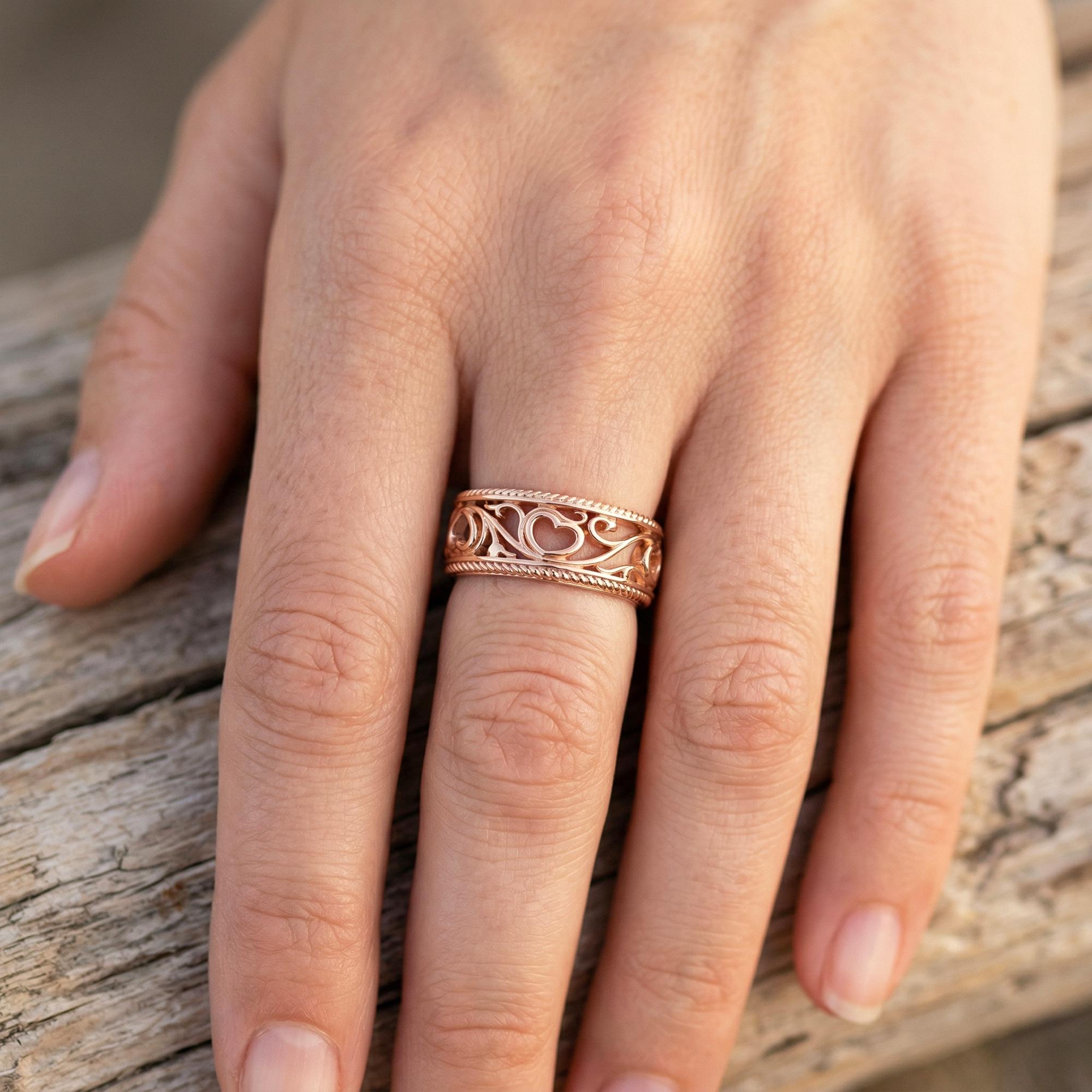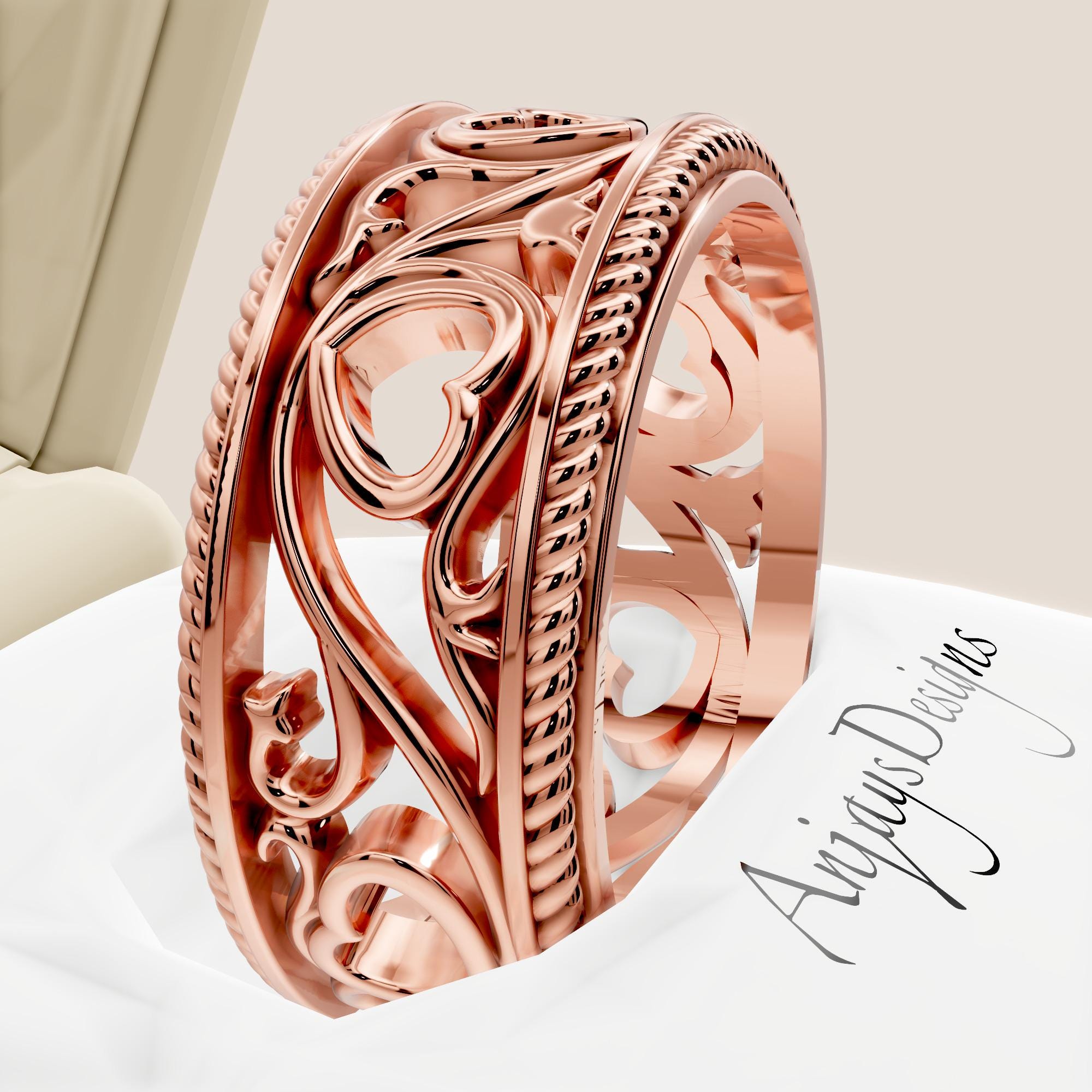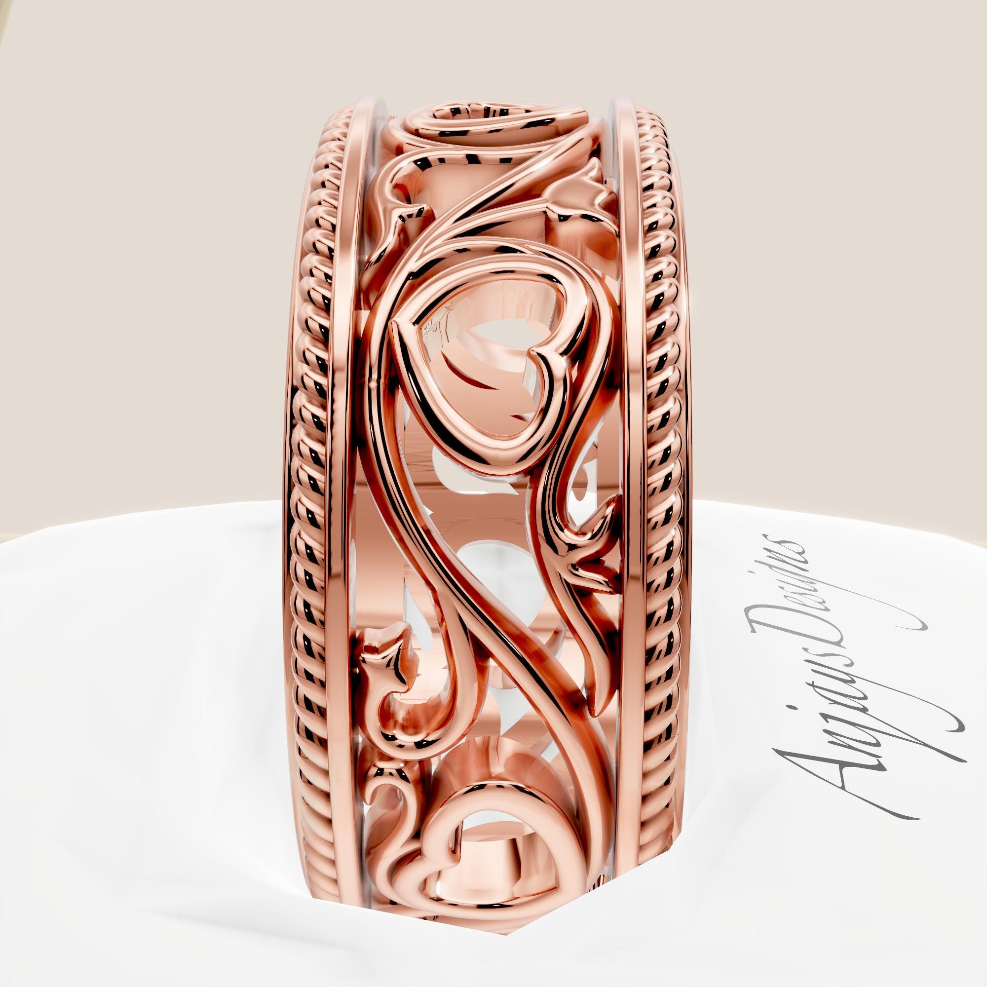 This nature inspired wedding band is crafted in solid 18k rose gold and features a delicate heart shaped design that symbolizes forever love and connection! The flowing, eternity pattern gives the ring a soft and romantic feel, making it a meaningful and elegant choice for an anniversary or wedding ring. Designed for comfort and everyday wear, this band blends simplicity with symbolic beauty!
