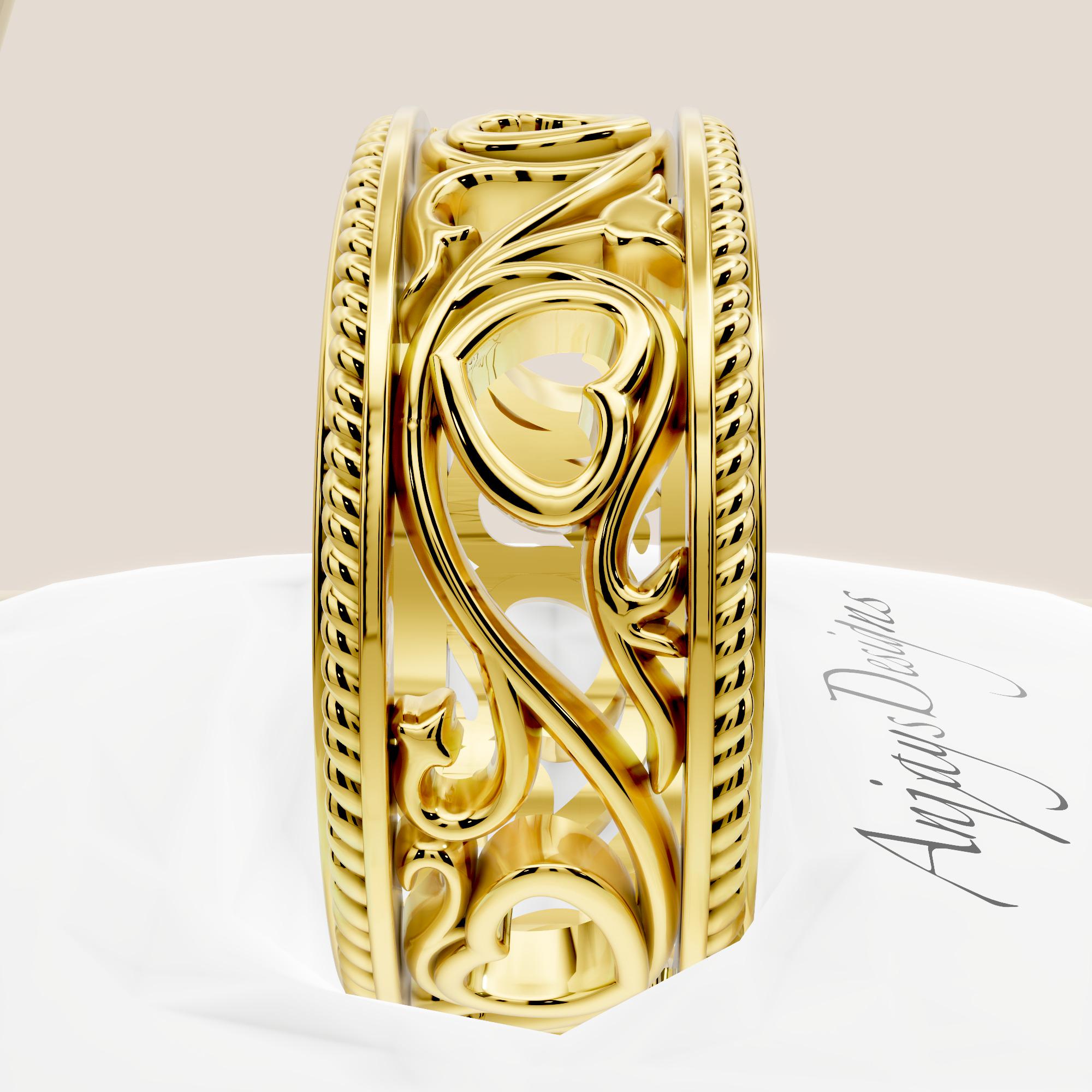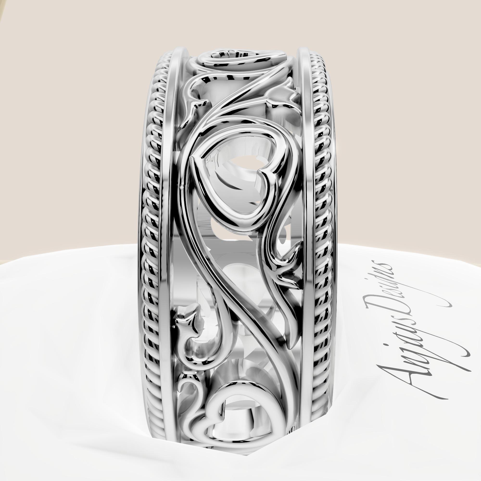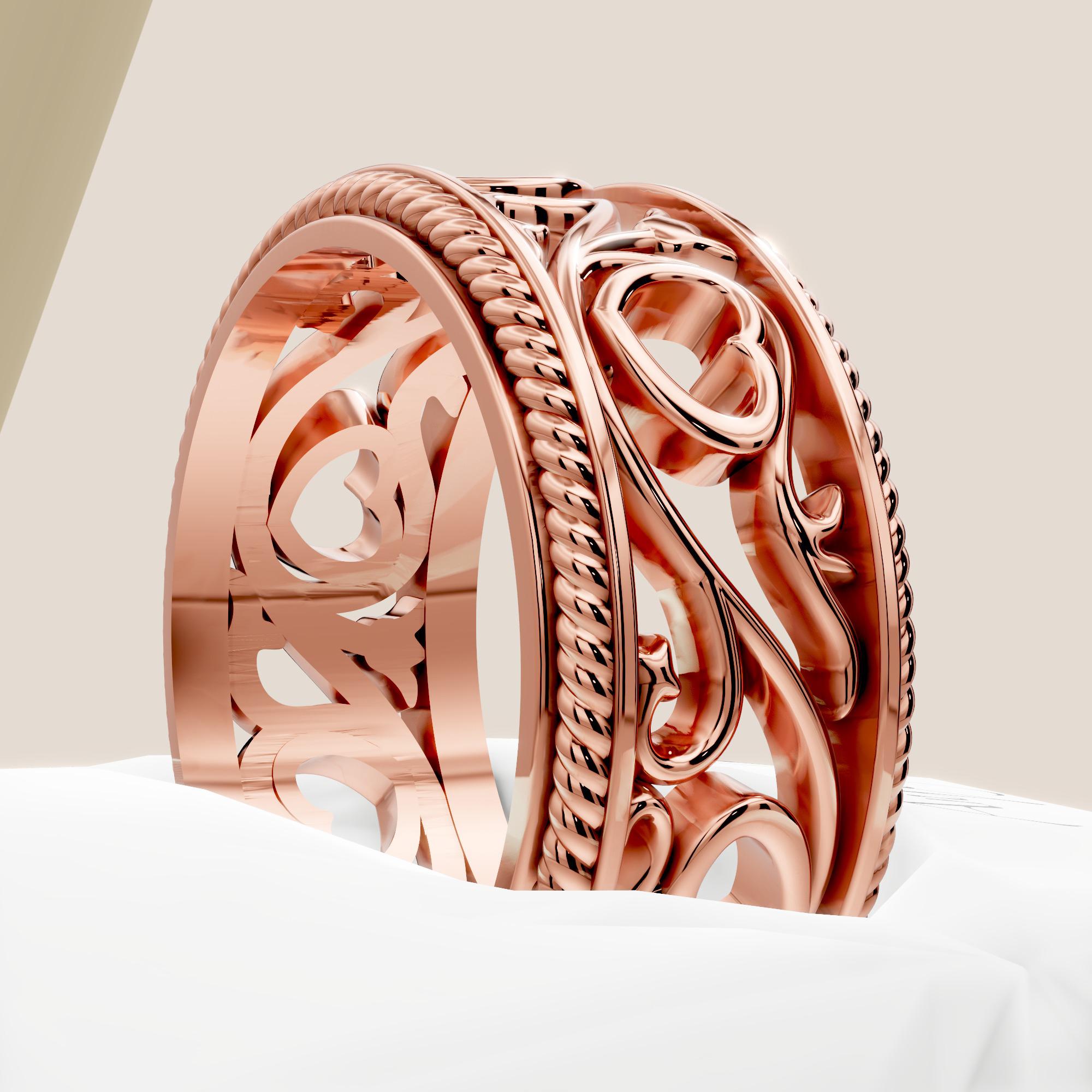 This nature inspired wedding band is crafted in solid 18k rose gold and features a delicate heart shaped design that symbolizes forever love and connection! The flowing, eternity pattern gives the ring a soft and romantic feel, making it a meaningful and elegant choice for an anniversary or wedding ring. Designed for comfort and everyday wear, this band blends simplicity with symbolic beauty!