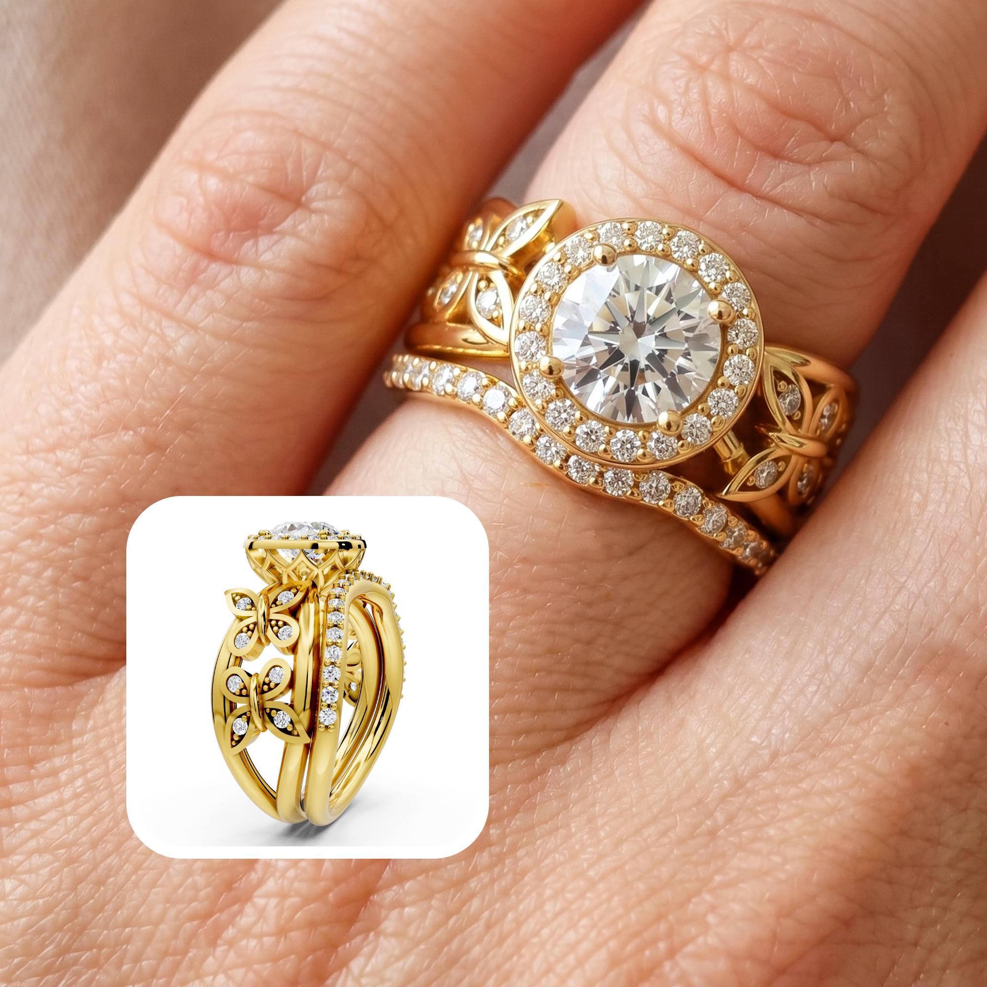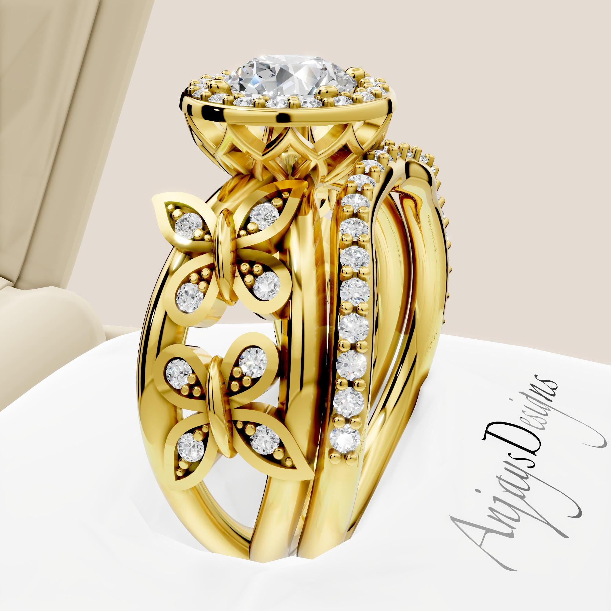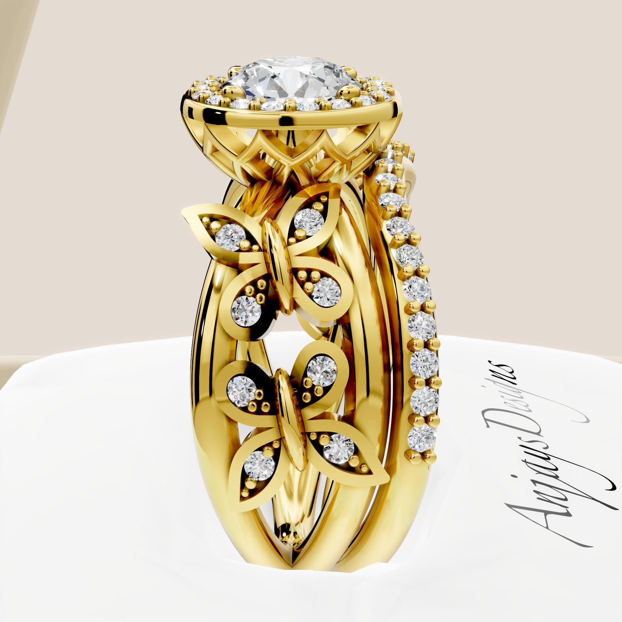 This nature inspired butterfly engagement ring wedding set is crafted in solid 18k yellow gold and features a brilliant 1 carat round lab grown diamond center stone! The butterfly inspired design adds a soft, nature inspired touch, symbolizing transformation, beauty, and new beginnings. Paired with a matching diamond wedding band, this set creates a unique bridal ring set!