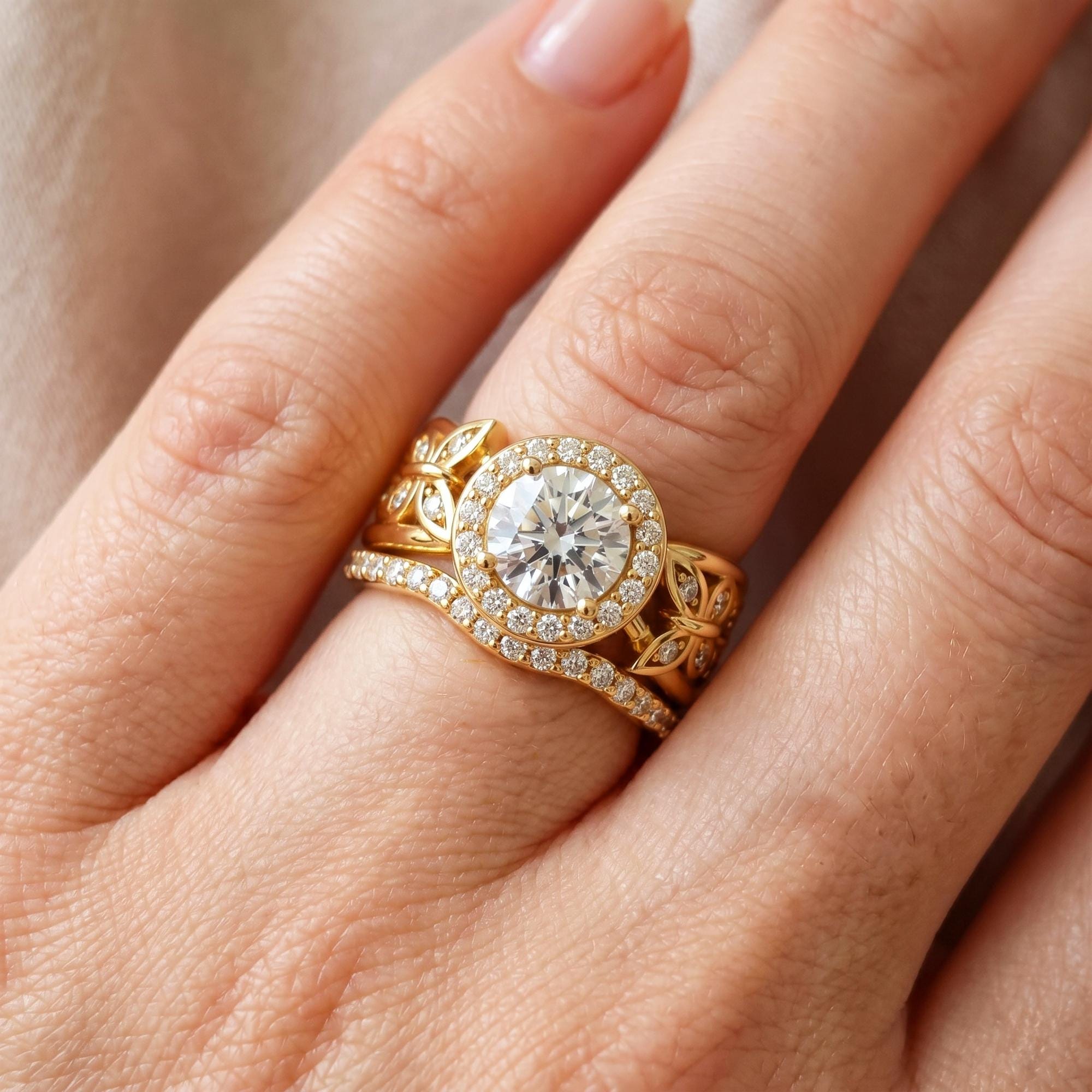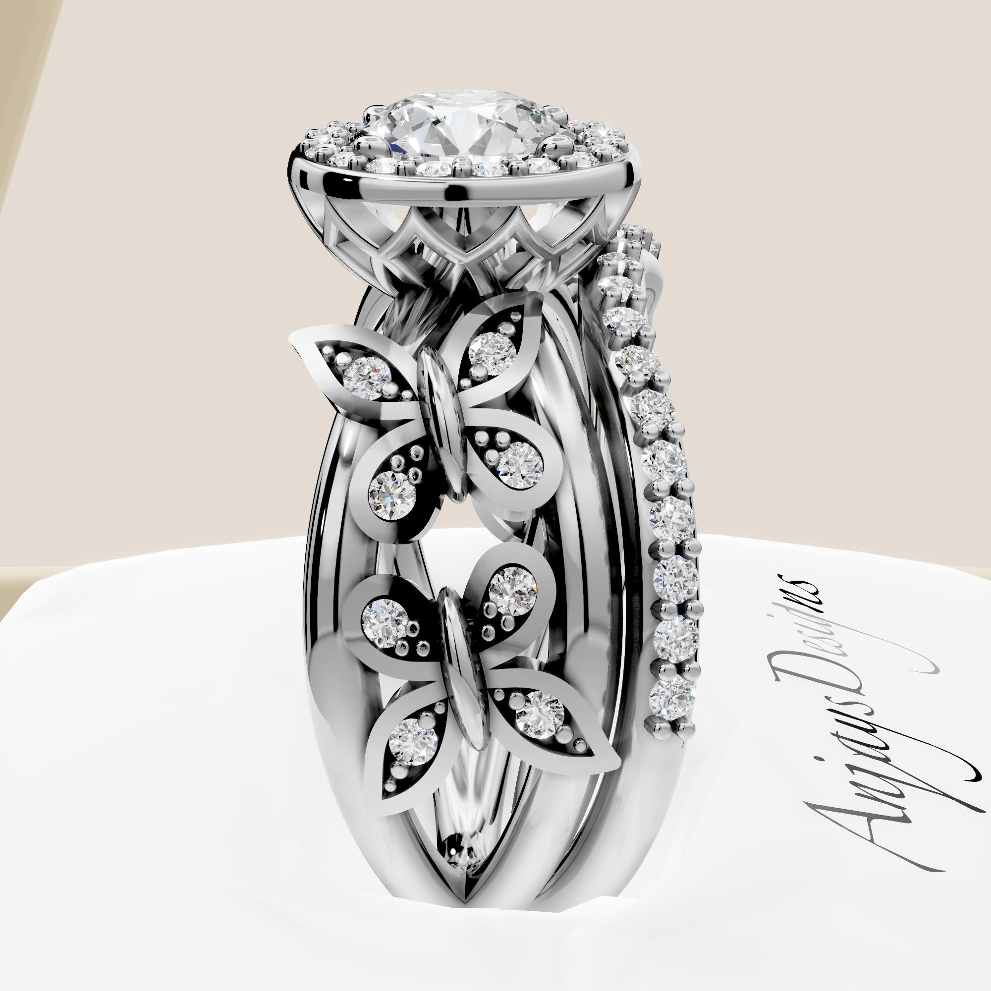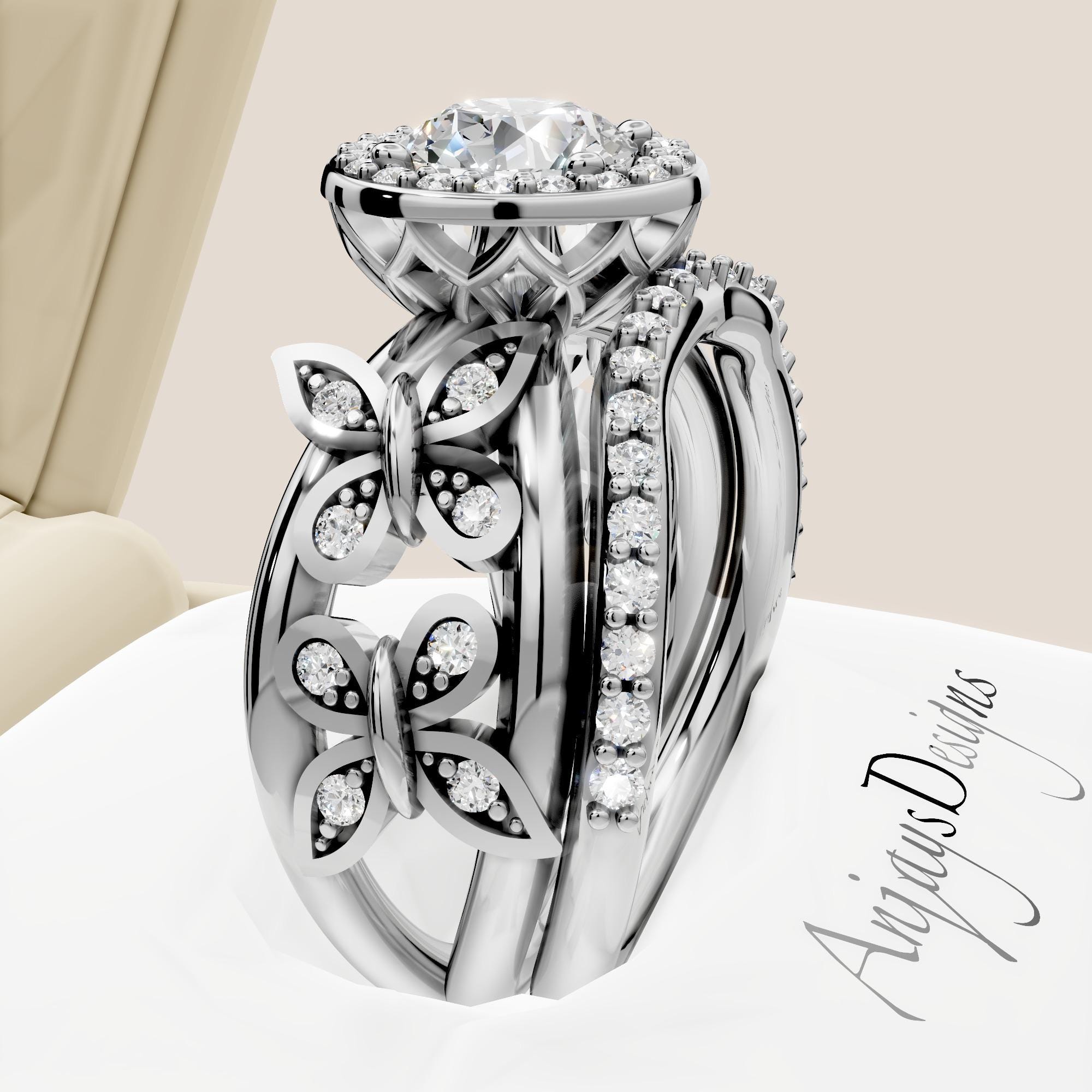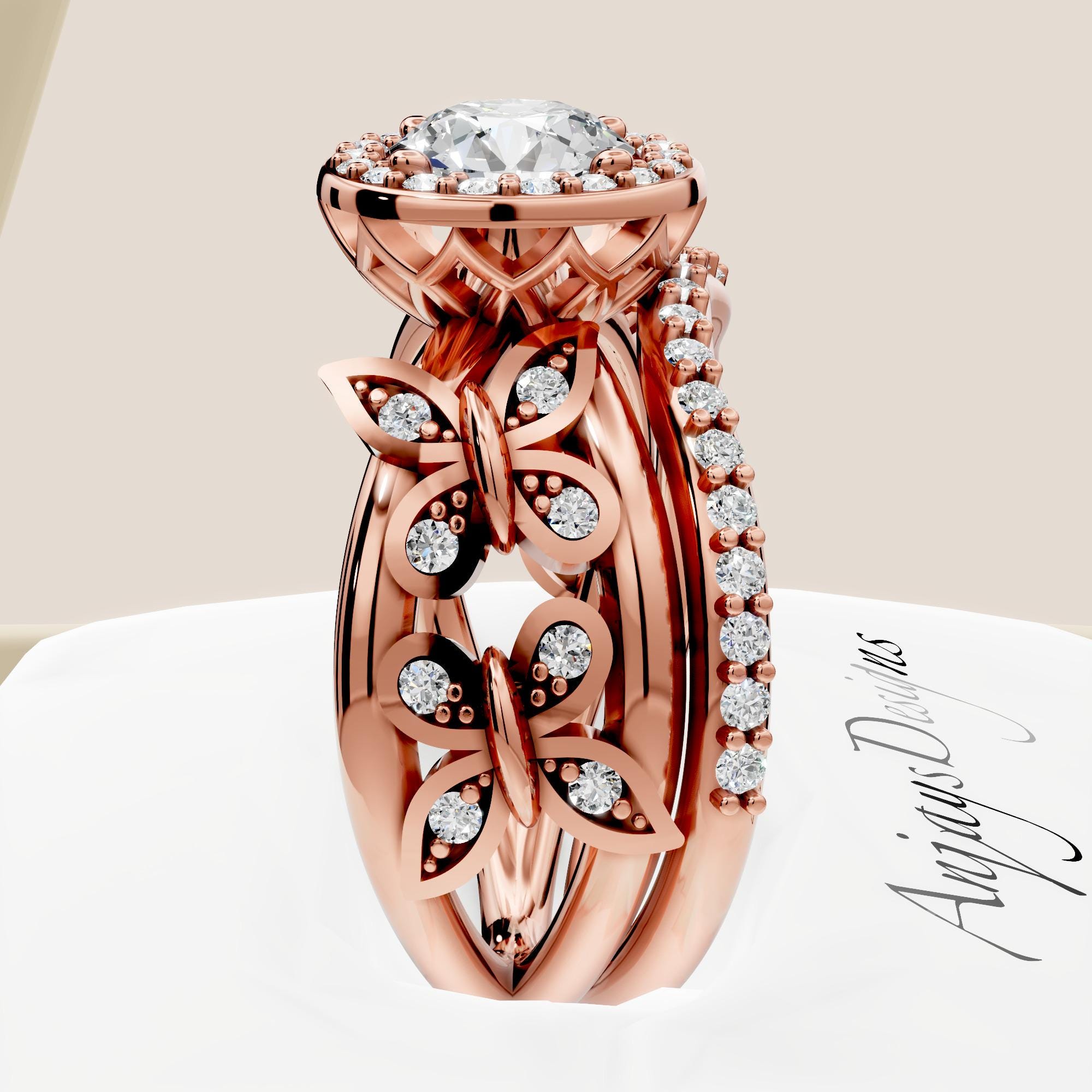 This nature inspired butterfly engagement ring wedding set is crafted in solid 18k yellow gold and features a brilliant 1 carat round lab grown diamond center stone! The butterfly inspired design adds a soft, nature inspired touch, symbolizing transformation, beauty, and new beginnings. Paired with a matching diamond wedding band, this set creates a unique bridal ring set!