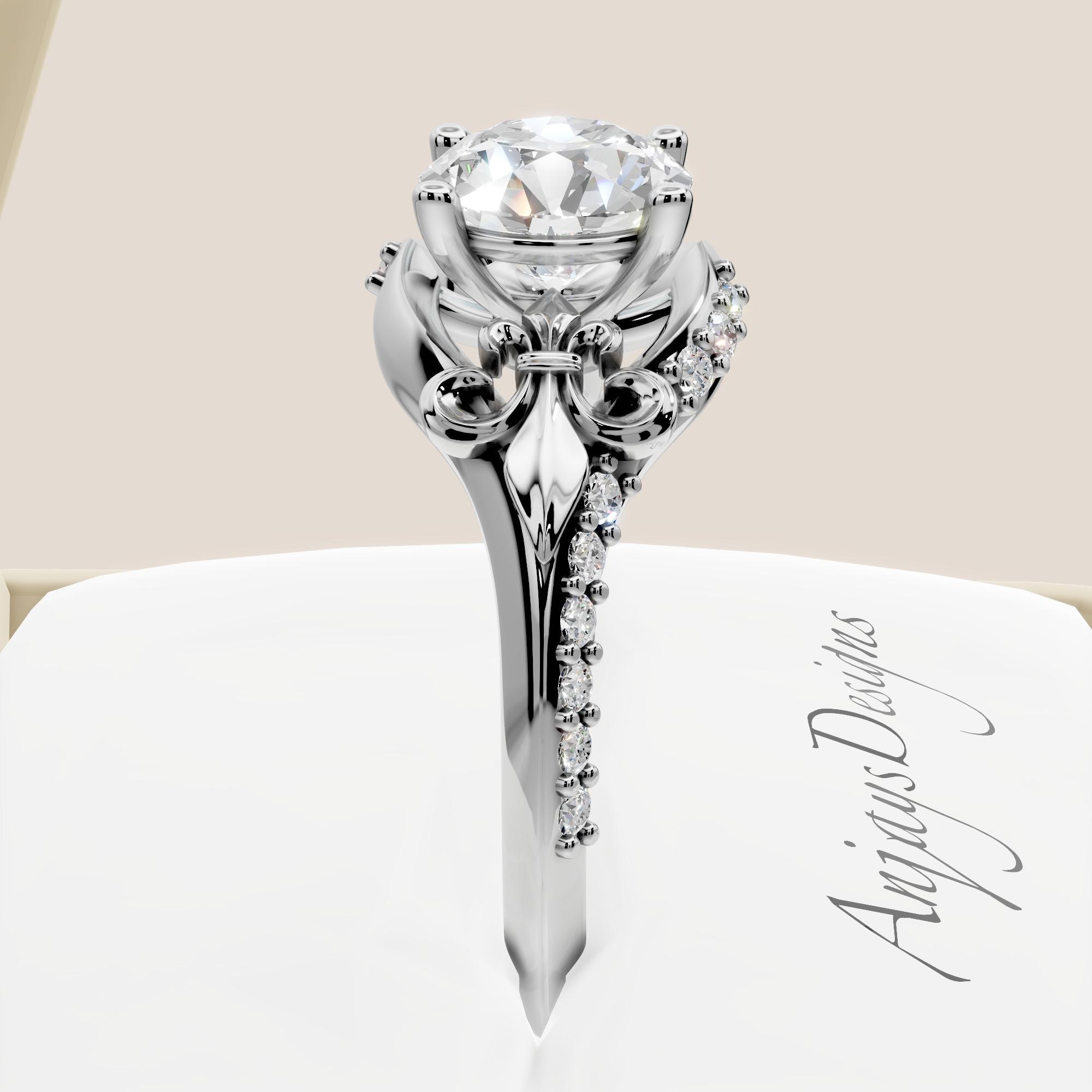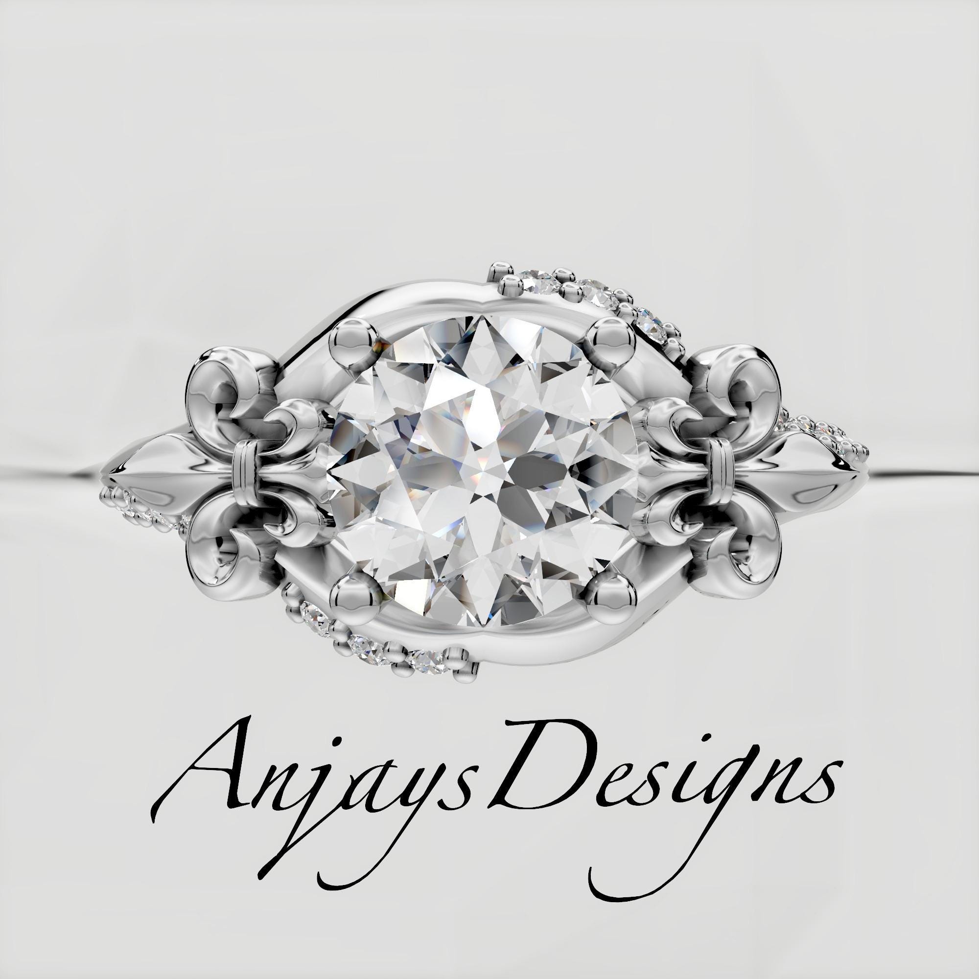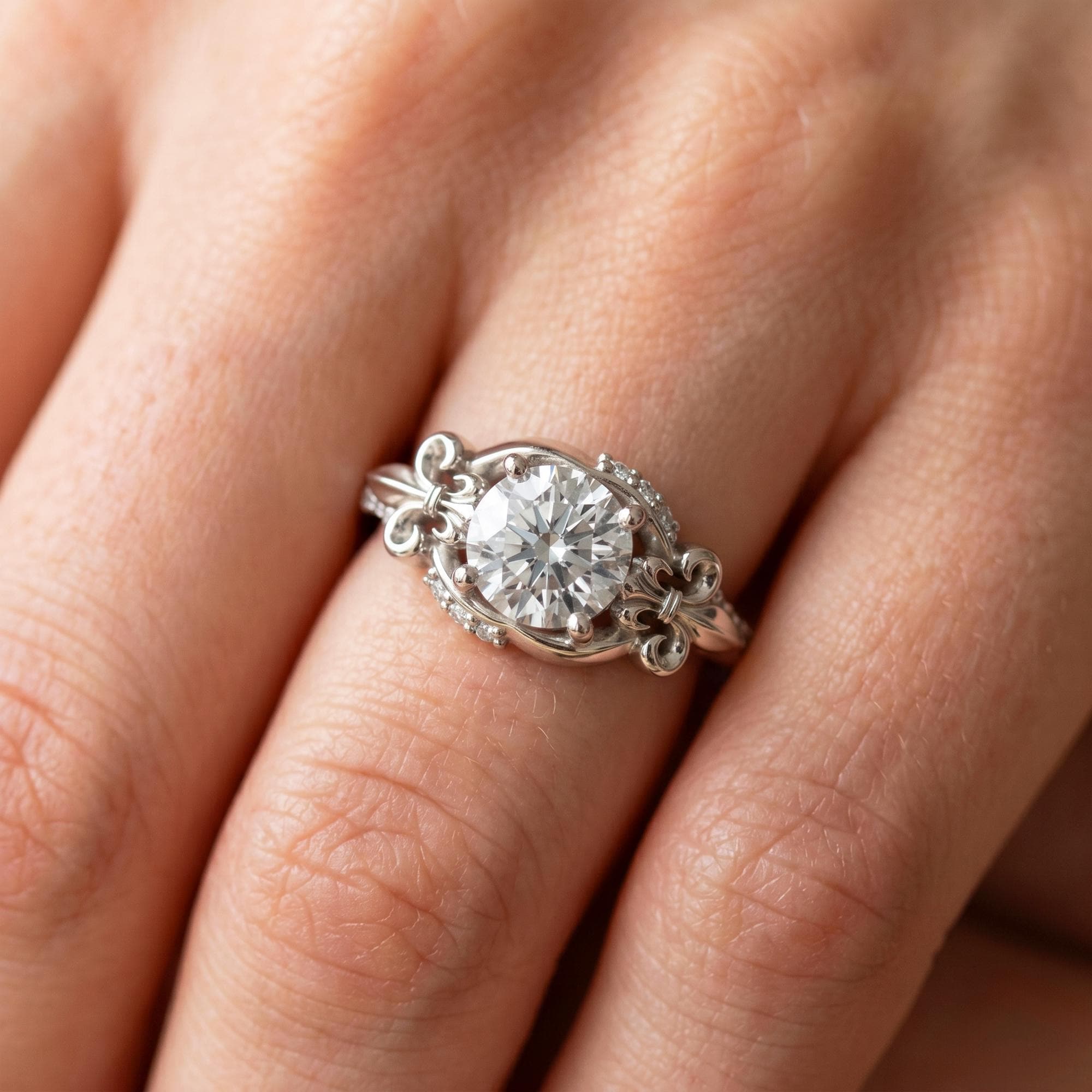 This Fleur de Lis engagement ring is crafted in solid 14k white gold and features a brilliant 1 carat round lab grown diamond at its center! The unique Fleur de Lis design adds a timeless, vintage inspired touch while symbolizing strength, purity, and enduring beauty. Set in polished 14k white gold, this ring combines symbolism with glistening diamonds, making it a meaningful and unique wedding ring!