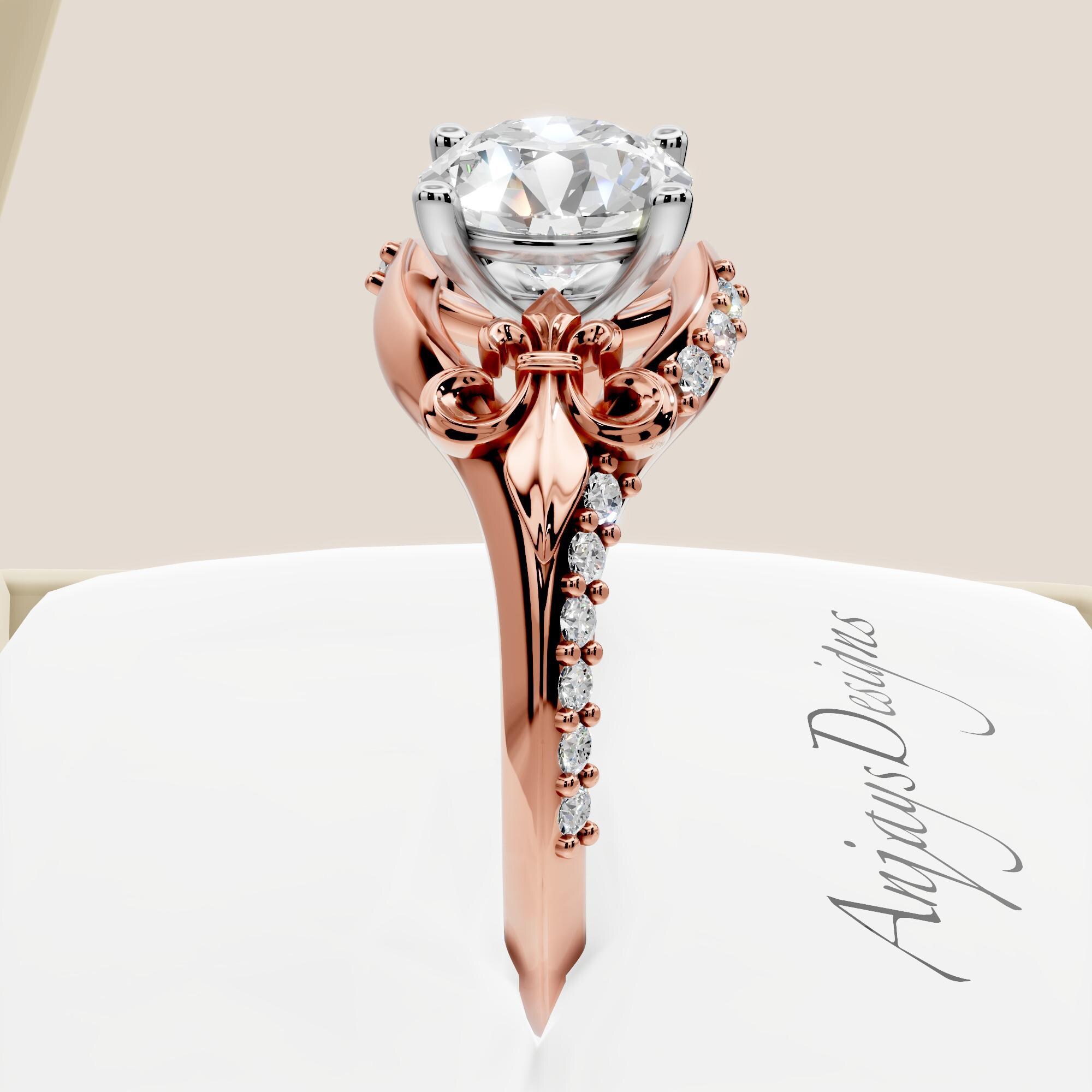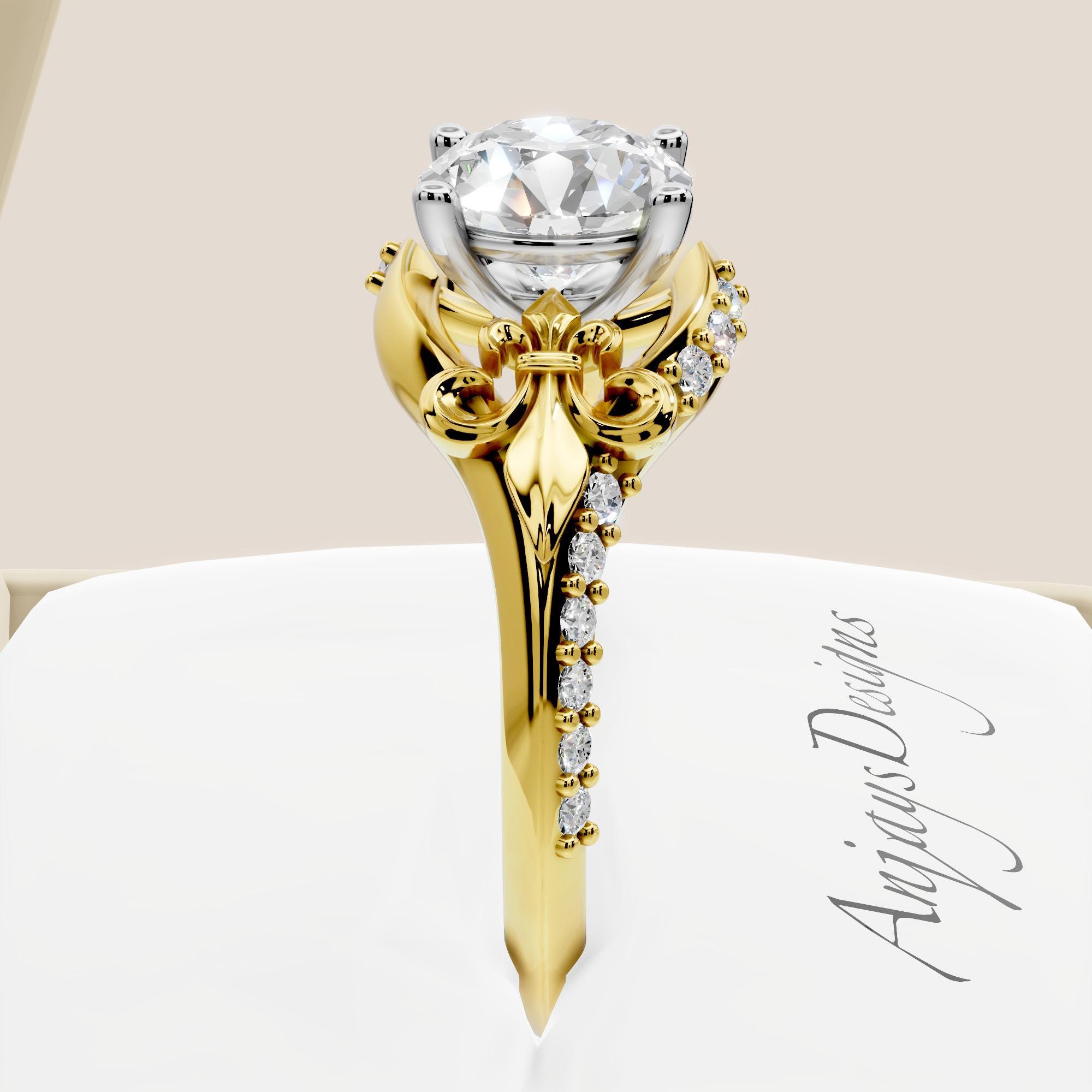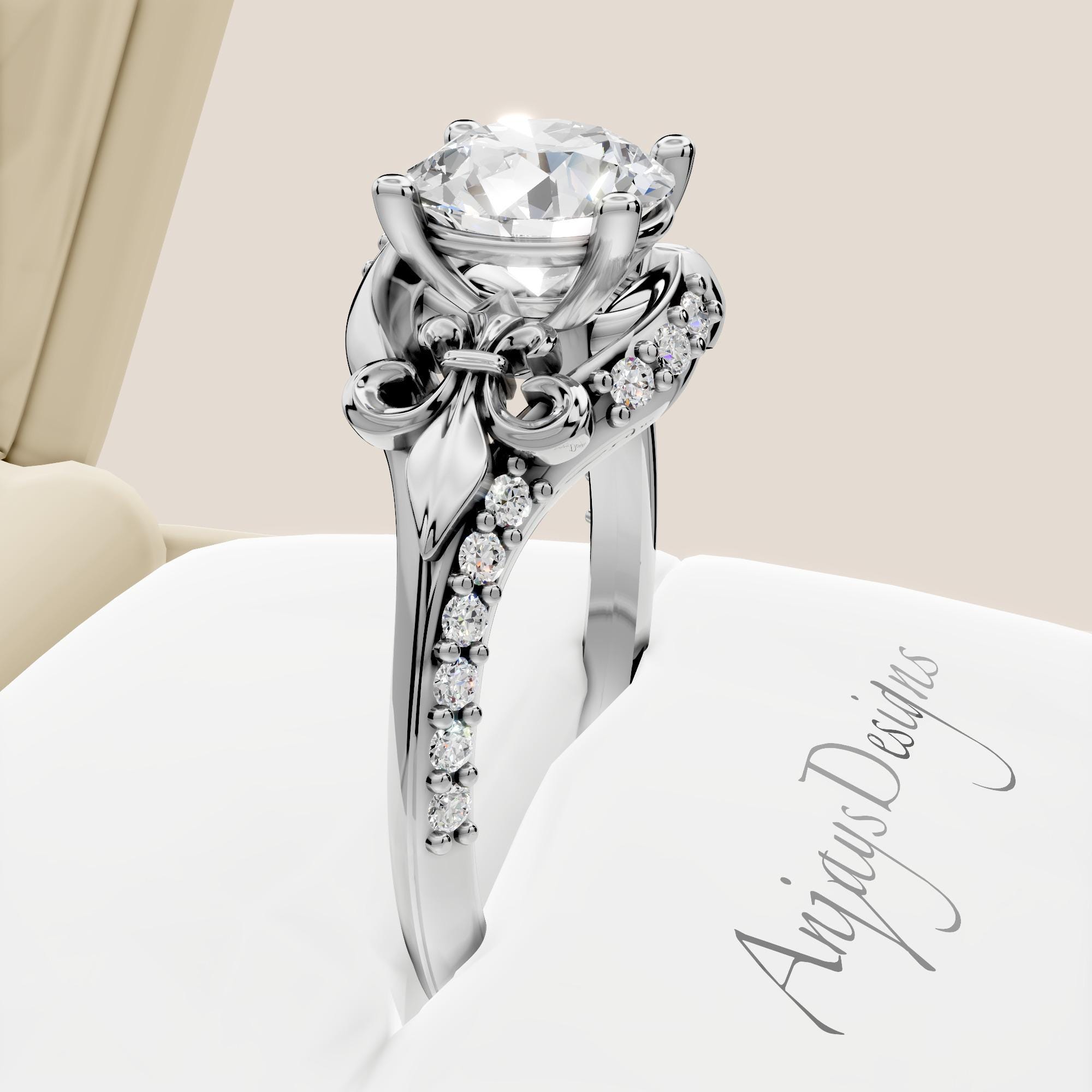 This Fleur de Lis engagement ring is crafted in solid 14k white gold and features a brilliant 1 carat round lab grown diamond at its center! The unique Fleur de Lis design adds a timeless, vintage inspired touch while symbolizing strength, purity, and enduring beauty. Set in polished 14k white gold, this ring combines symbolism with glistening diamonds, making it a meaningful and unique wedding ring!